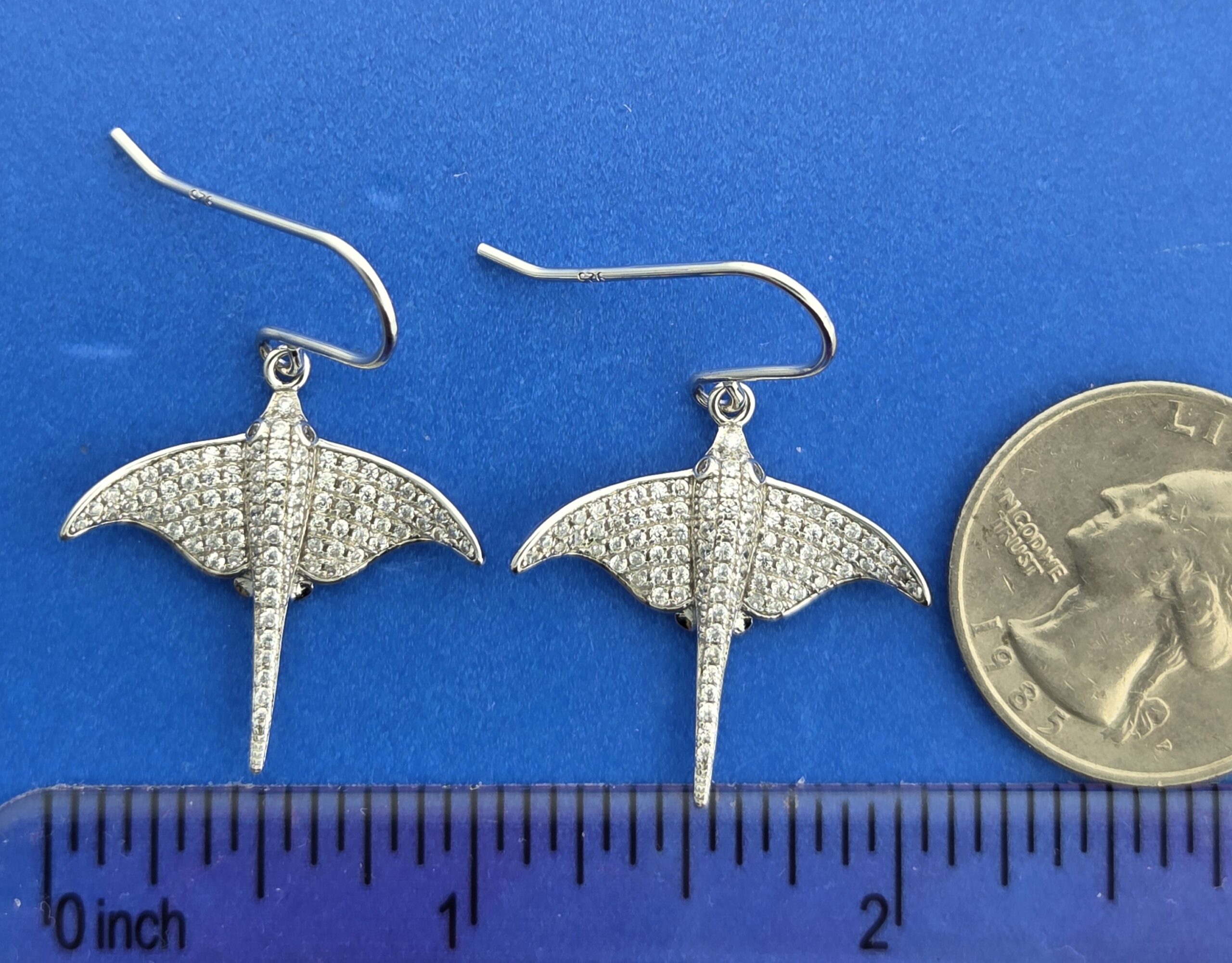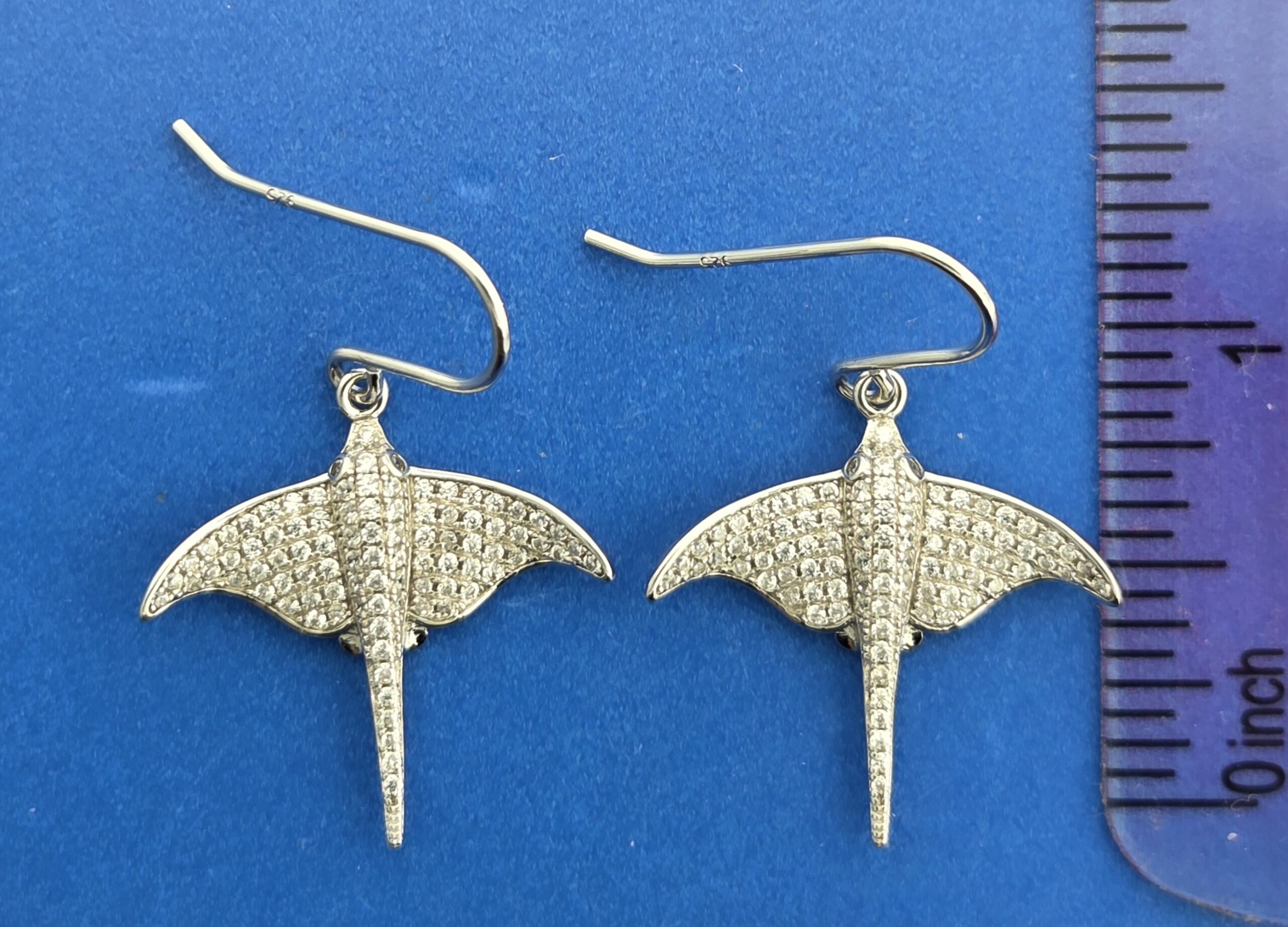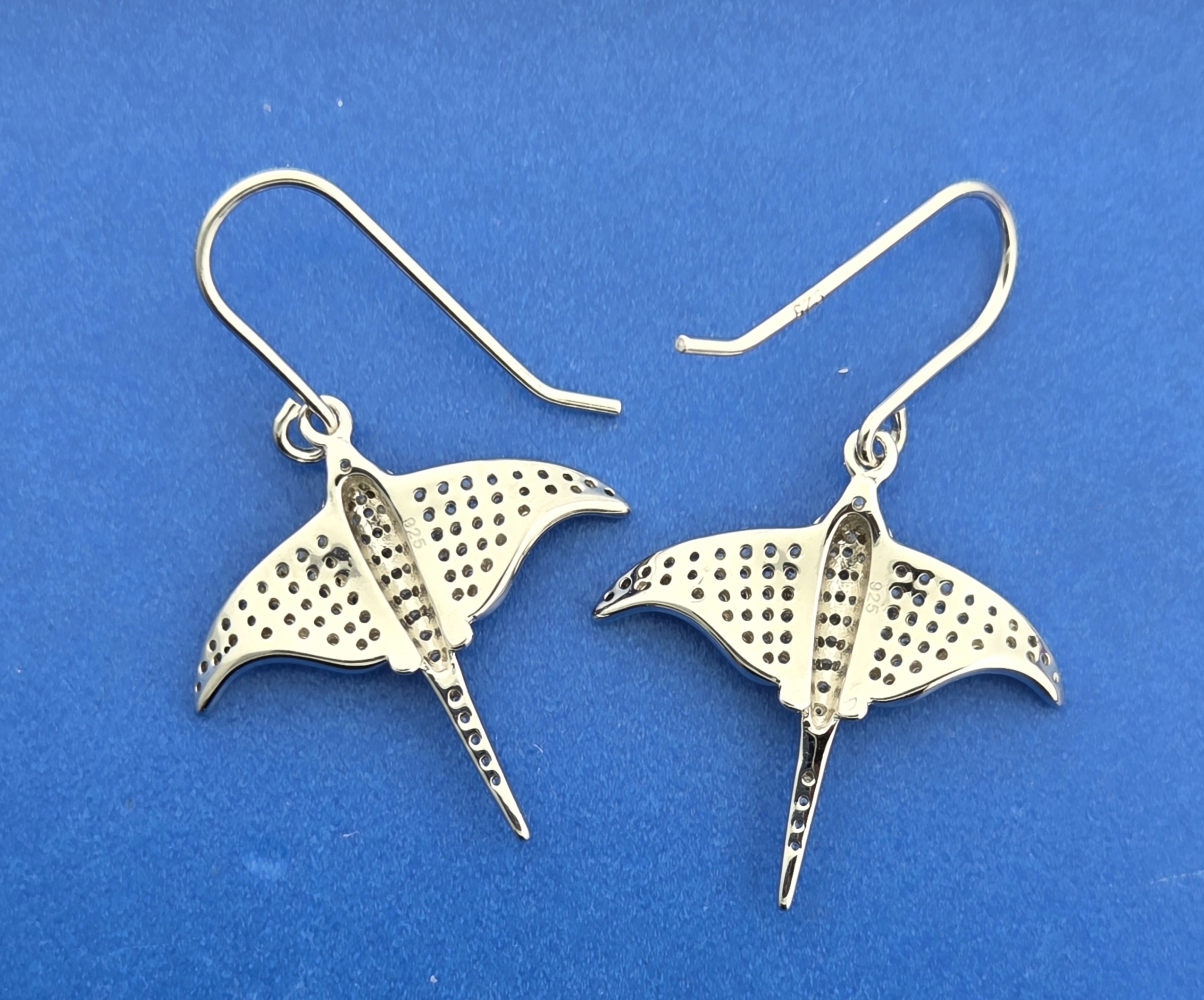 Alamea sterling silver dangle fishhook ear wires stingray earrings, rhodium plated, accented with pave’ set czs on the stingray spine and wings