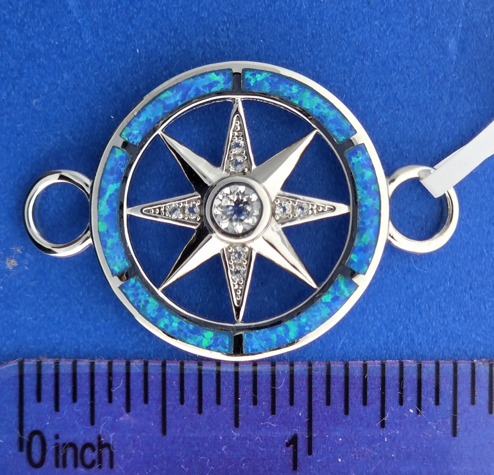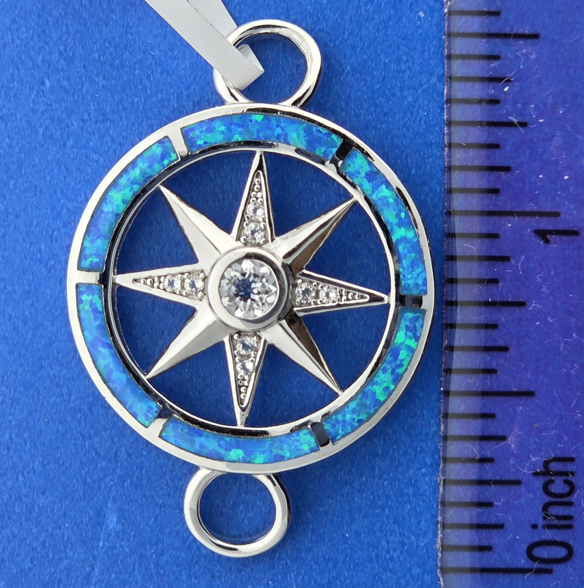 the compass has beautiful lab created blue opal and is accented with genuine white Topaz. Set with 9 Topaz totaling 0.37 ct.