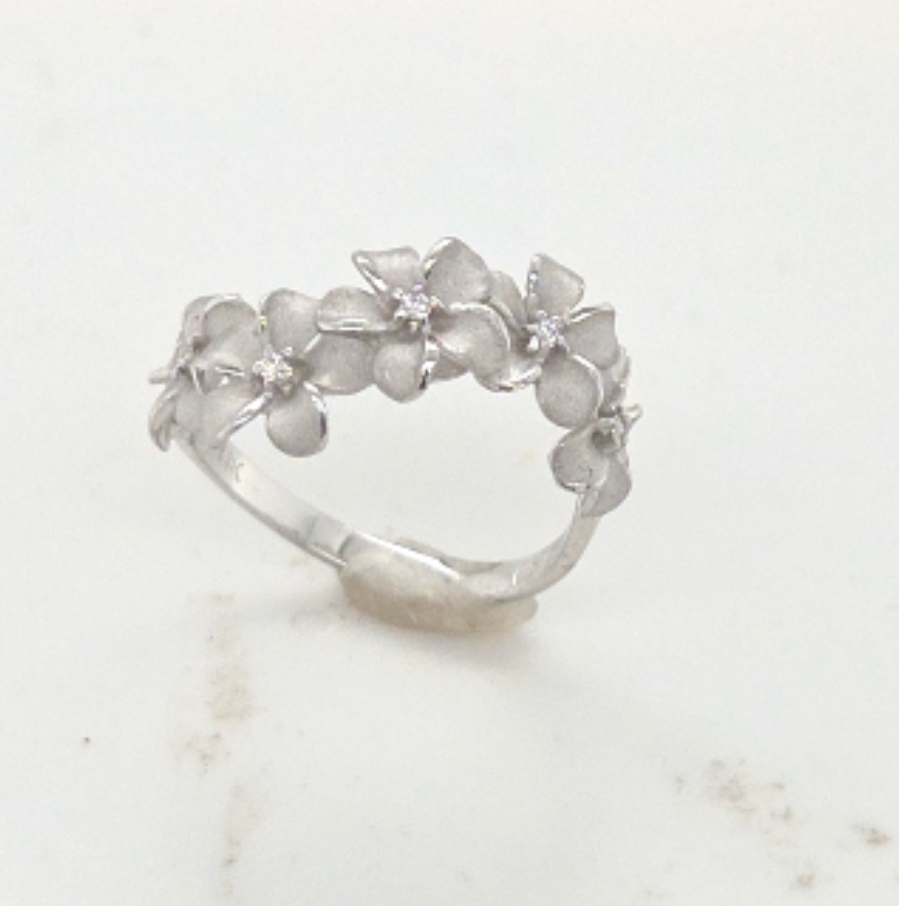 Denny Wong 14k white gold plumeria ring. 5 8mm Wide Plumerias with A Round Brilliant Diamond in The Center of Each Plumeria. 5 diamonds .06Ct Twt.