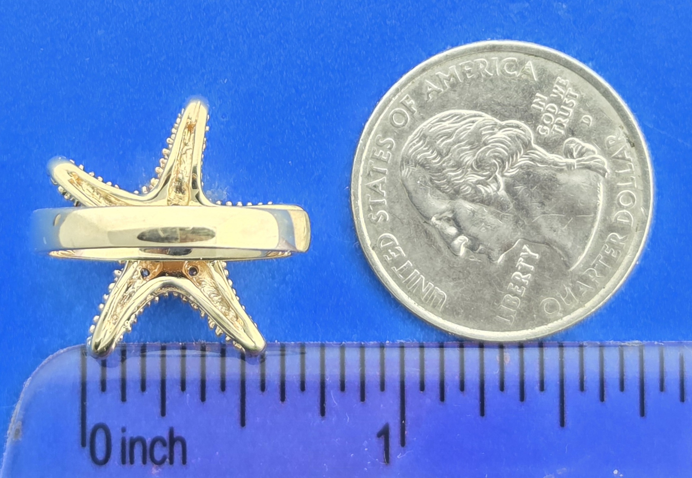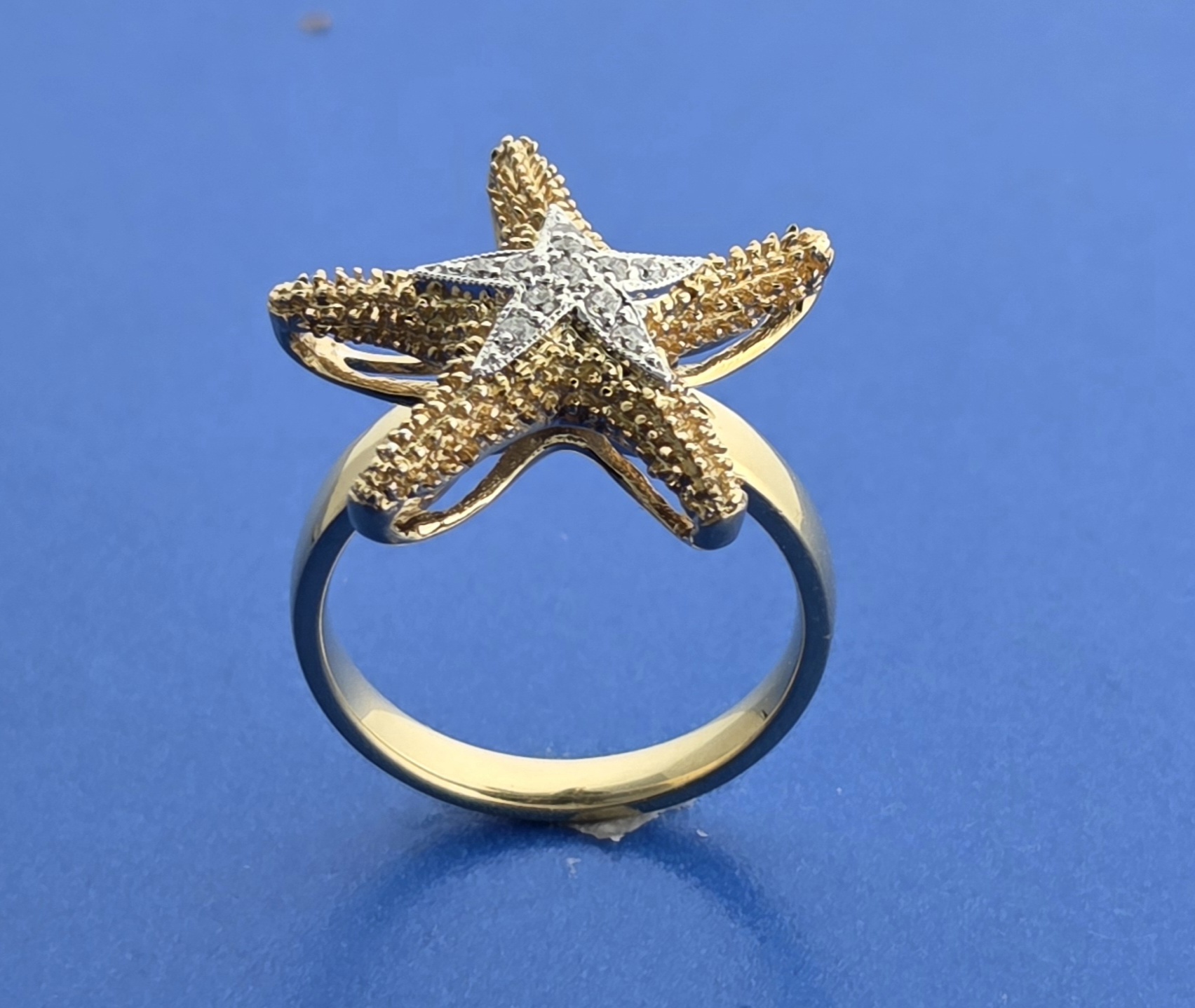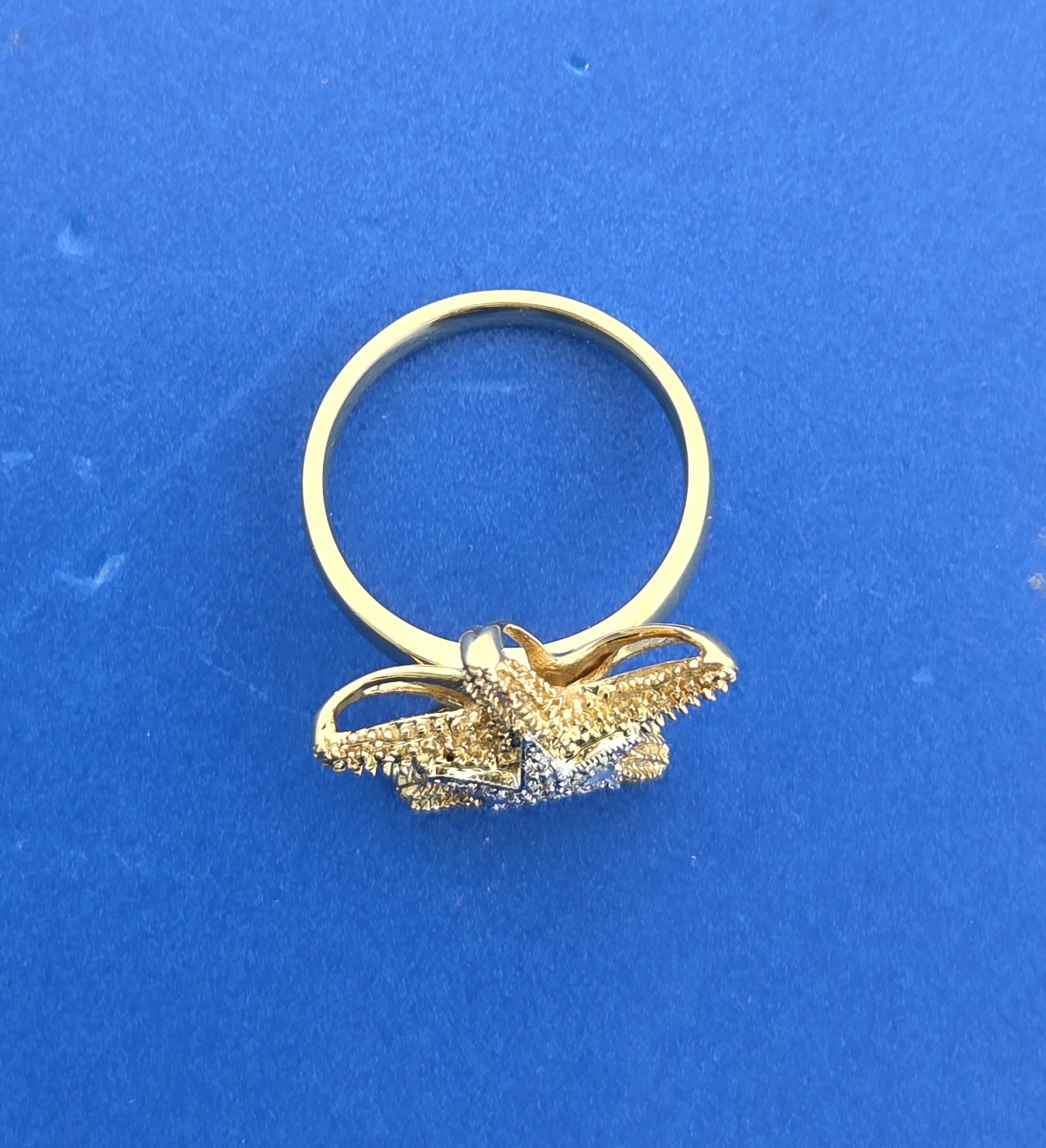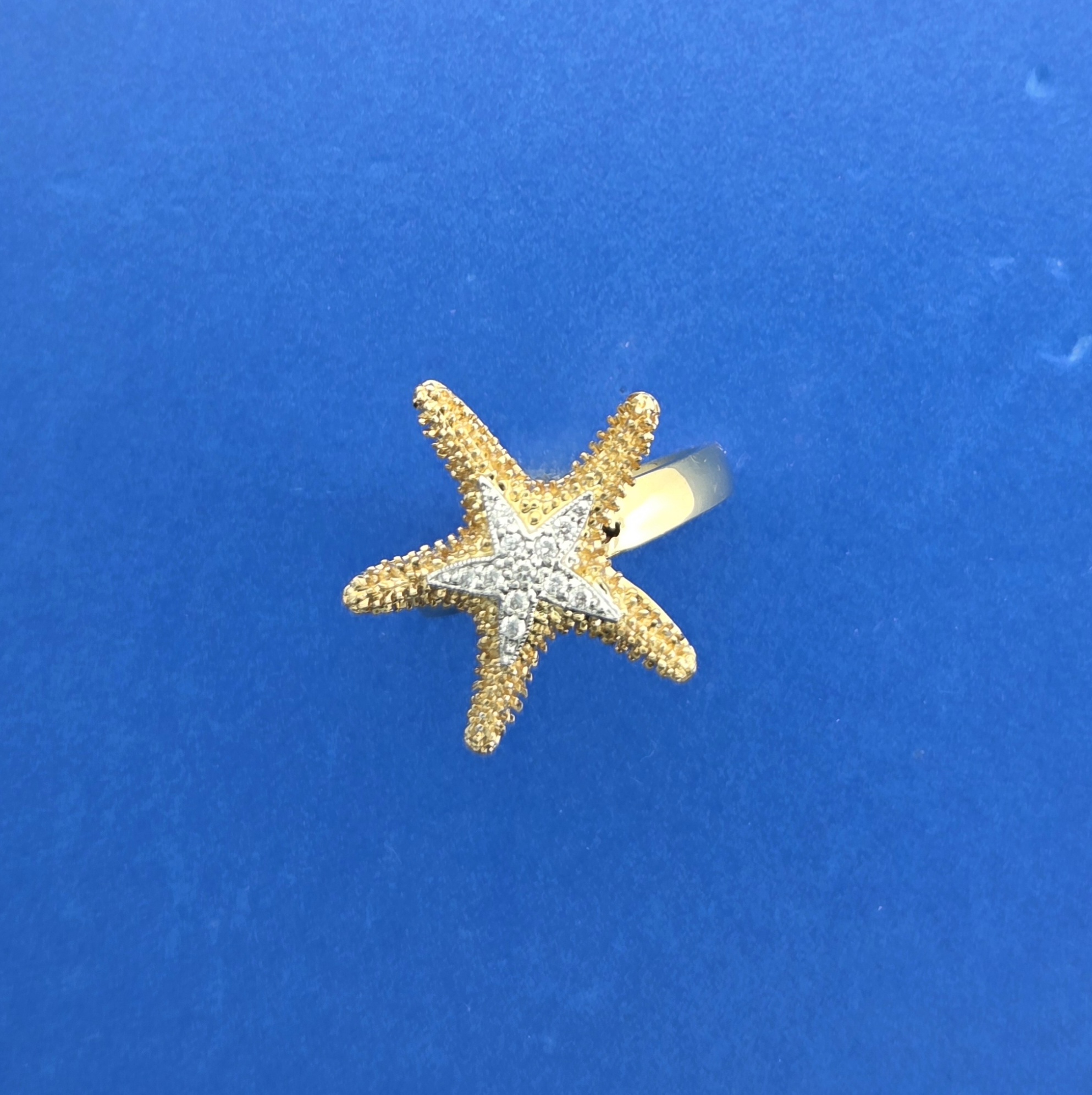 Denny Wong Starfish Ring, 14K 2-Tone, 11 Full Cut Brilliant Diamonds set in a white star on top of the starfish. the band is a comfort style.3mm wide on the bottom, 3.4mm wide on the top. The starfish is textured like a real starfish. Total Diamond Weight Of .06Ct.