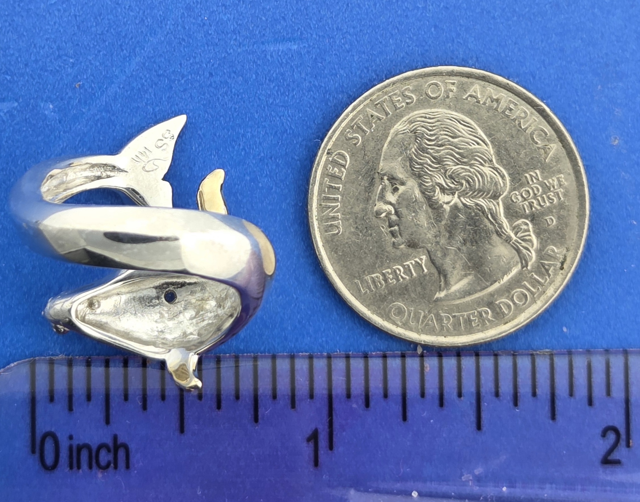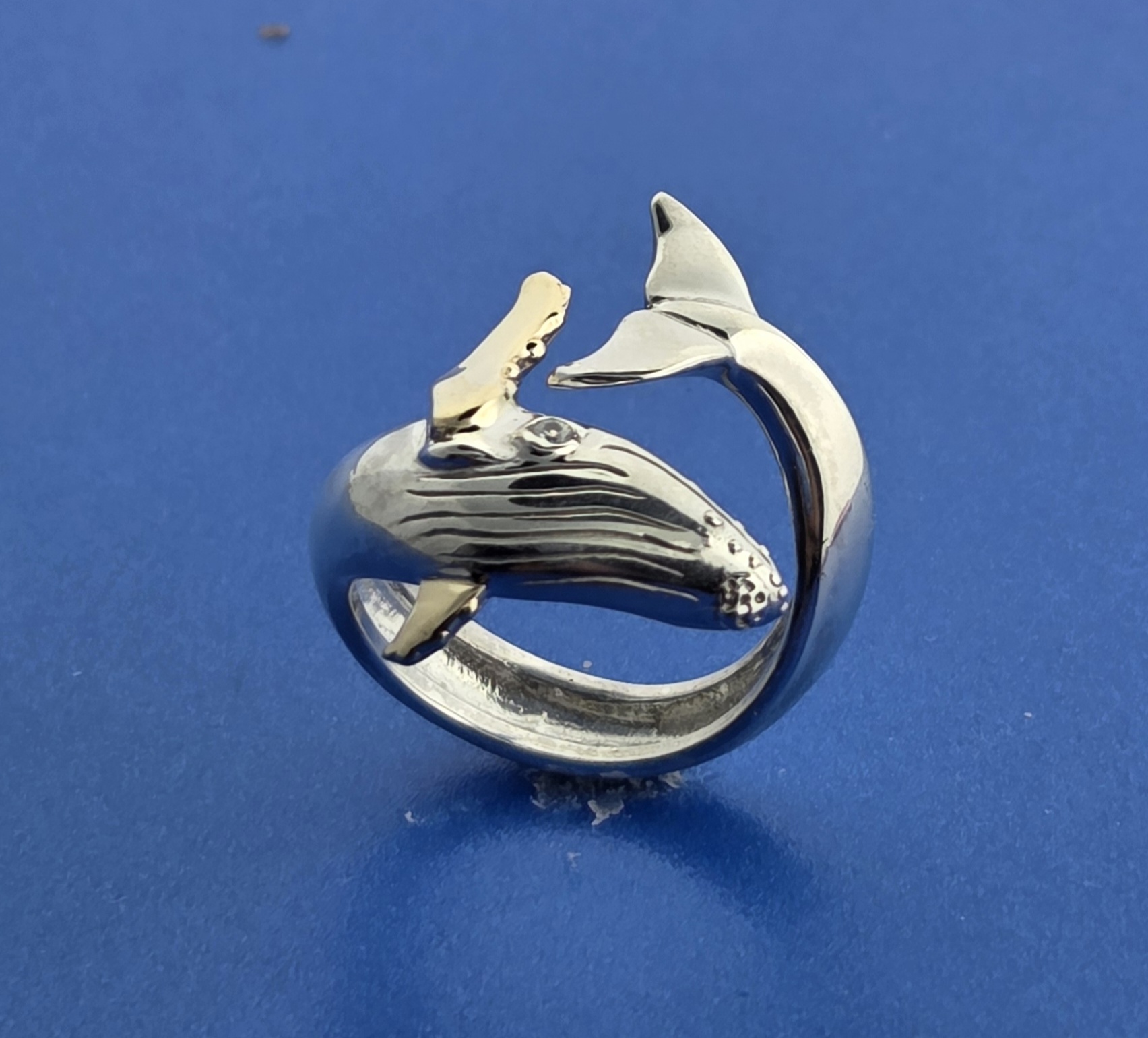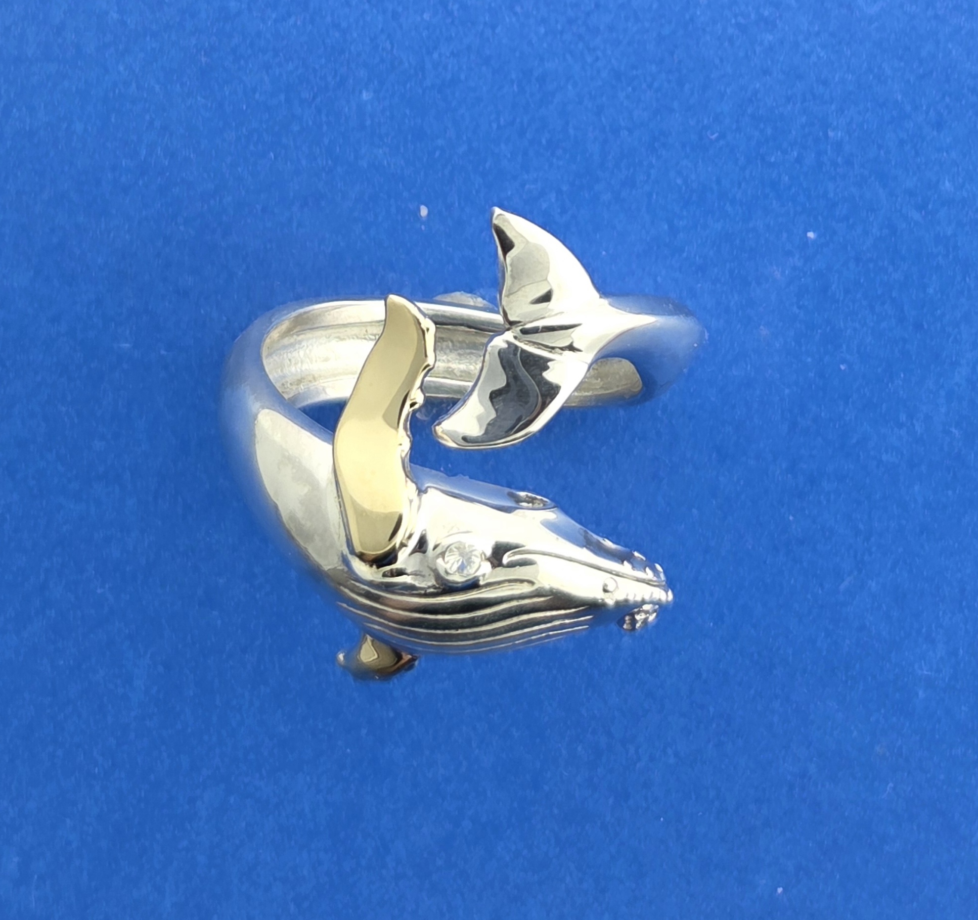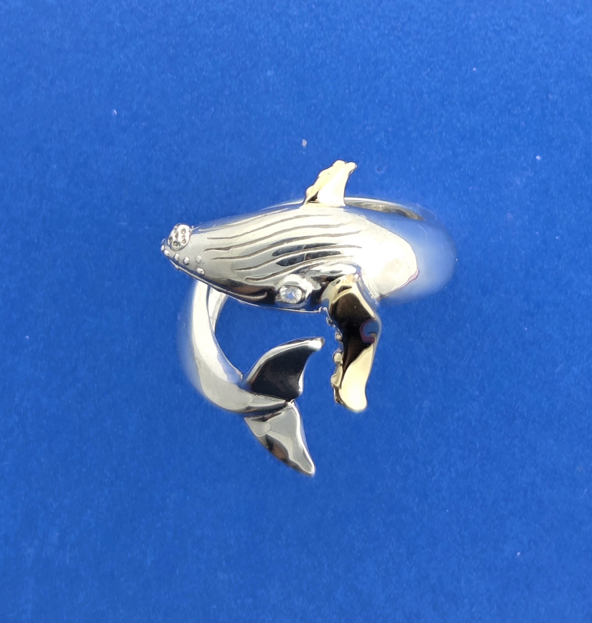 Sterling Silver whale with a solid 14k gold pectoral fin, white sapphire eye, rhodium plated
