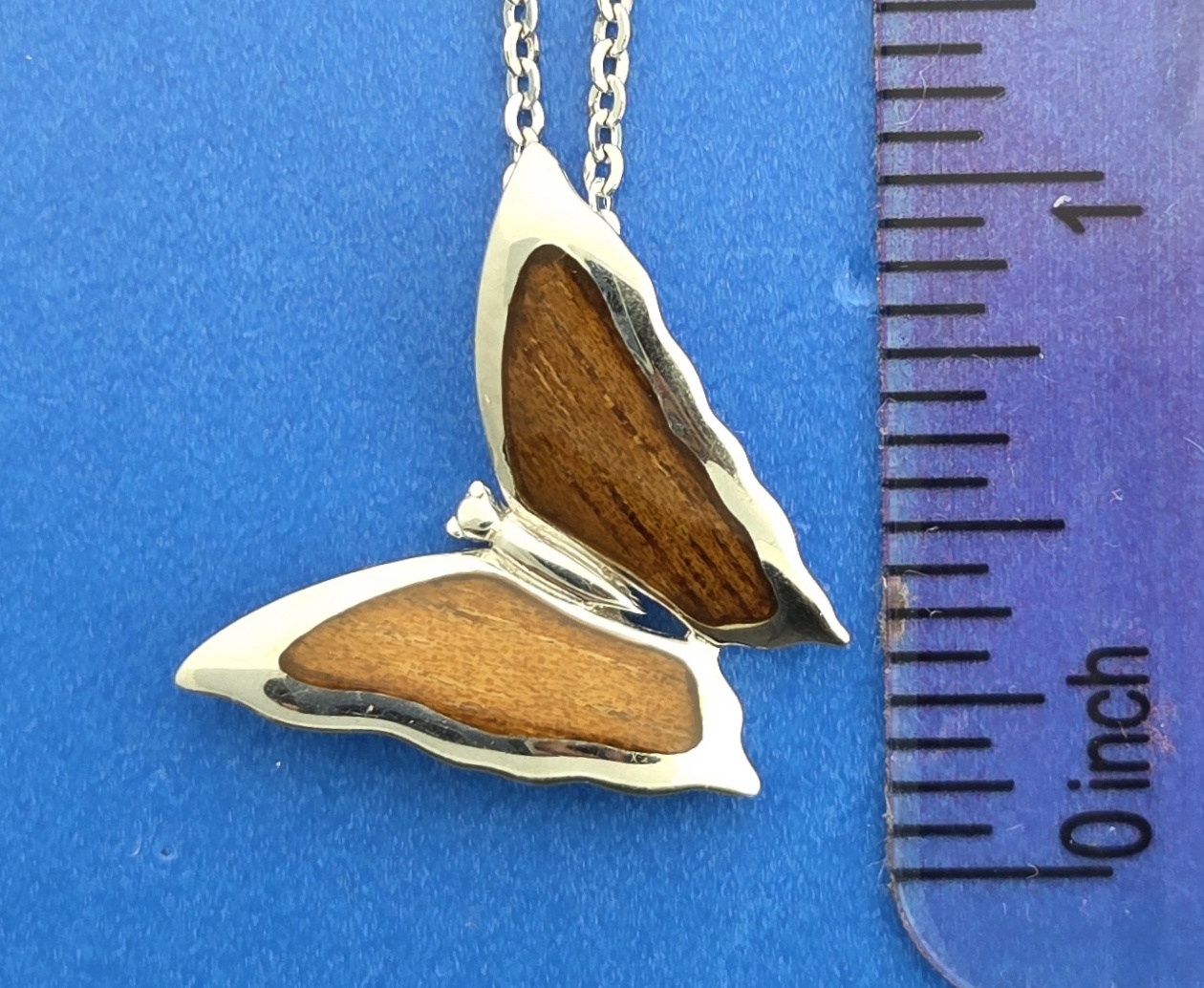 Alamea sterling silver butterfly pendant, inlaid genuine Koa wood, rhodium plated,