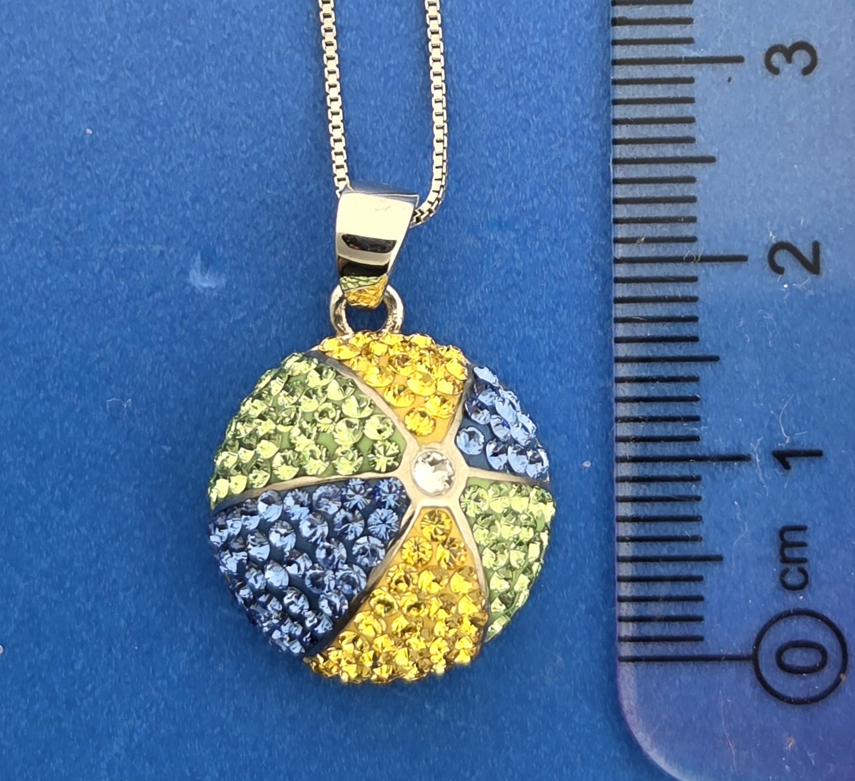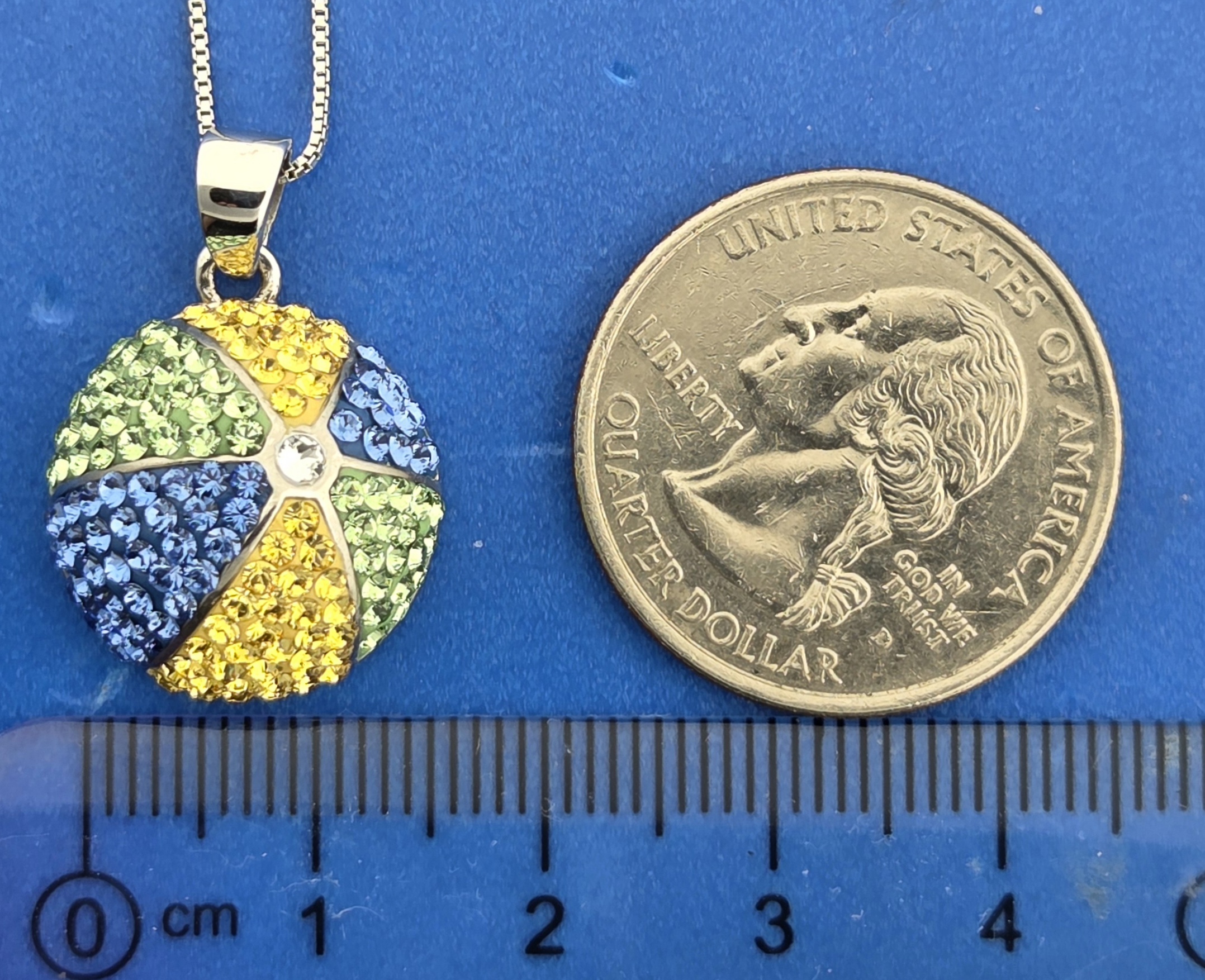 sterling silver rhodium plated beach ball pendant, green, yellow & blue hand set crystals, a clear crystal is in the center.