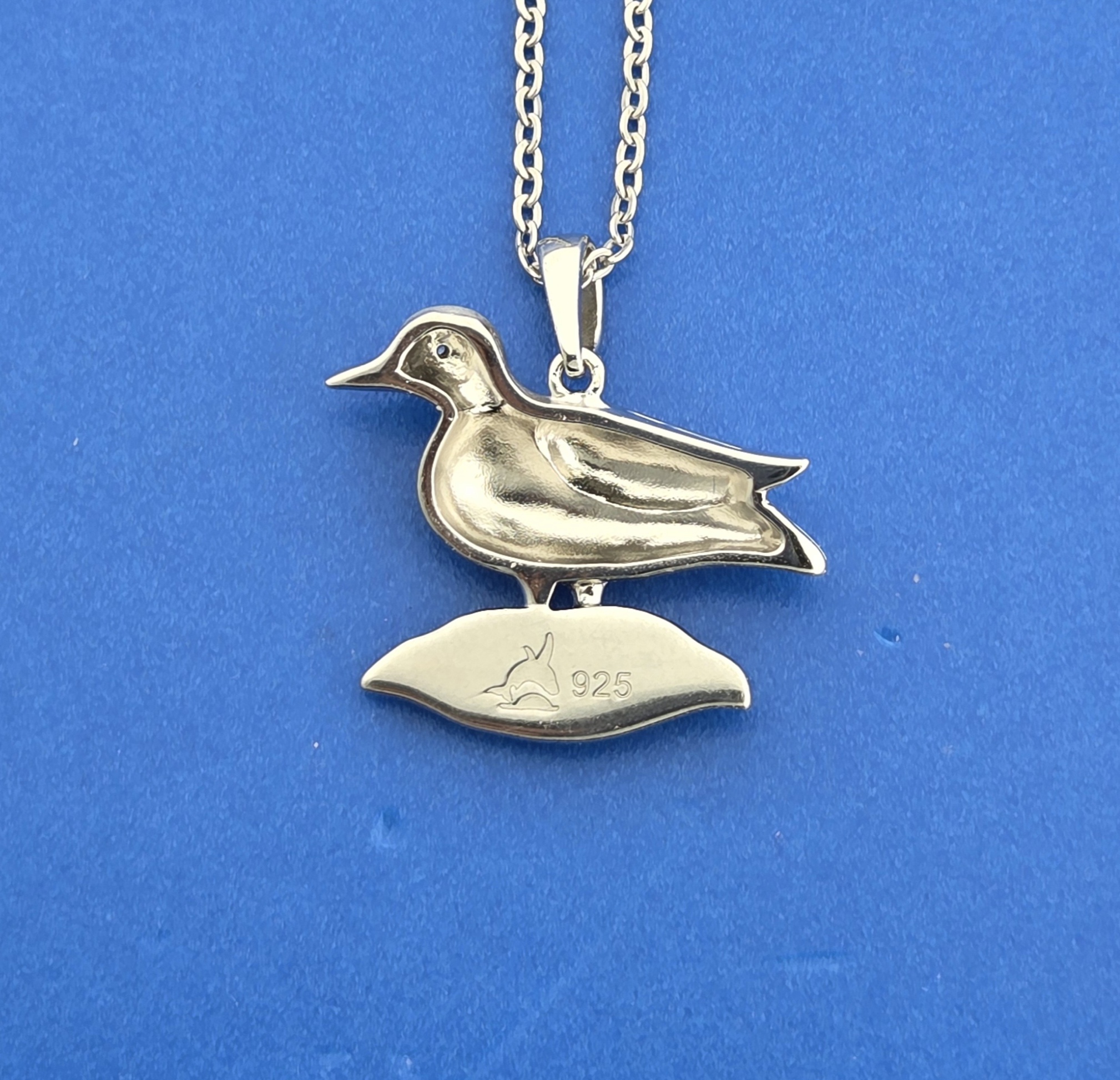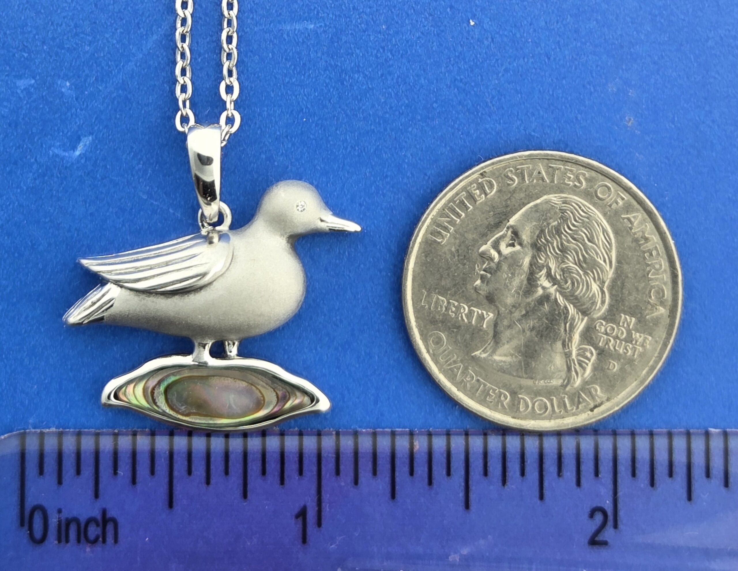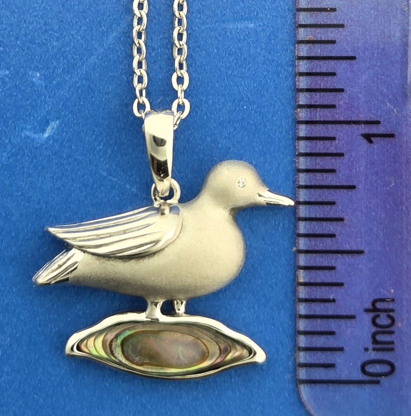 Alamea Sterling Silver Mallard pendant, the Mallard is standing on a pool of abalone. It is solid sterling silver sand blasted and rhodium finished, clear cz in the eye
