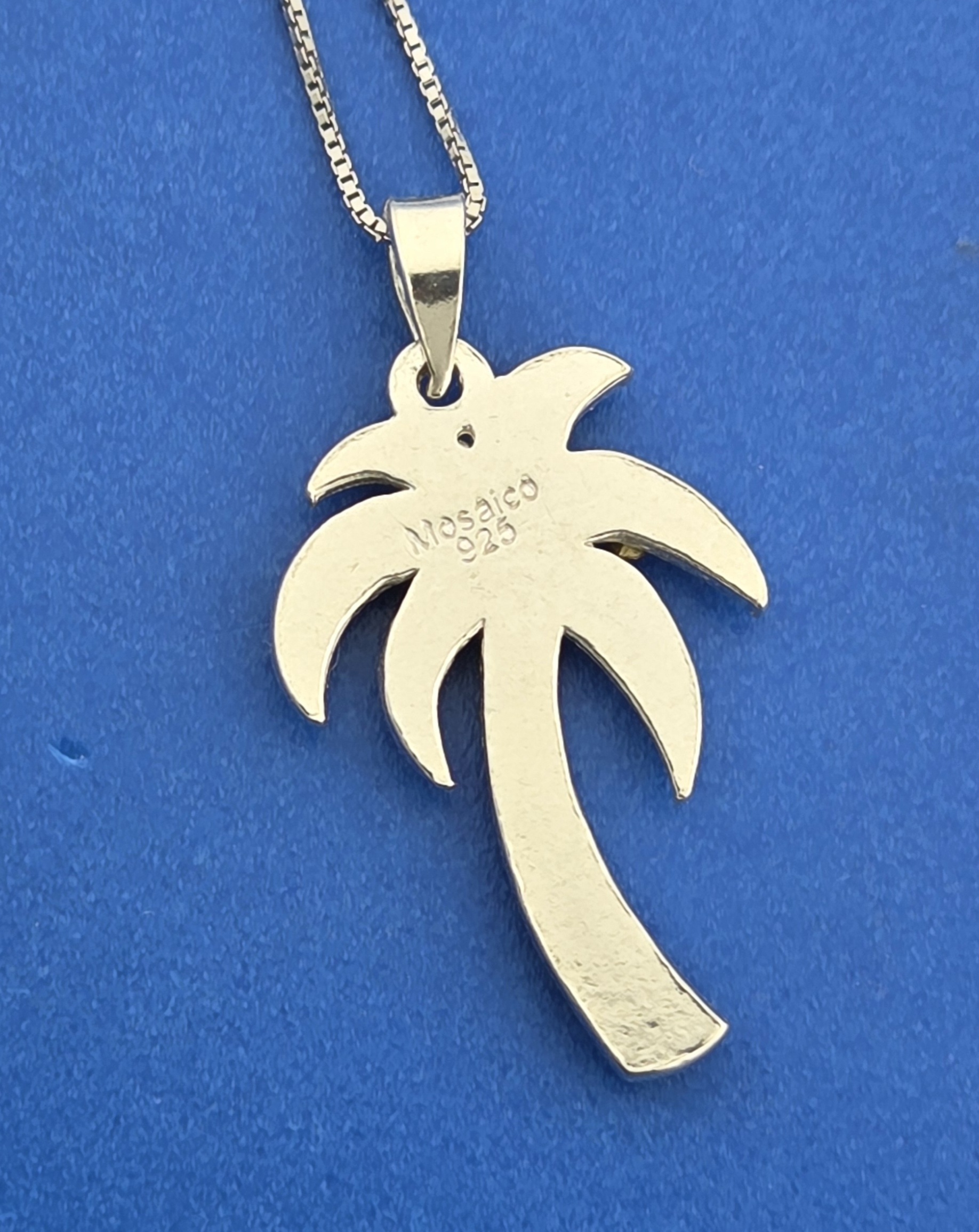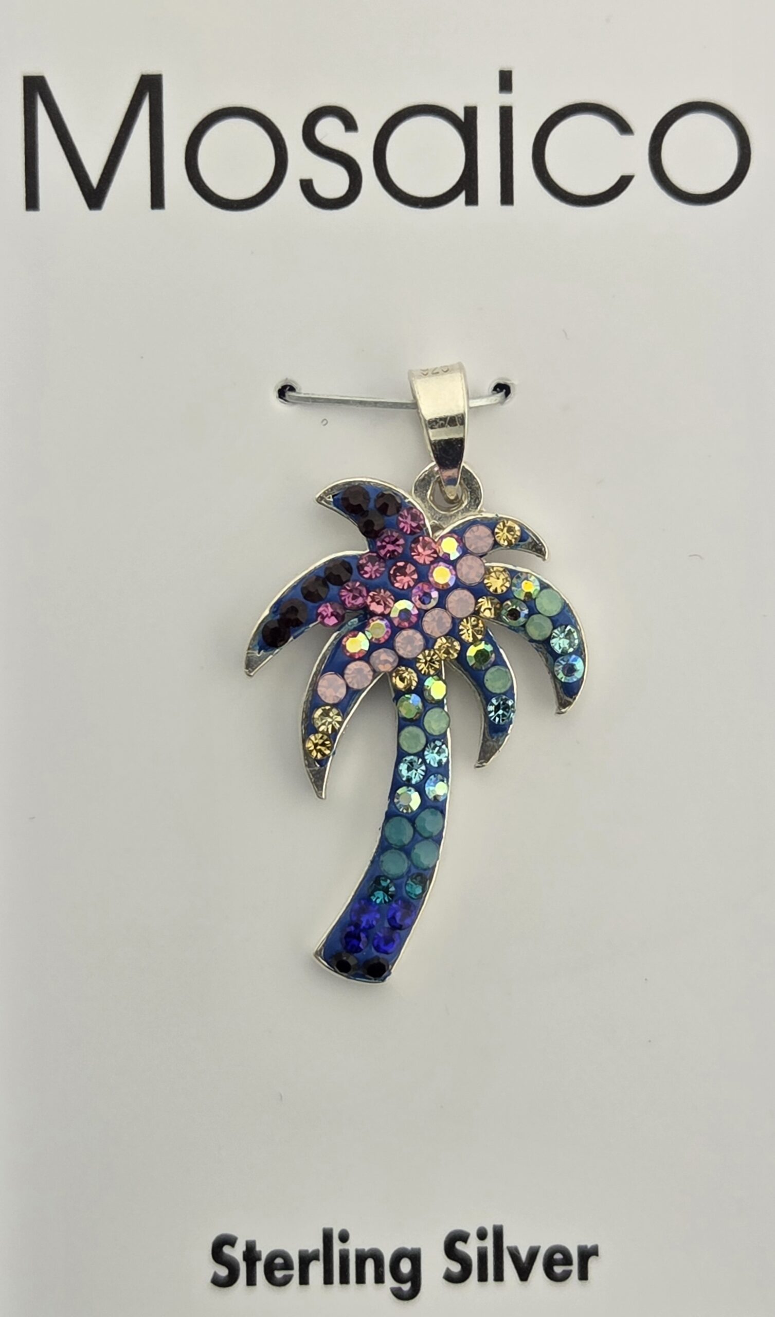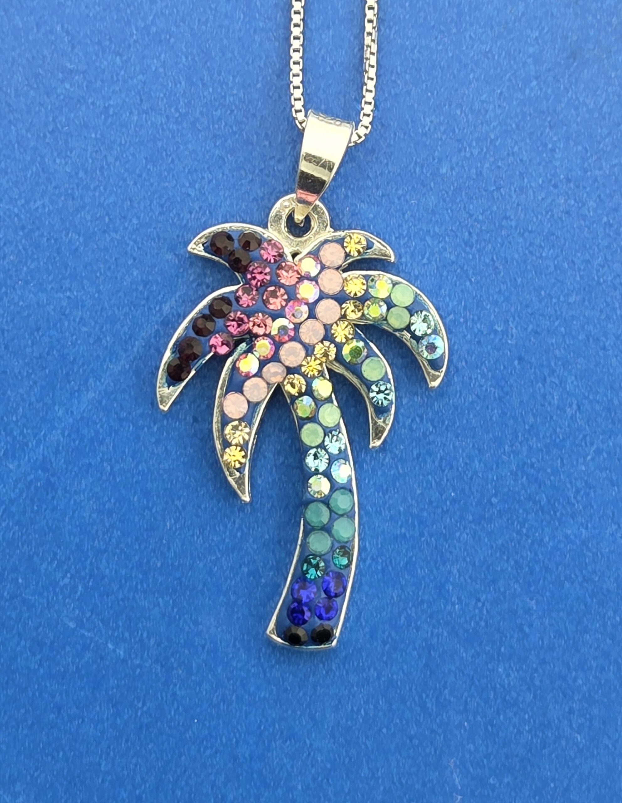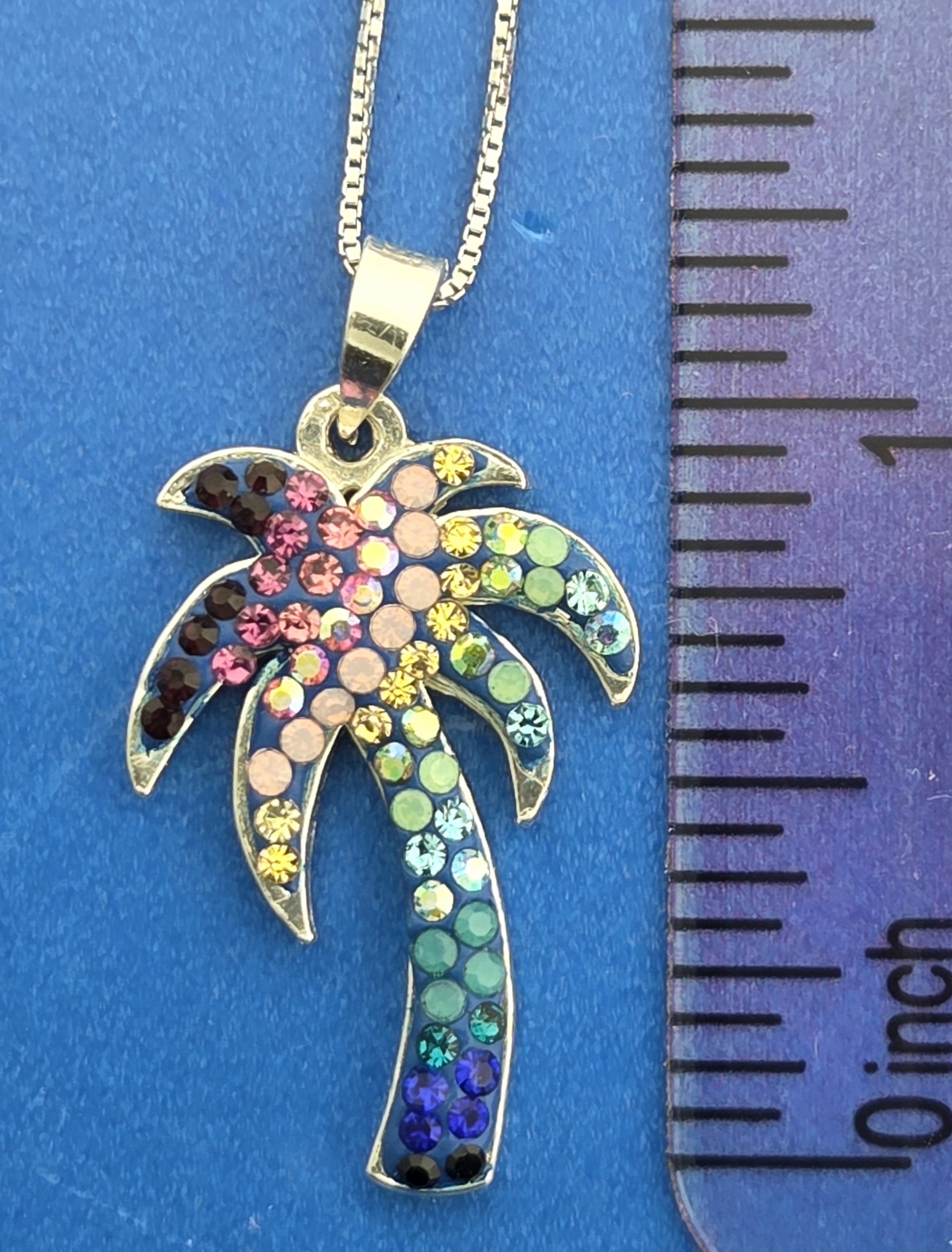 Mosaico sterling silver palm tree pendant, multi rainbow colors of Austrian crystals,