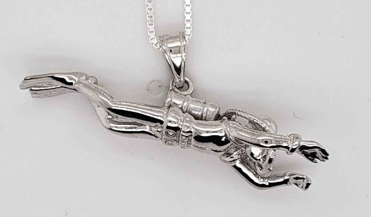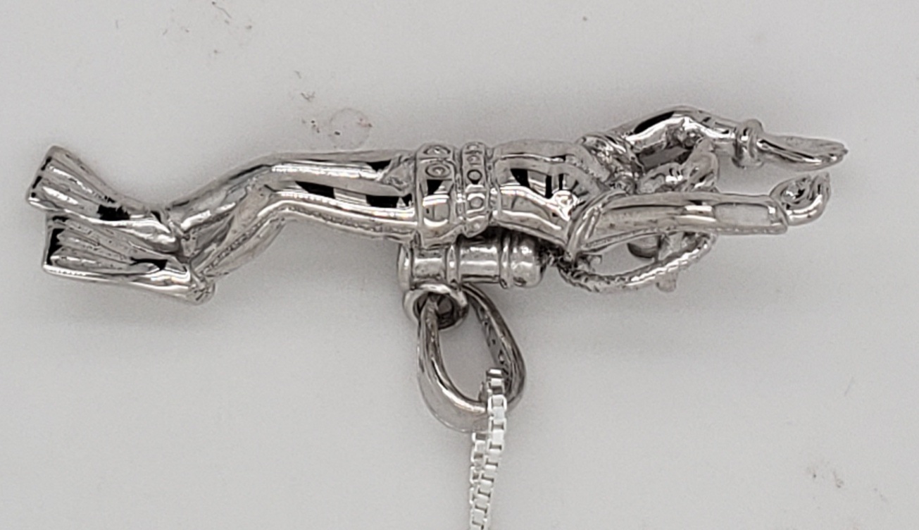 solid sterling silver 3D female scuba diver pendant, rhodium plated, 38mm x 11mm x 17mm including the bale,