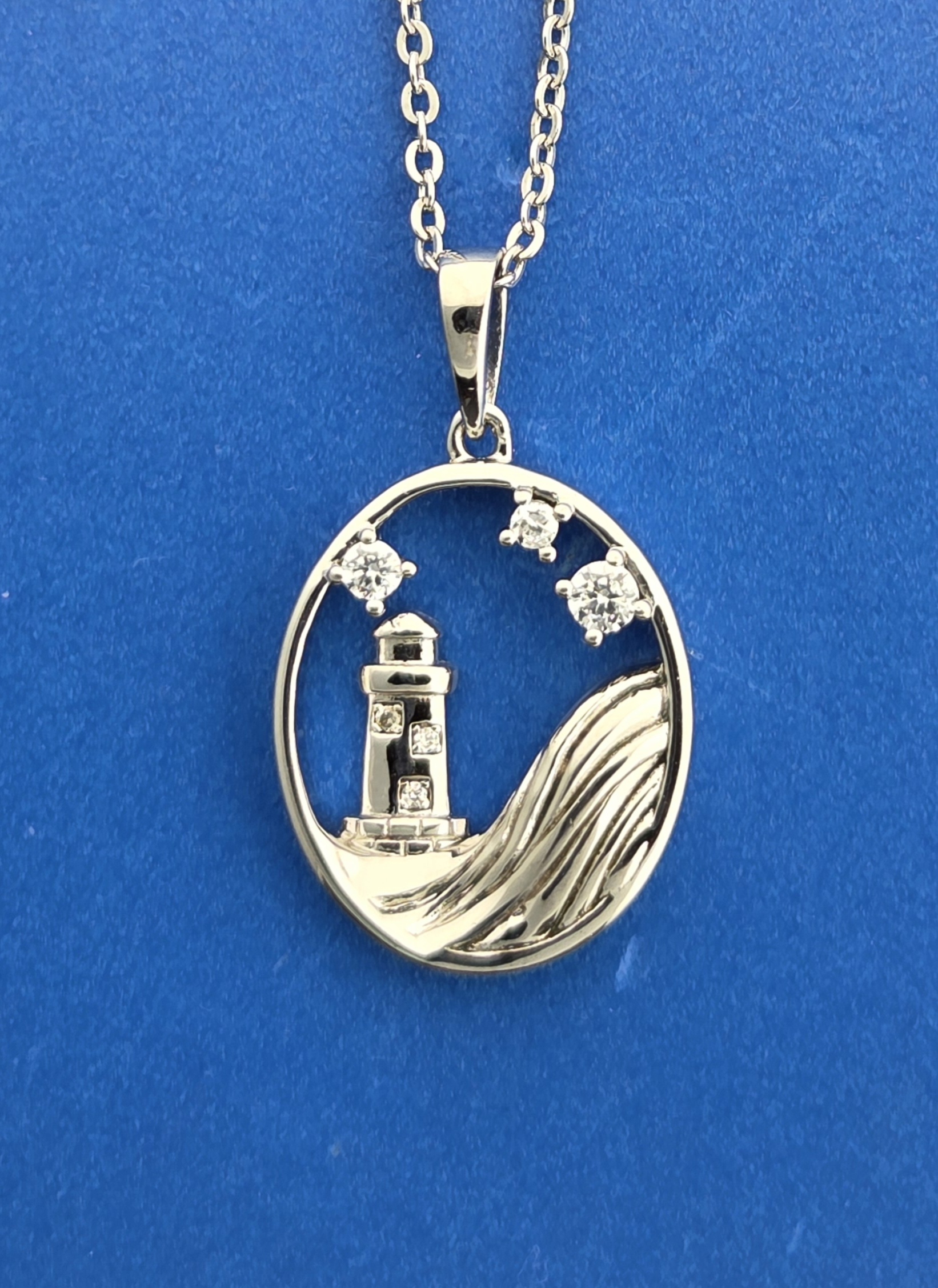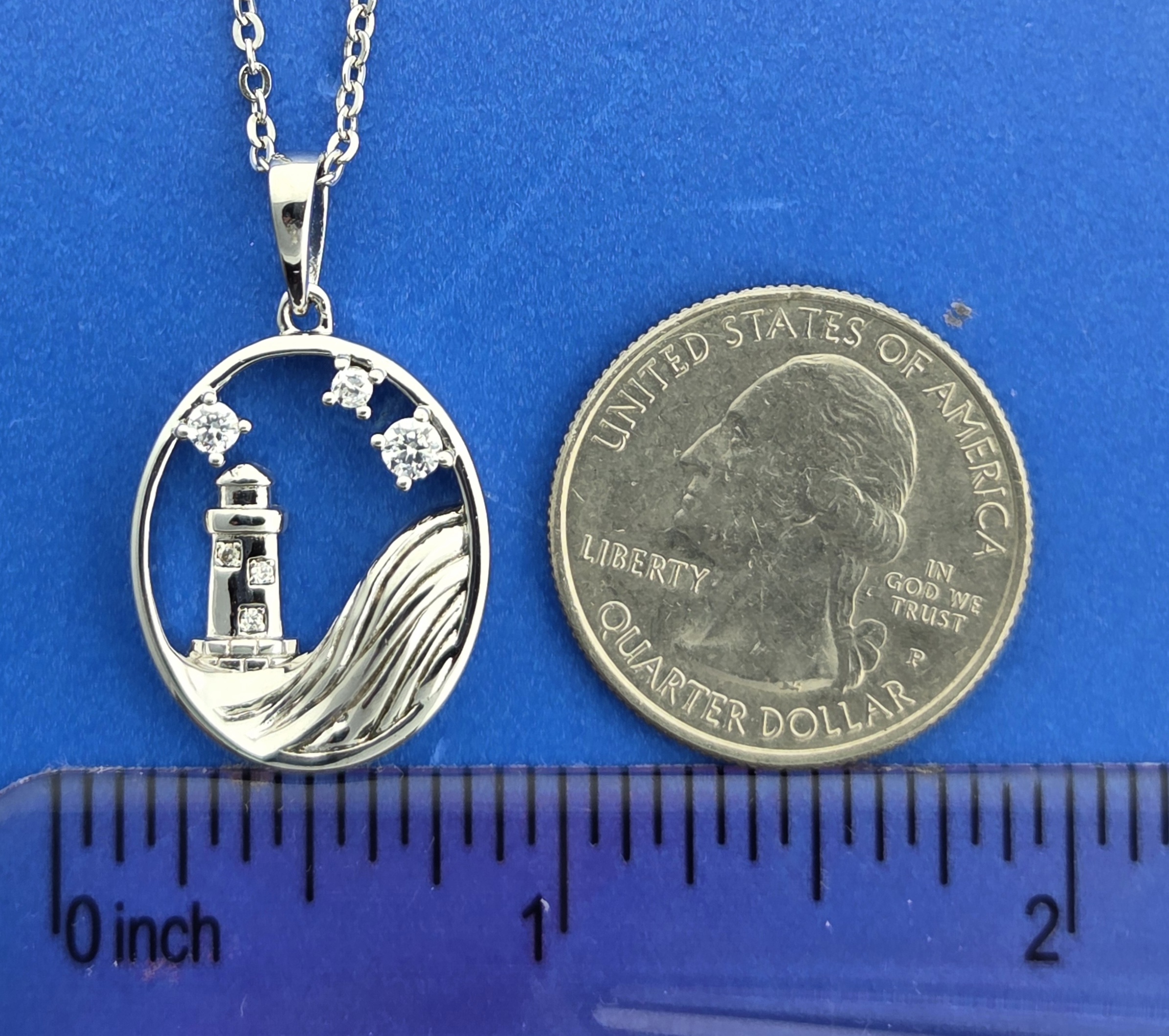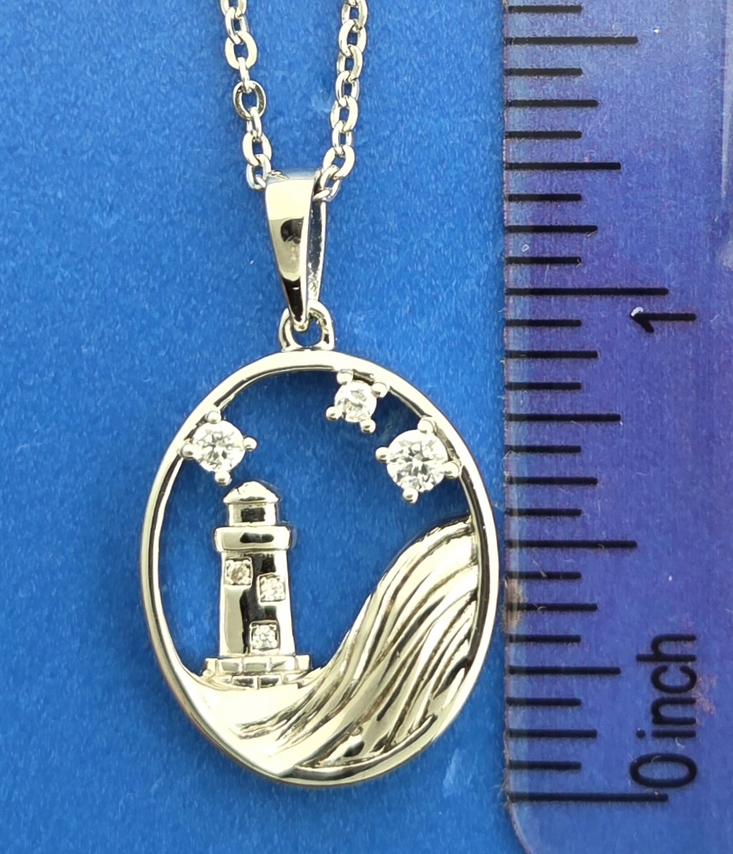 Alamea sterling silver lighthouse pendant, rhodium plated, set with 6 CZ totaling 0.41 ct.