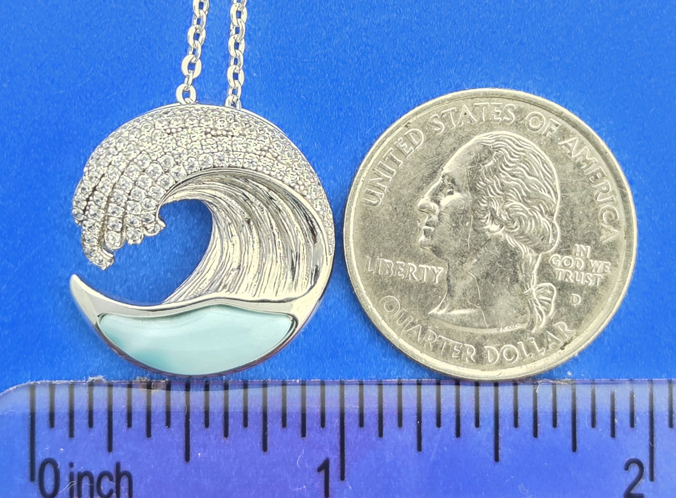 Alamea wave pendant rhodium plated Sterling Silver with Ocean Blue Natural Larimar and Pave’ Set clear Czs, Wave 3/4″ Across /21mm
