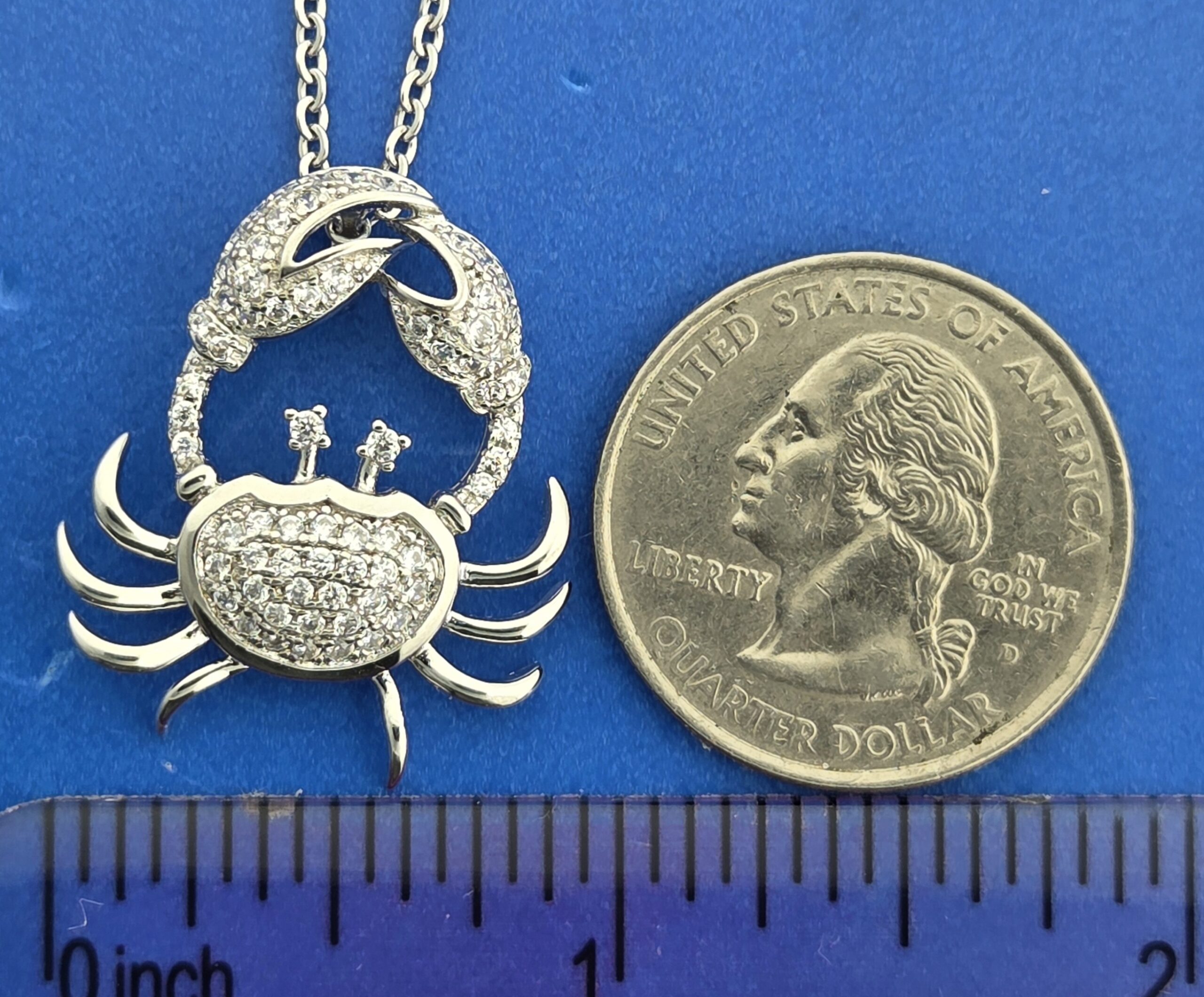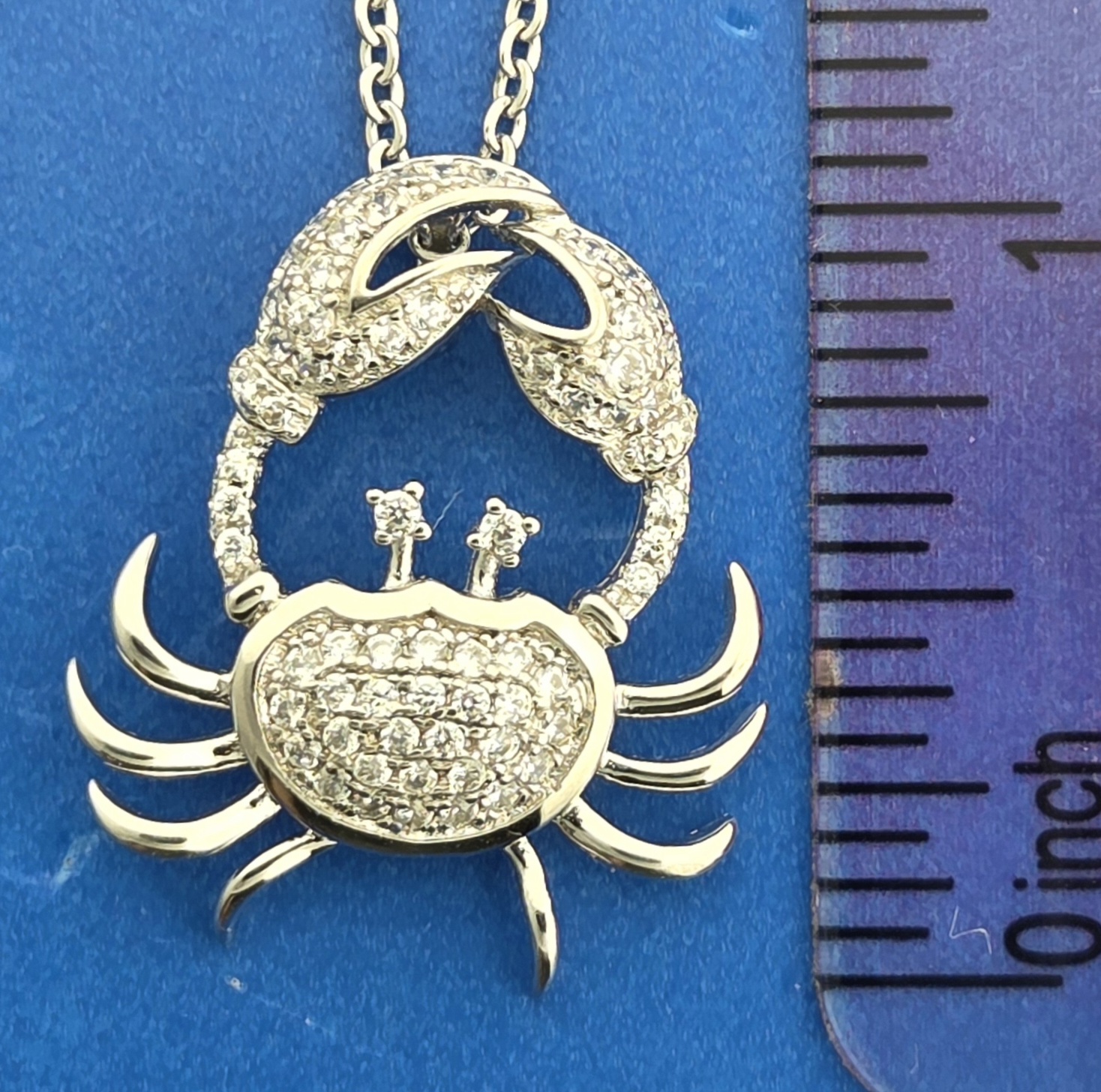 Alamea blue crab pendant with pave’ set clear czs on the shell, claws and eyes; rhodium plated.