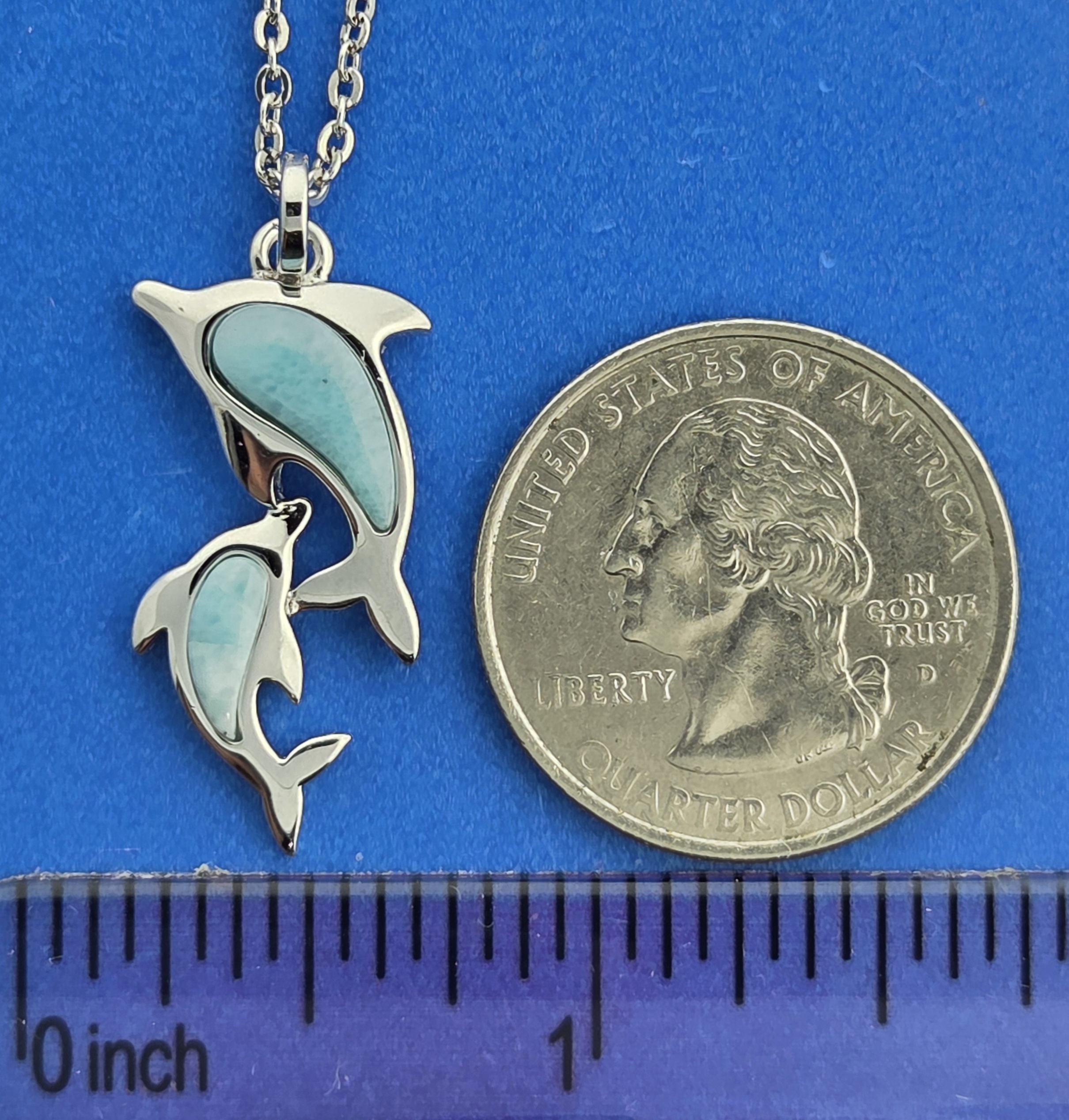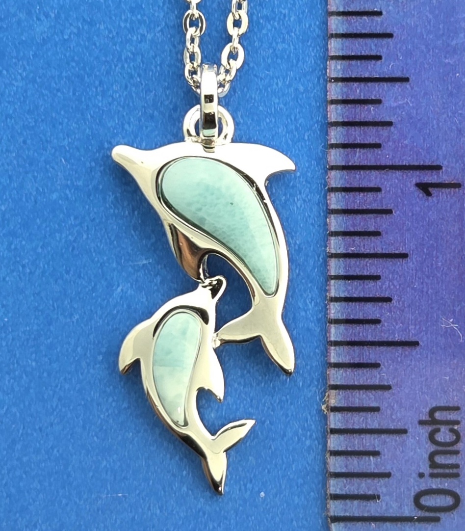Alamea sterling silver playful Dolphin pendant. 2 dolphins swimming together each with a beautiful ocean blue natural Larimar cab,