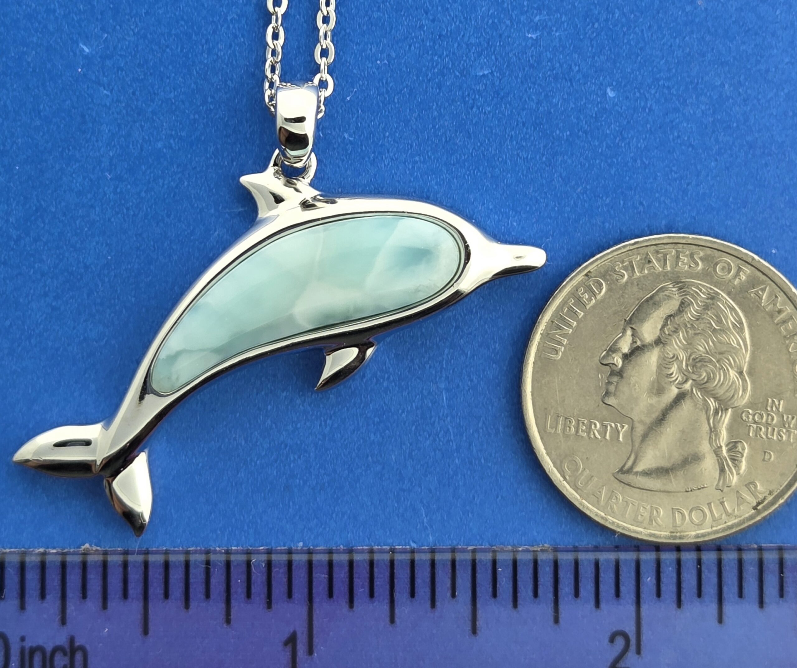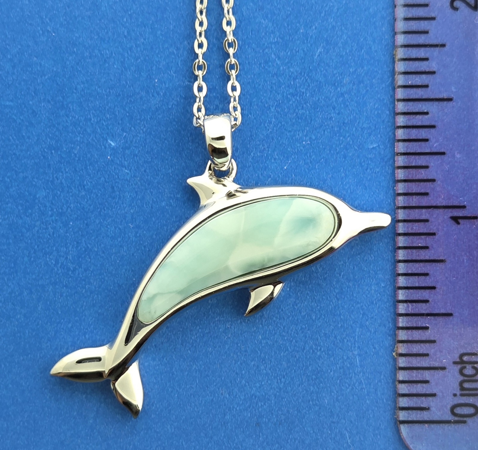 Alamea sterling silver Dolphin pendant with a beautiful ocean blue natural Larimar cab,