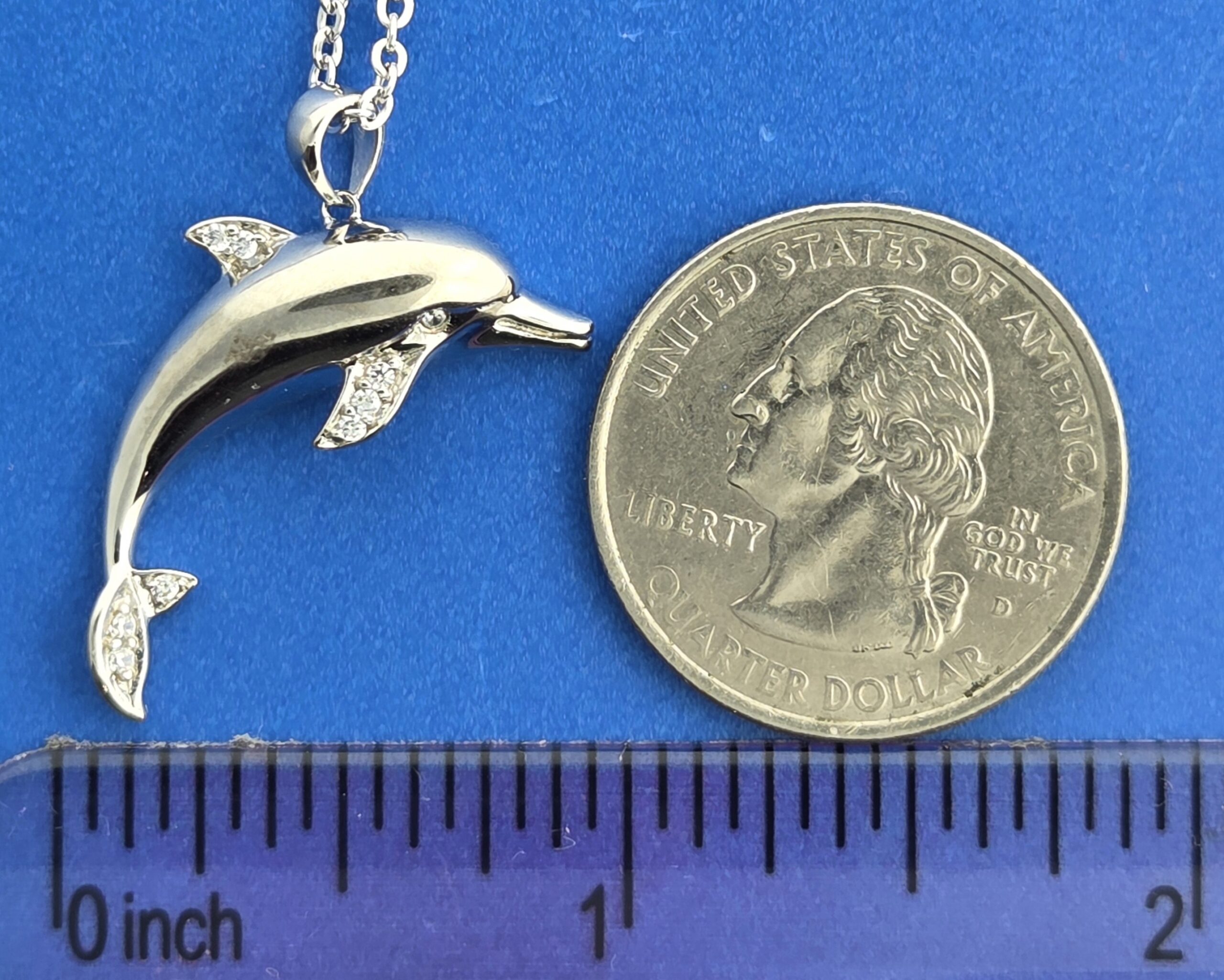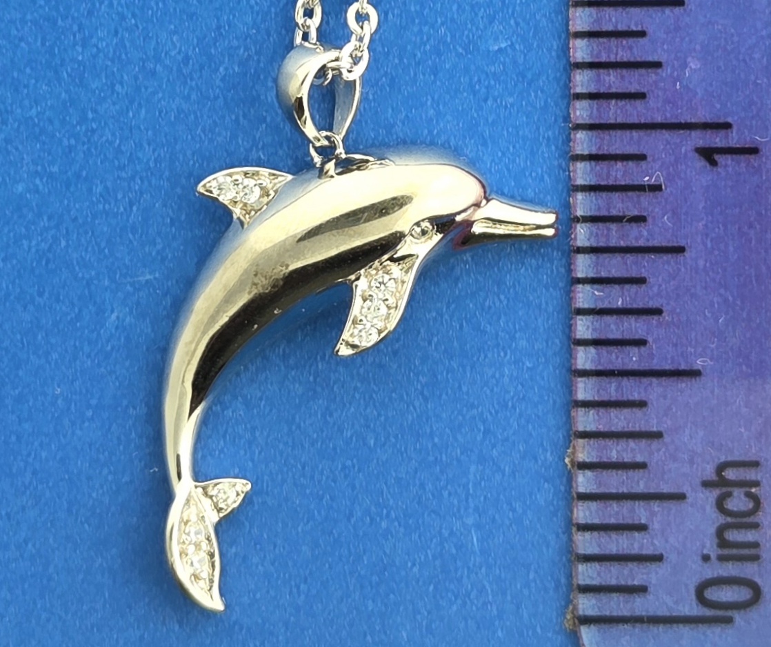 Alamea sterling silver dolphin pendant, clear cz accents on the fins, fluke & eye, Rhodium plated