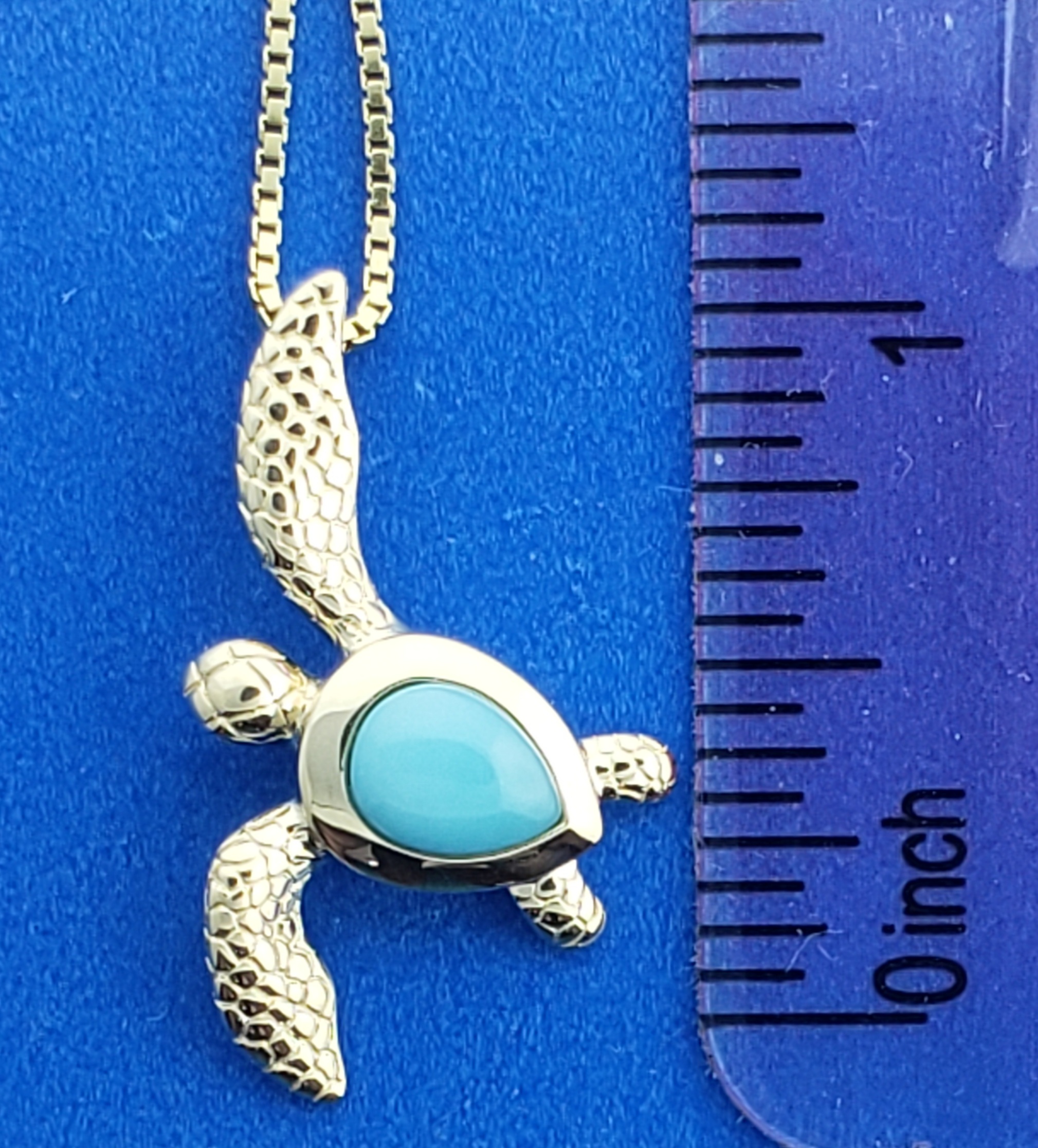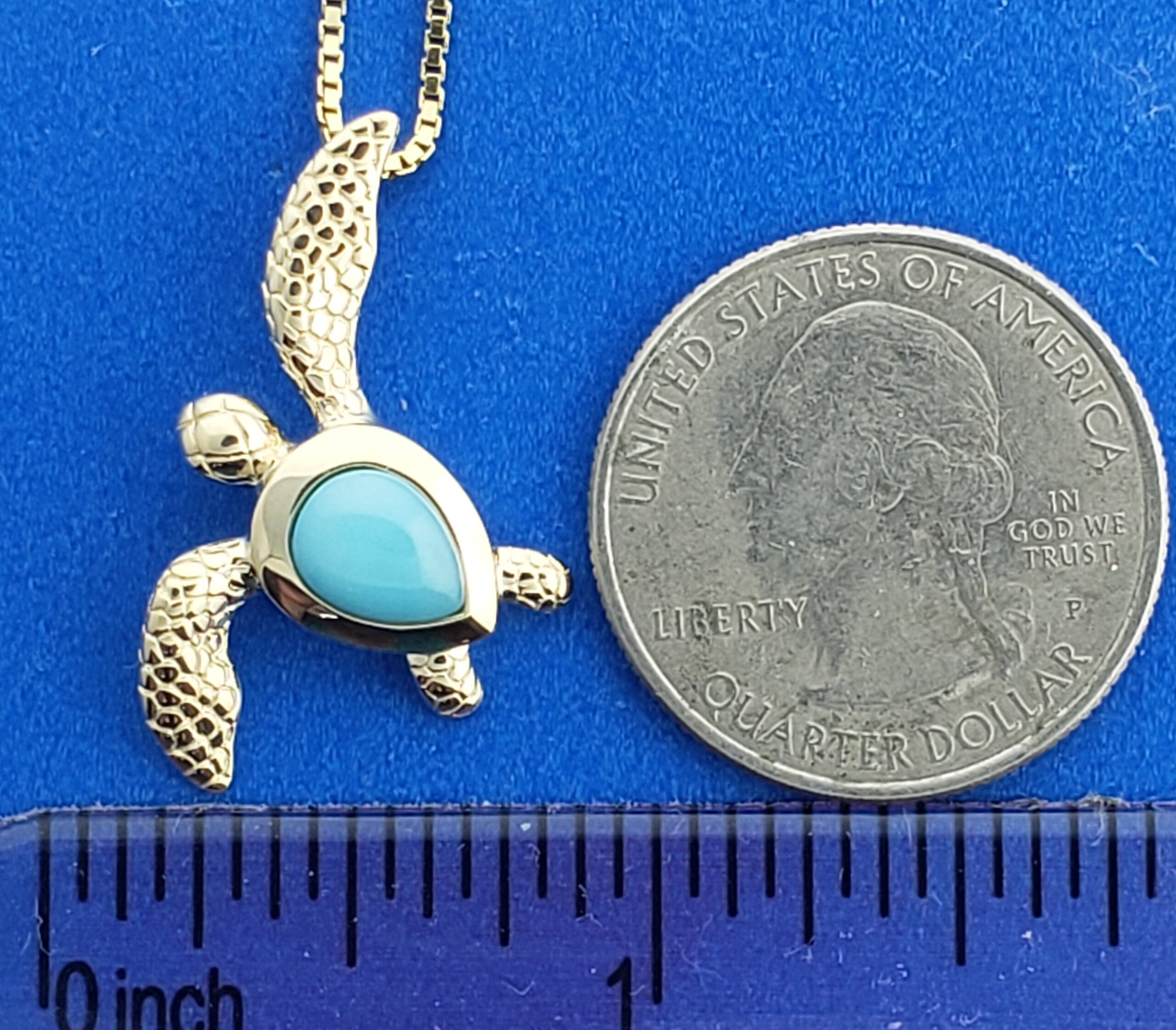 alamea 14k yellow gold sea turtle with a bezel set ocean blue larimar shell.