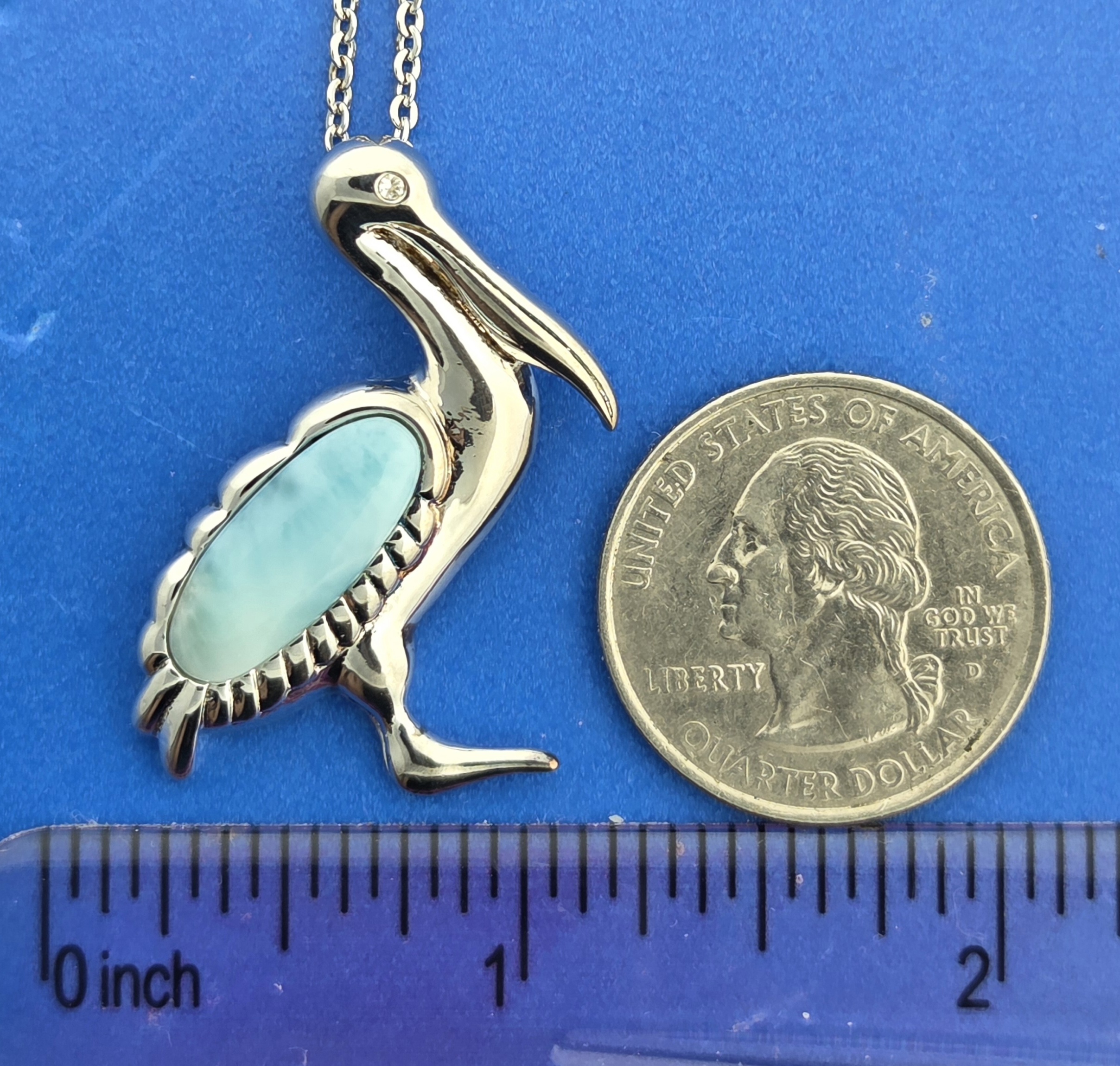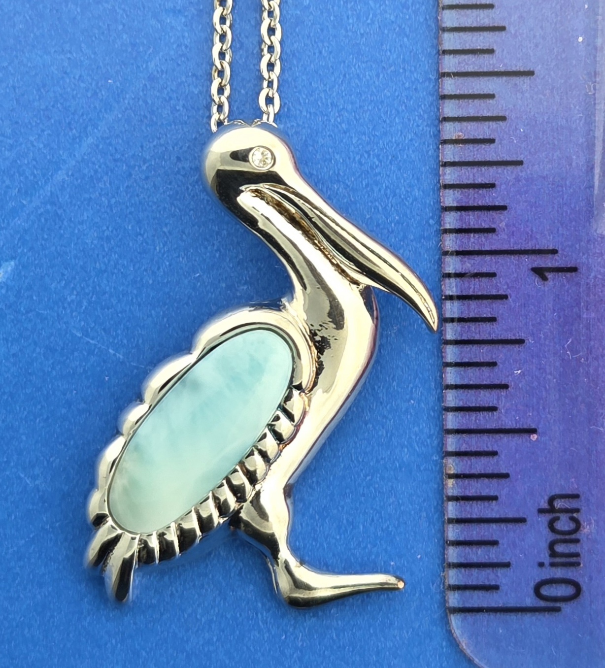 Alamea Pelican pendant sterling silver and rhodium plated; ocean blue larimar, a clear White Topaz in the eye 36mm x 22mm