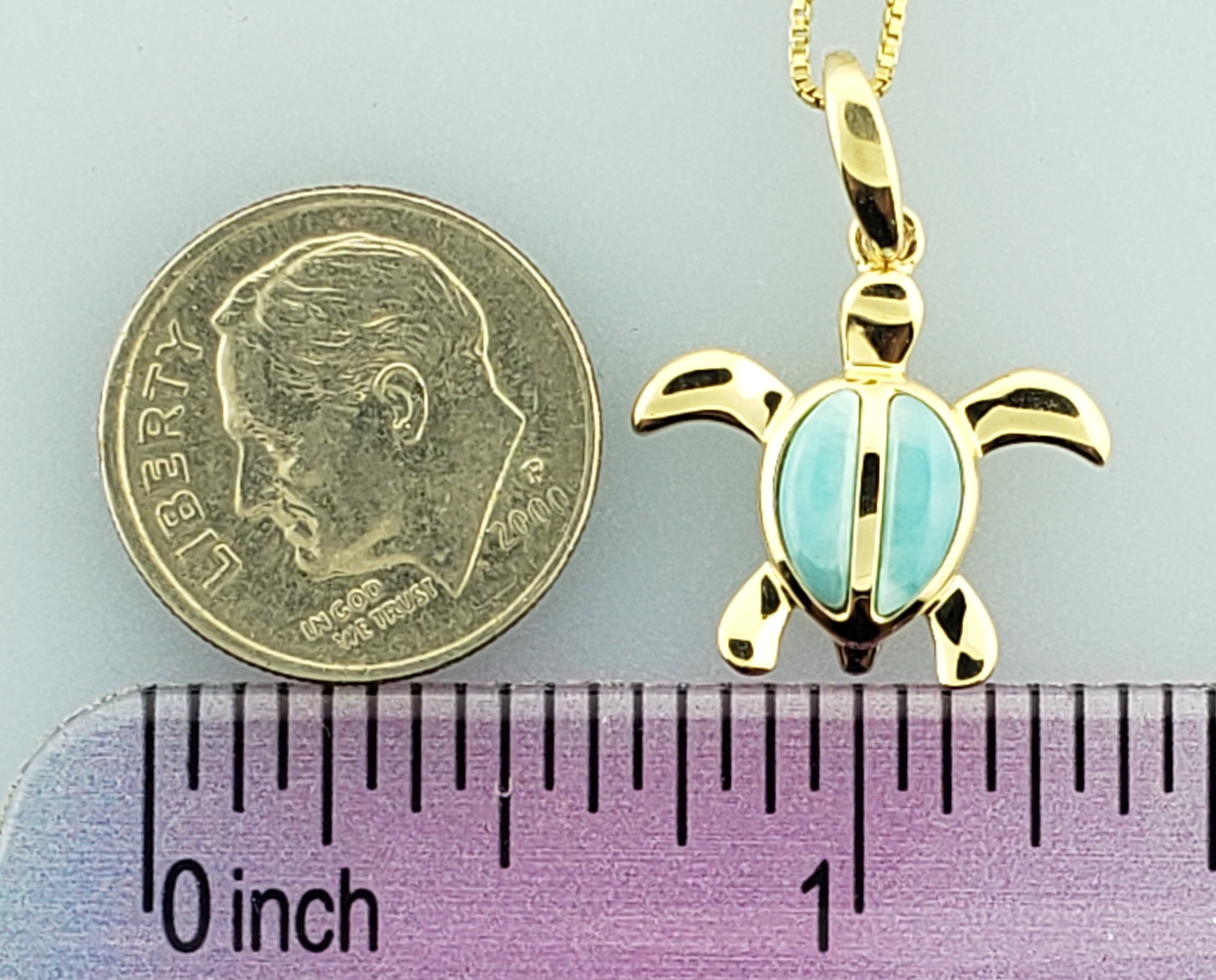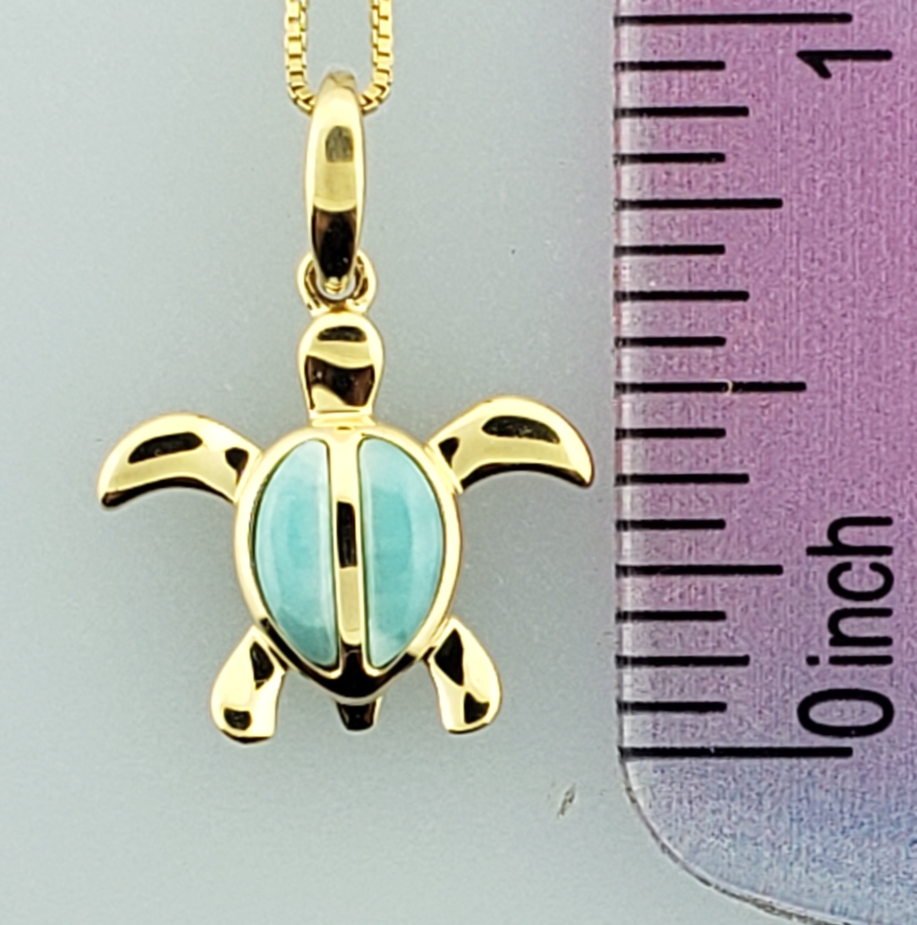 alamea Honu sea turtle pendant 14k yellow gold & ocean blue larimar
