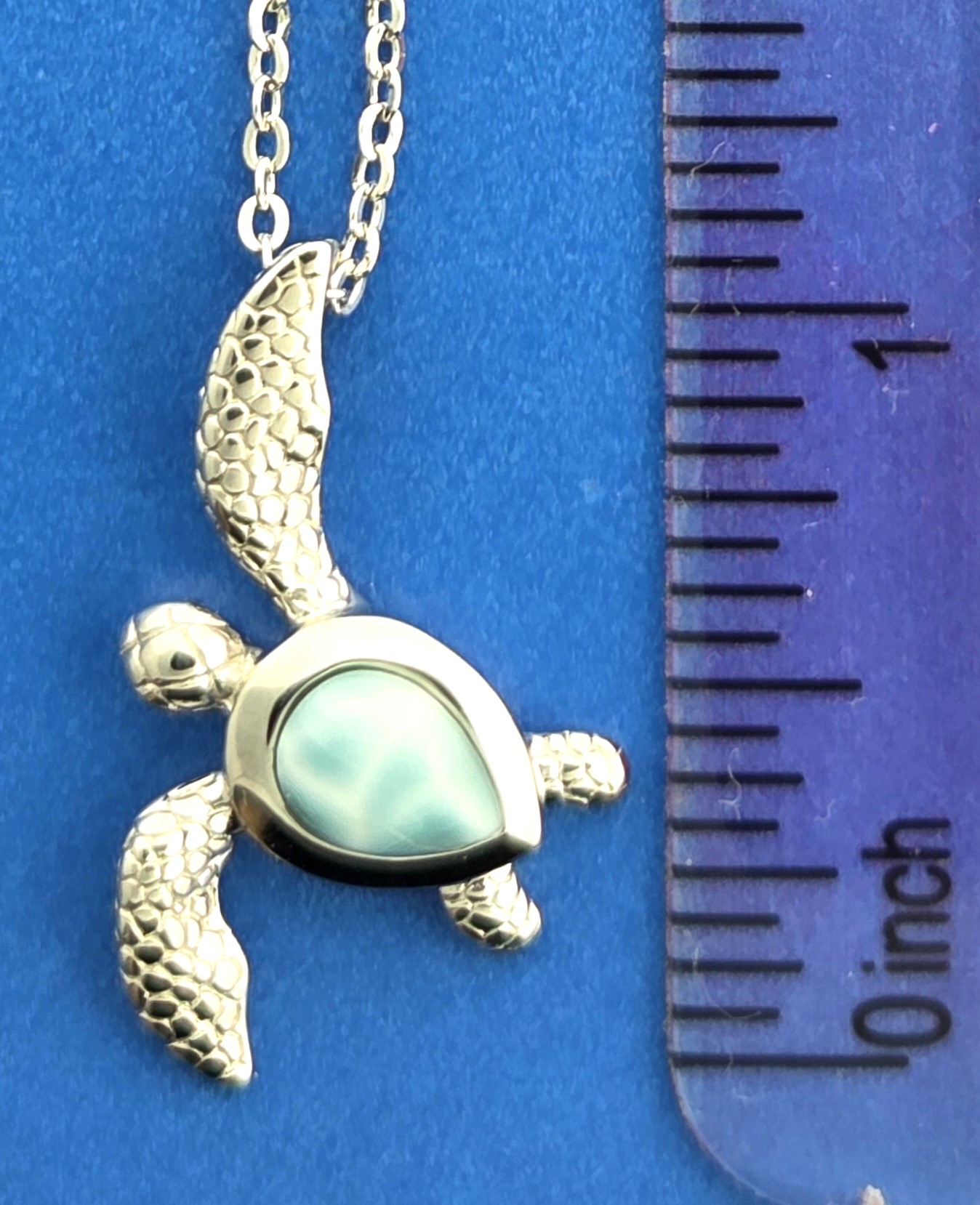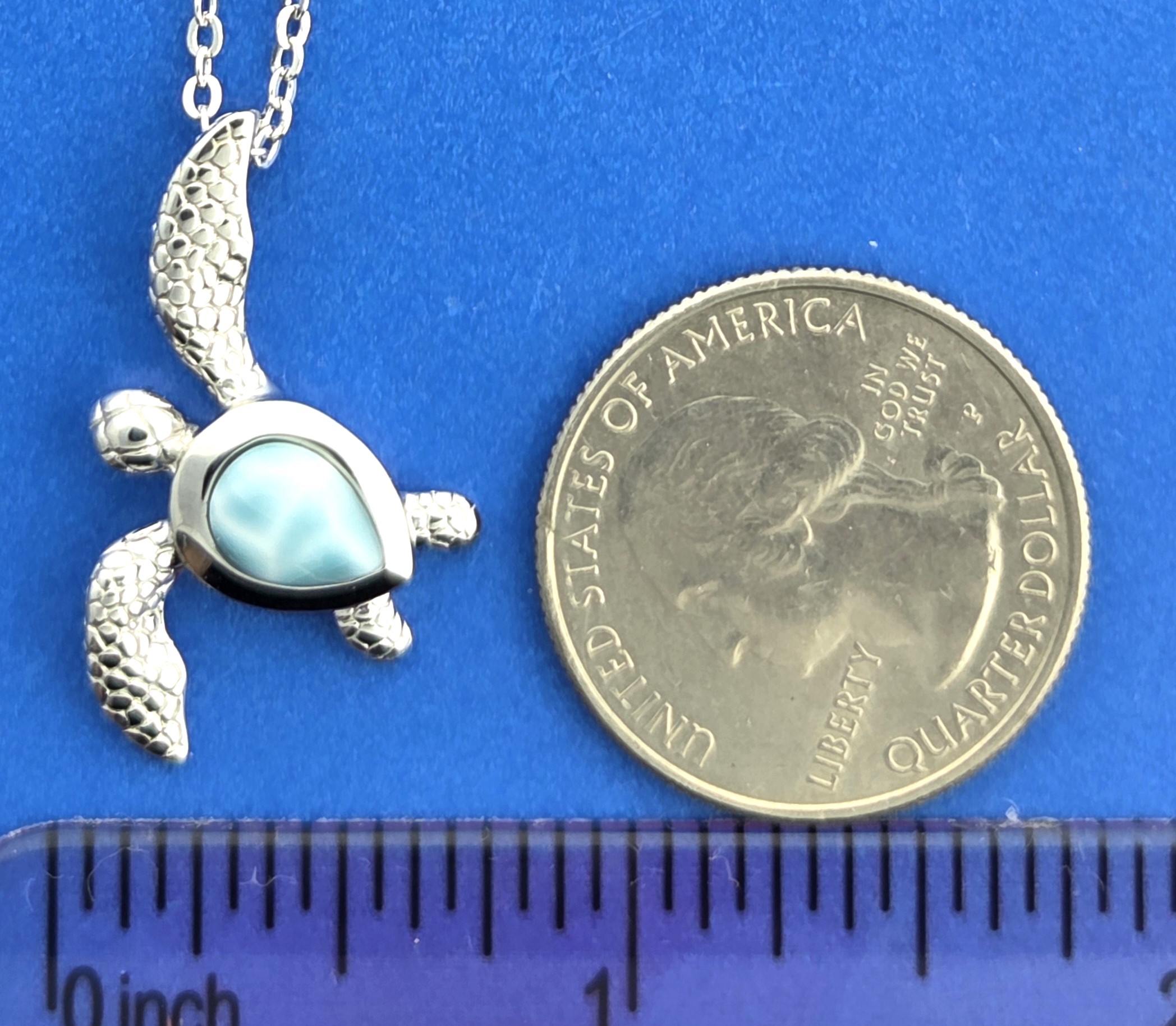 Alamea sterling silver rhodium plated Sea Turtle Pendant with beautiful Ocean Blue Larimar