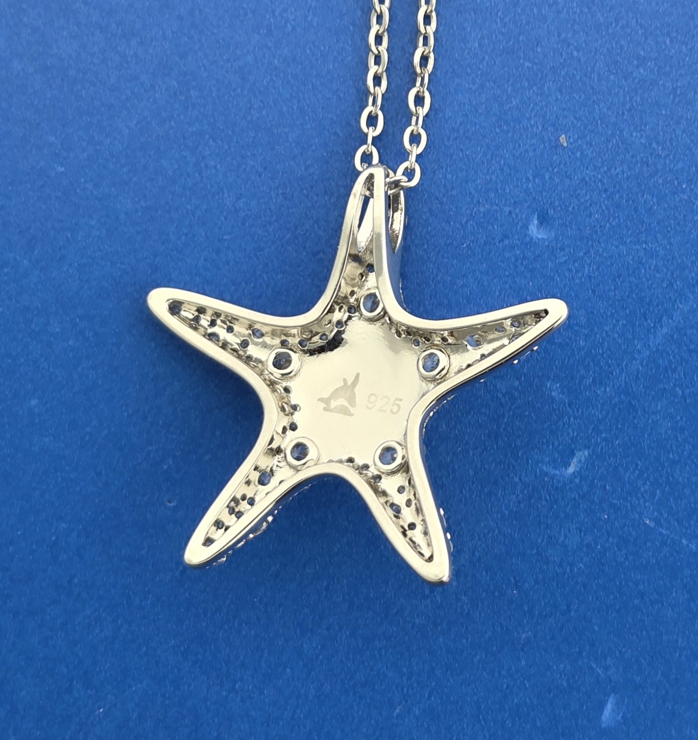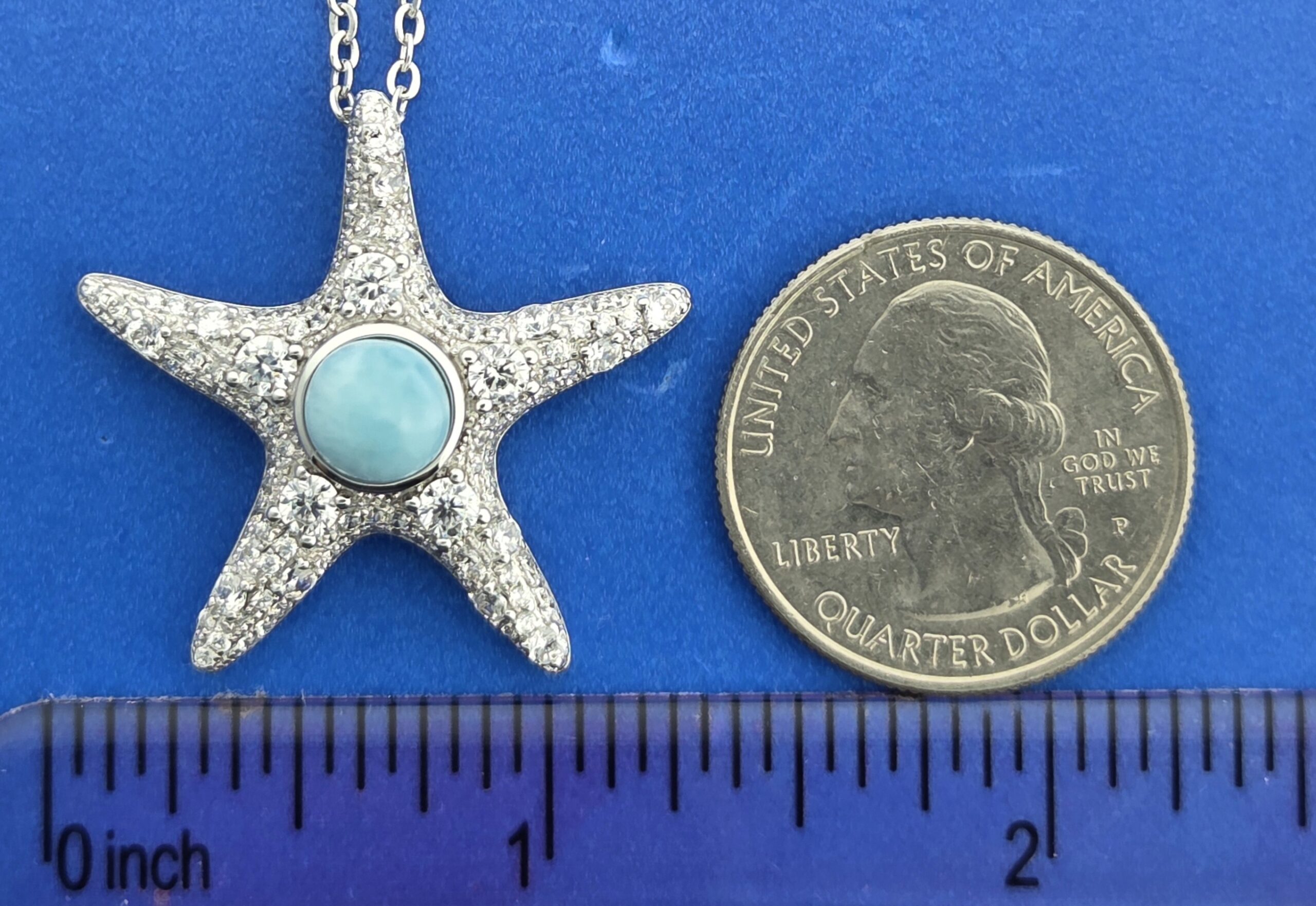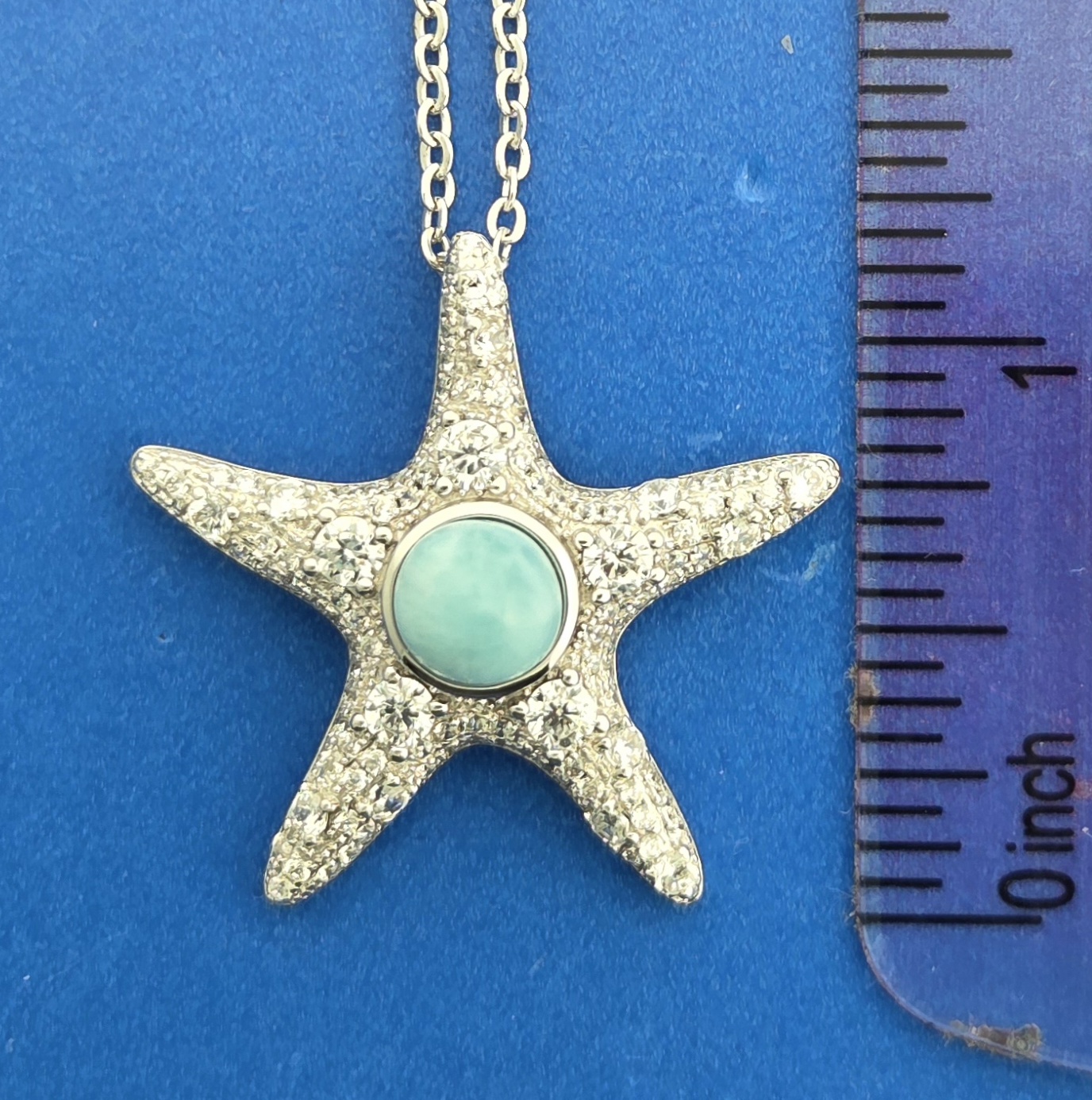 Alamea Starfish pendant with ocean blue larimar in the center & pave’ set clear cz on the starfish; rhodium plated, set with 115 CZ totaling 2.31 ct.