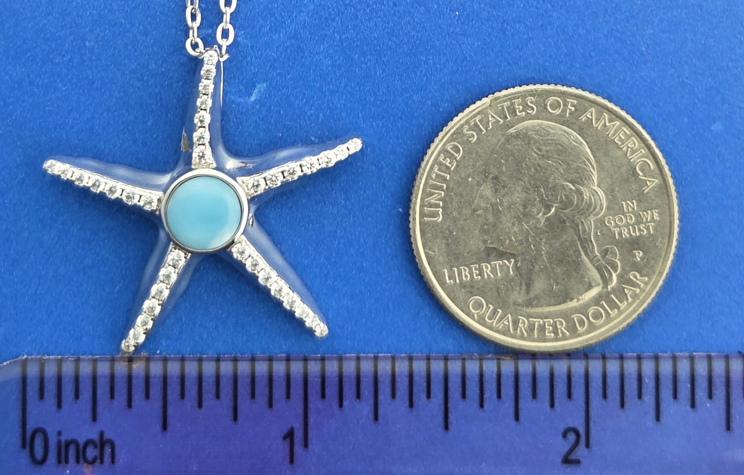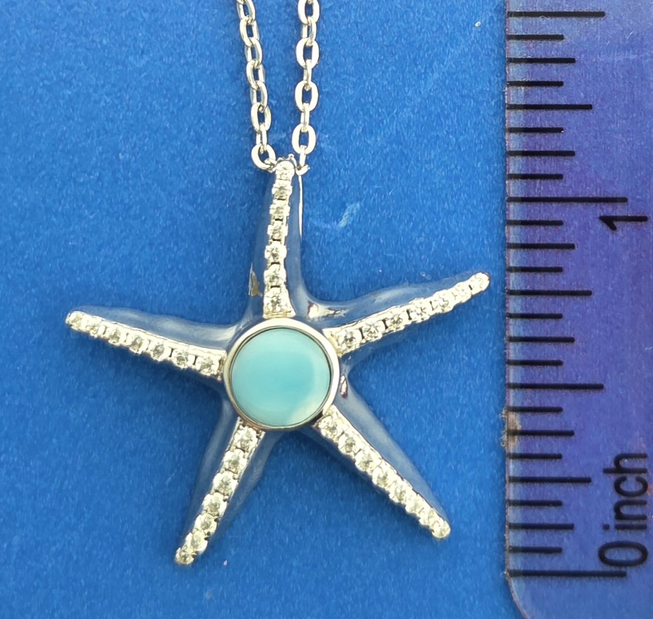 Alamea Starfish pendant with ocean blue larimar in the center & pave’ set clear cz on the starfish legs; rhodium plated, set with 36 CZ totaling 0.68 ct.
