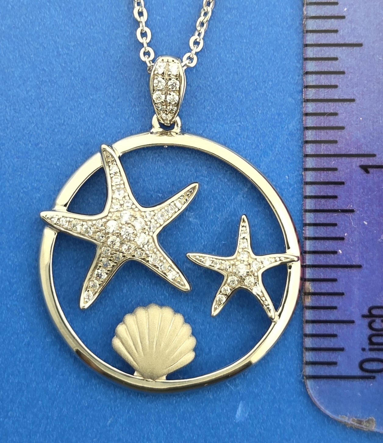 rhodium plated starfish and frame. the seashell has a sand blast finish,