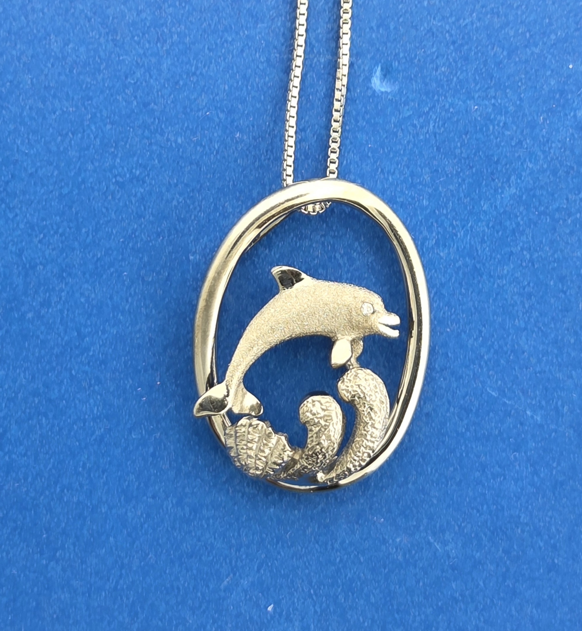 Denny Wong Precious Silver Dolphin Pendant accented with a scallop shell and sea grass. The Dolphin has a round brilliant Diamond in The Eye