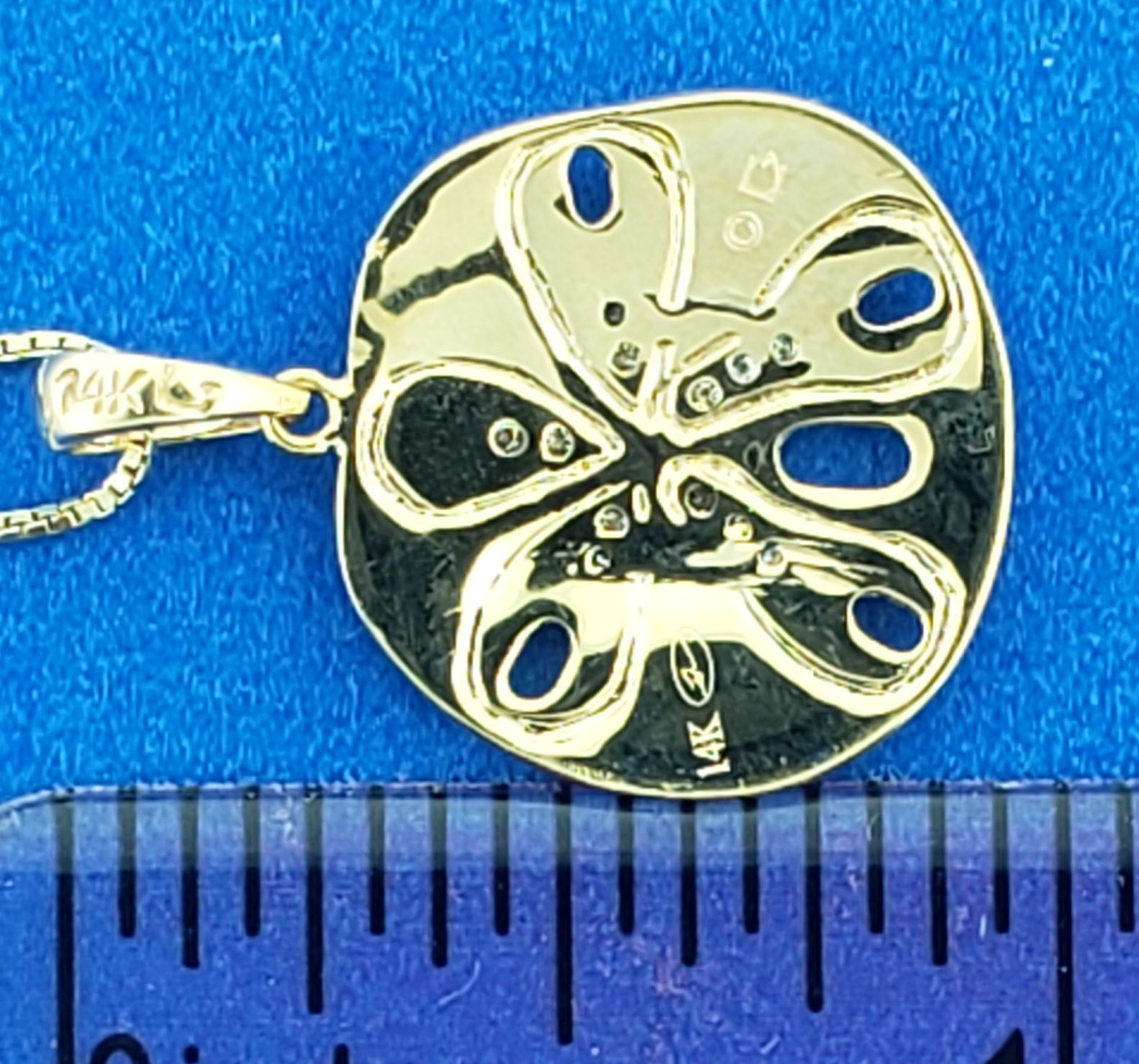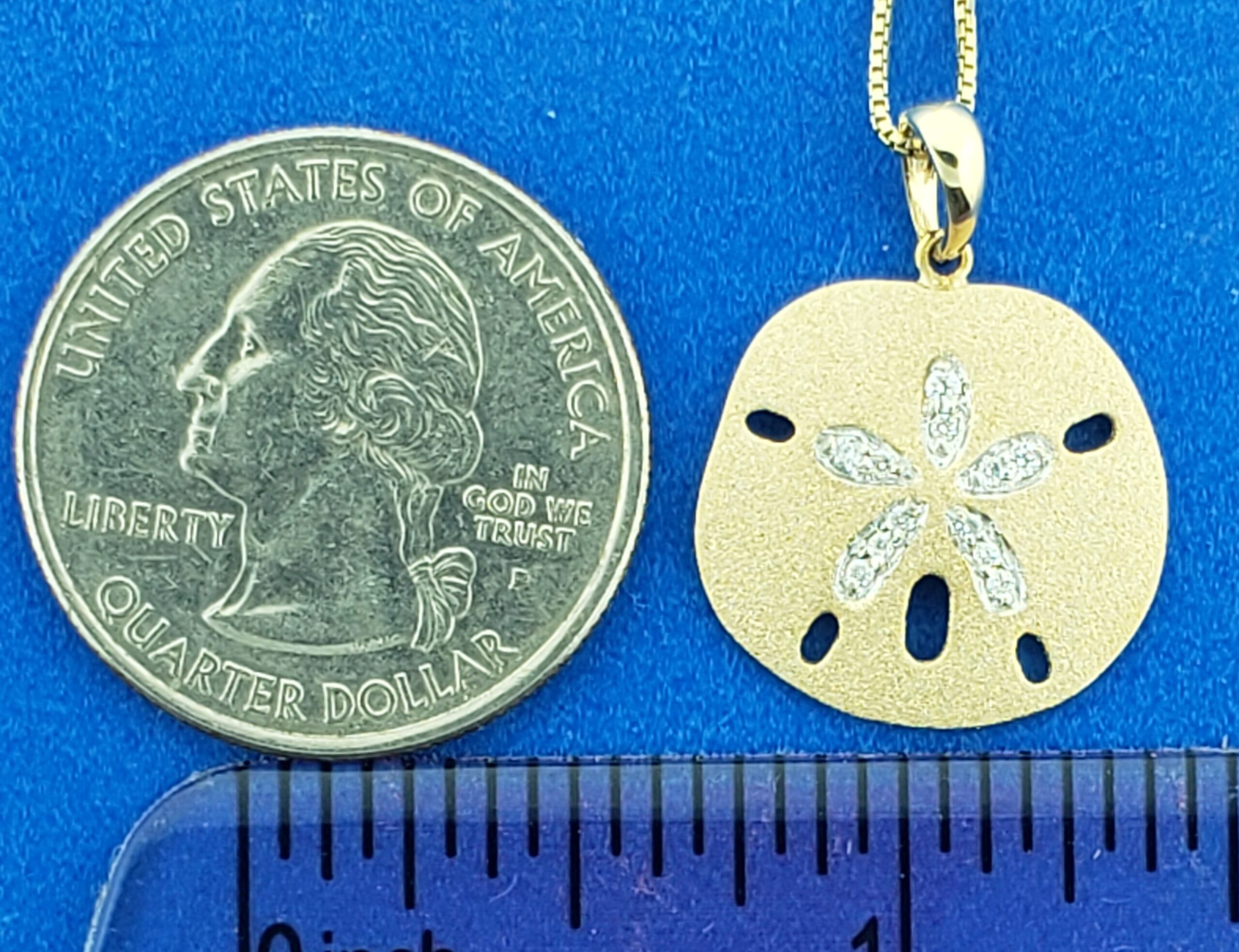 14k yellow gold sand dollar pendant. there are 12 round brilliant bead set diamonds. a micro sand blast finish .09ct twt