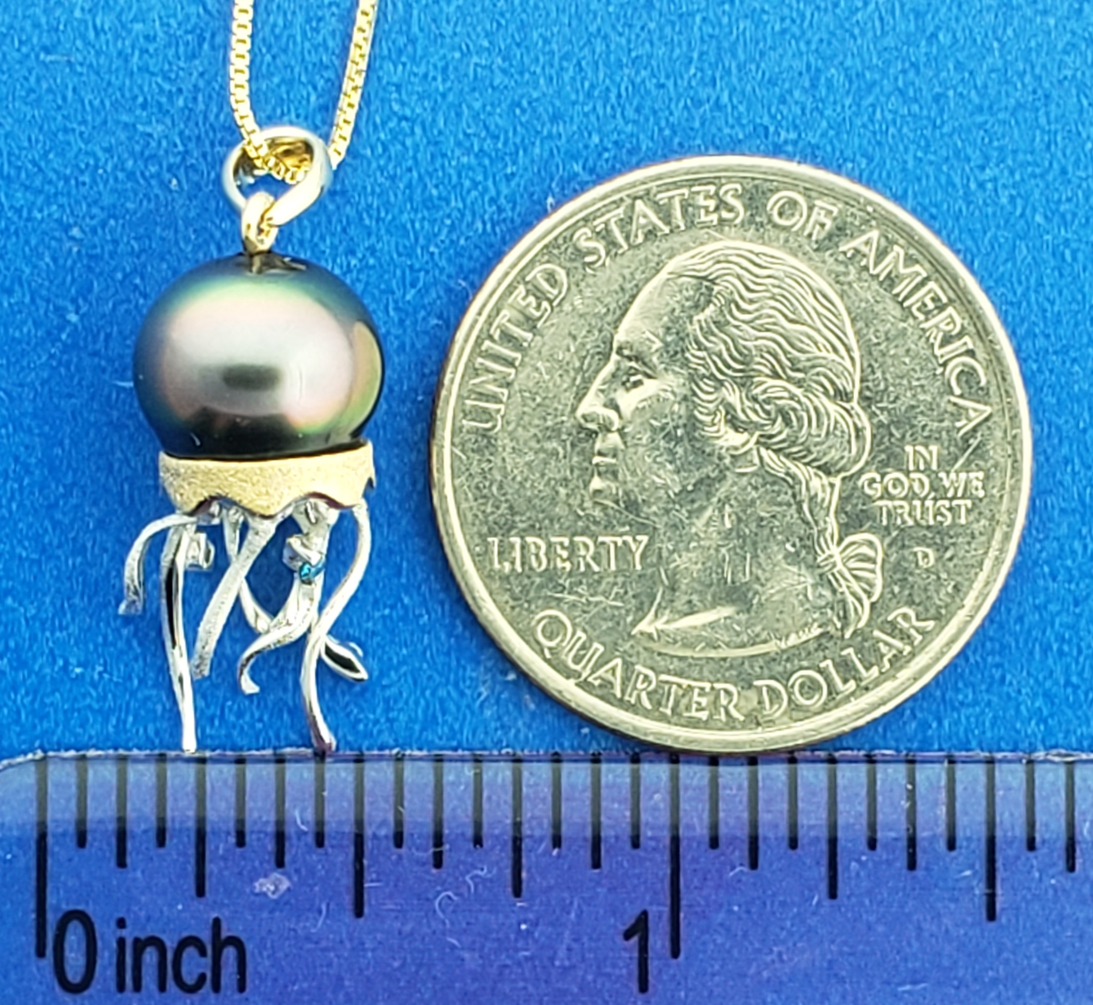 Denny Wong 14k Jellyfish Pendant, Moveable Tentacles and Accented with Multi-Colored Diamonds, Natural Color Black Tahitian Pearl,
