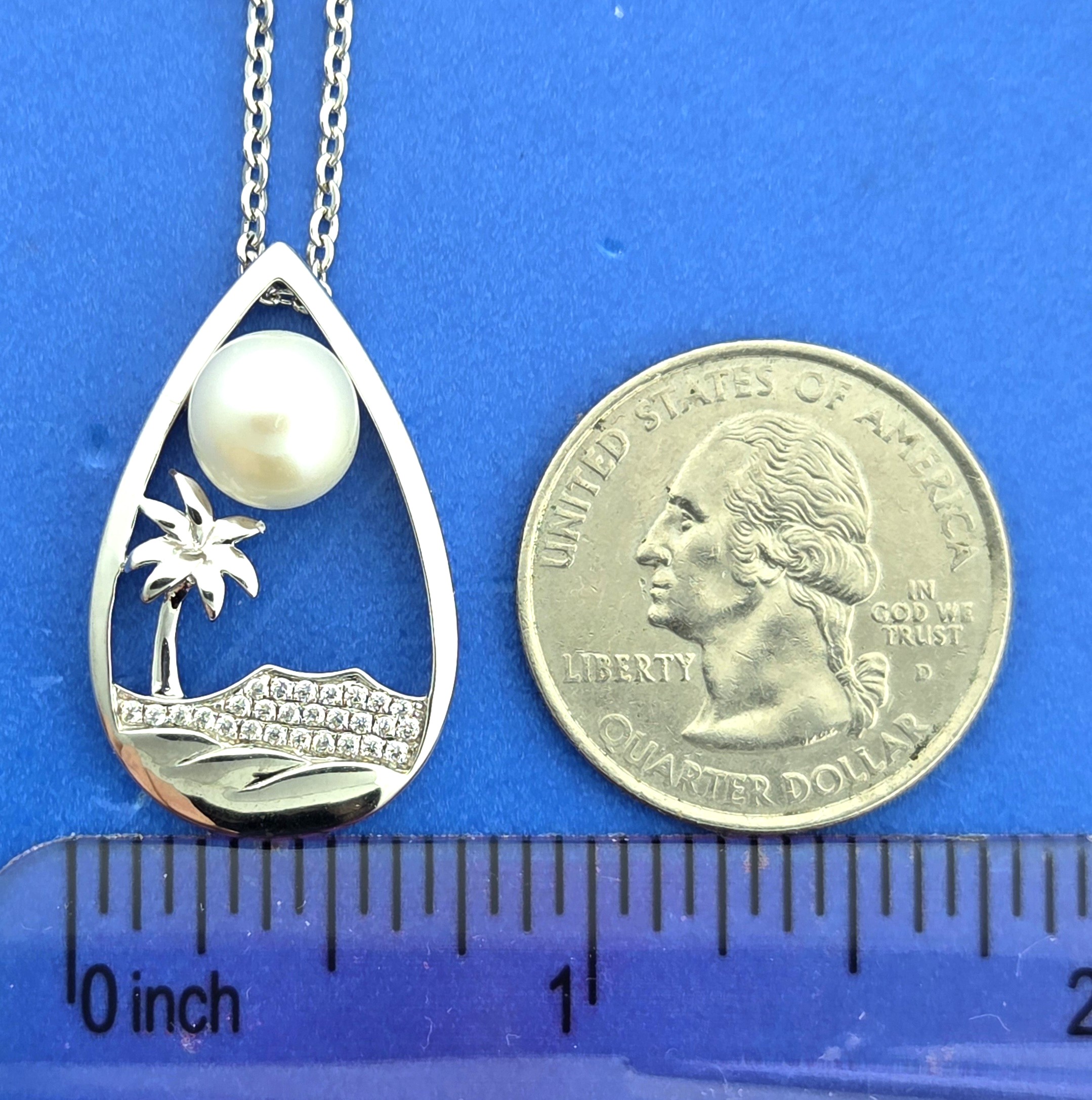 Alamea sterling silver Hawaii’s Diamond Head pendant, pave’ set clear czs, genuine 8mm freshwater pearl,