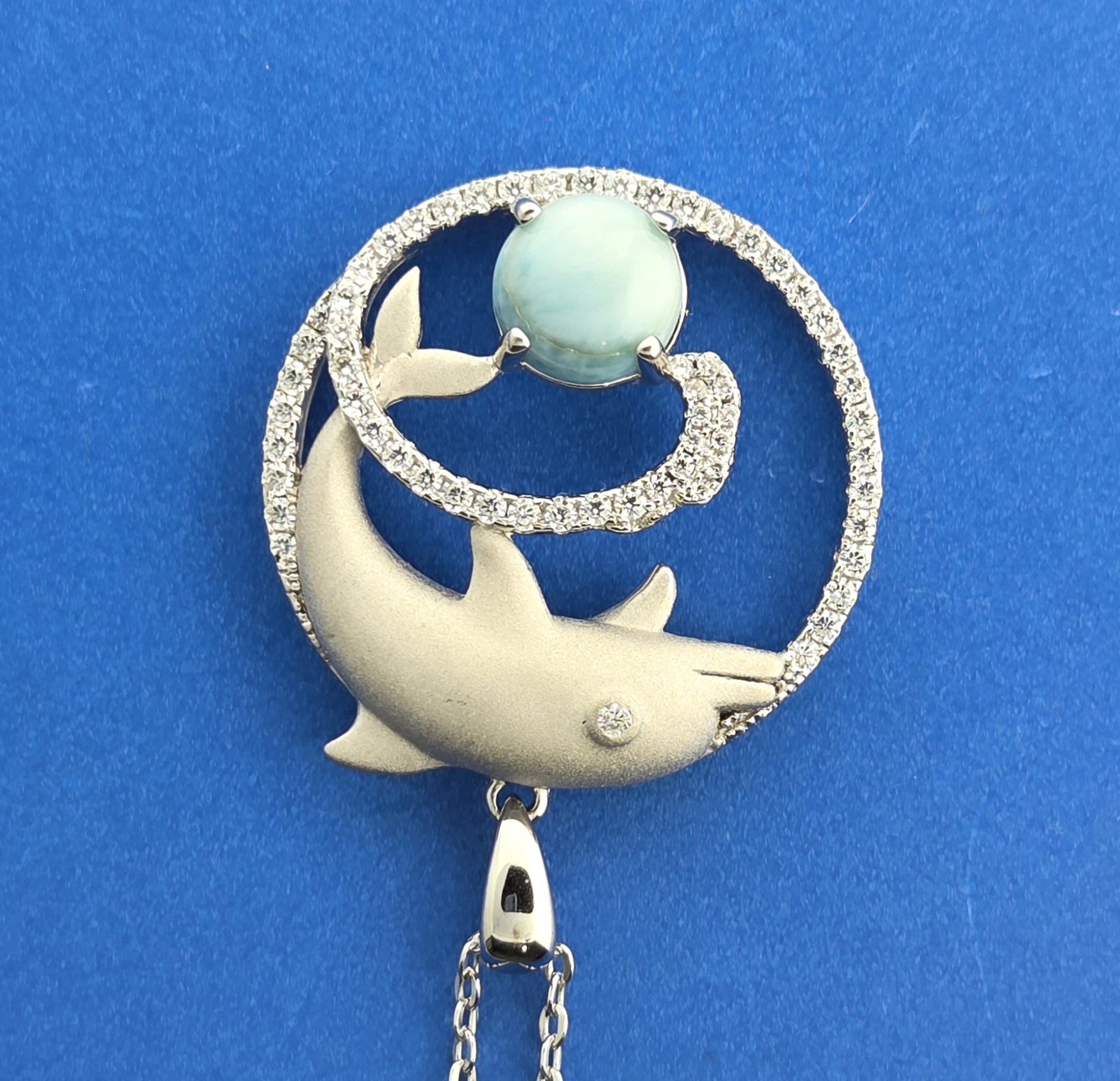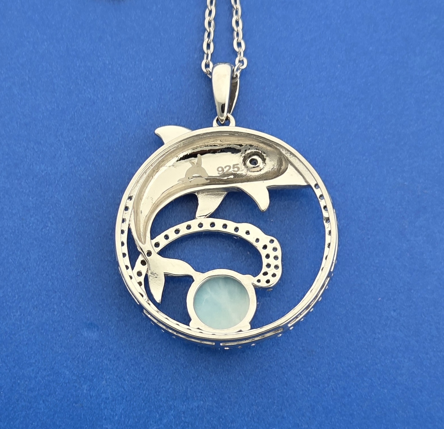Alamea sterling silver Dolphin pendant with a beautiful ocean blue natural Larimar cab,