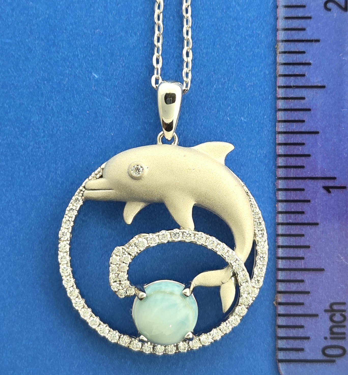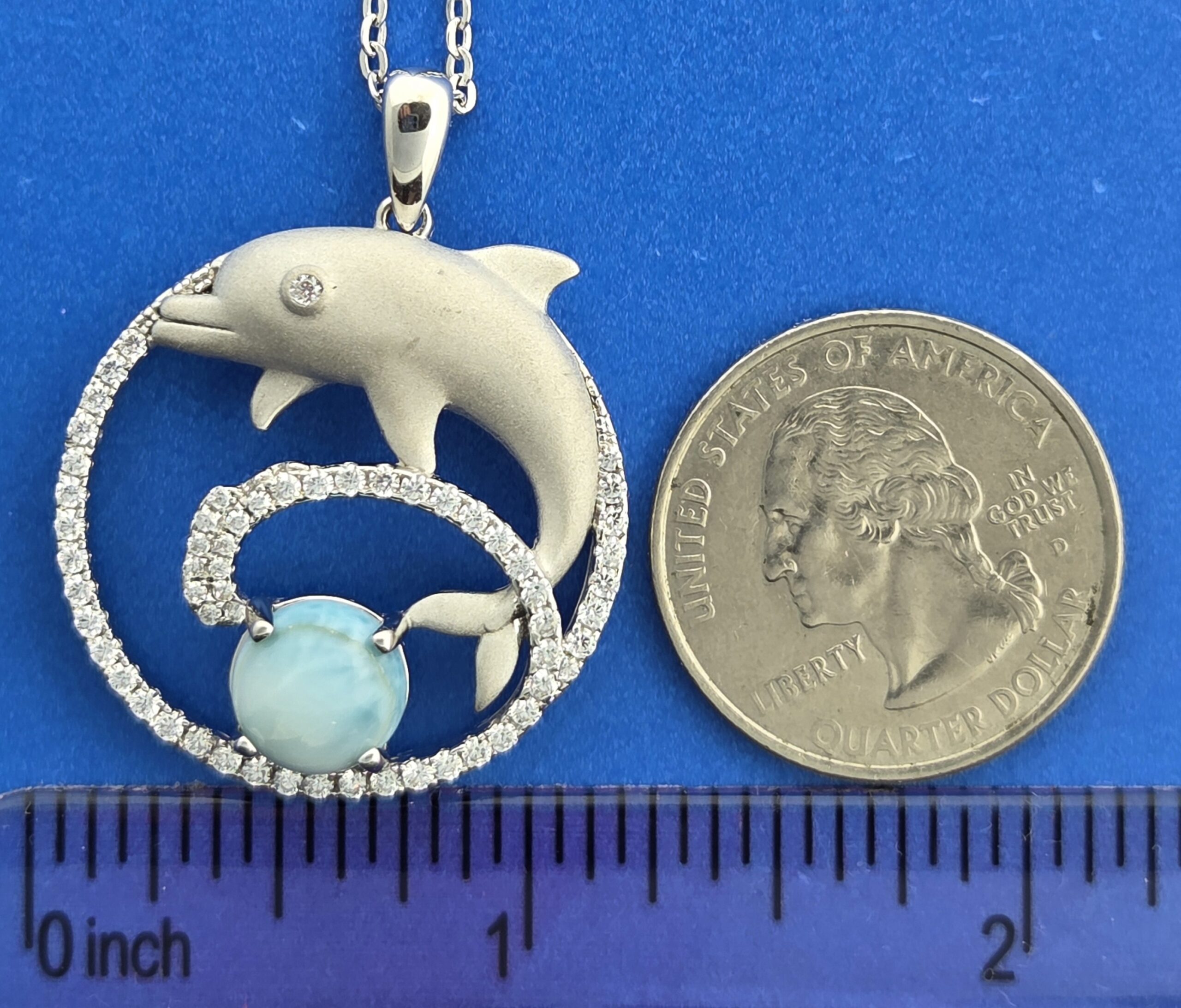 29mm wide x 29mm tall, the dolphin has a cz in the eye and a sand blast finish the rest is Rhodium plated, cz accents