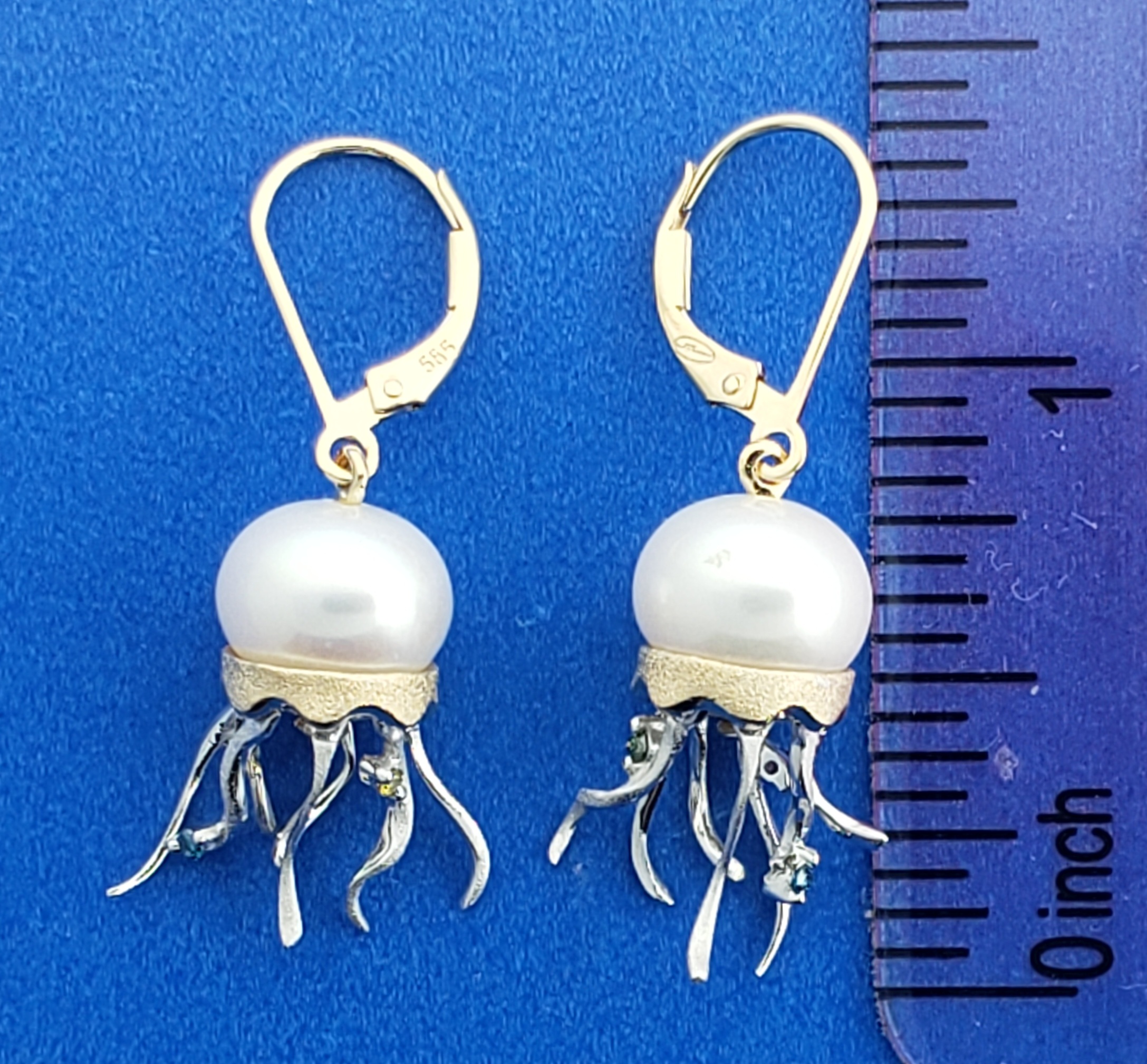 Denny Wong Jelly Fish Earrings Jellyfish Have 9mm White Fresh Water Pearl heads in a 14K Yellow Gold Setting and White Gold Moveable Tentacles Set with Colored Diamonds, 2-Blue diamonds .02Ct, 2-Golden diamonds .02Ct, 2-Pink diamonds.02Ct, 2-9mm Fresh Water Pearls