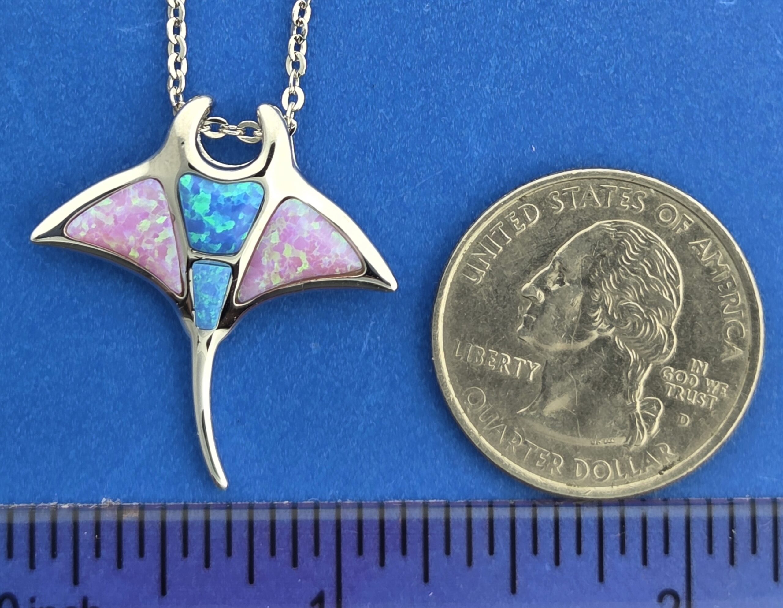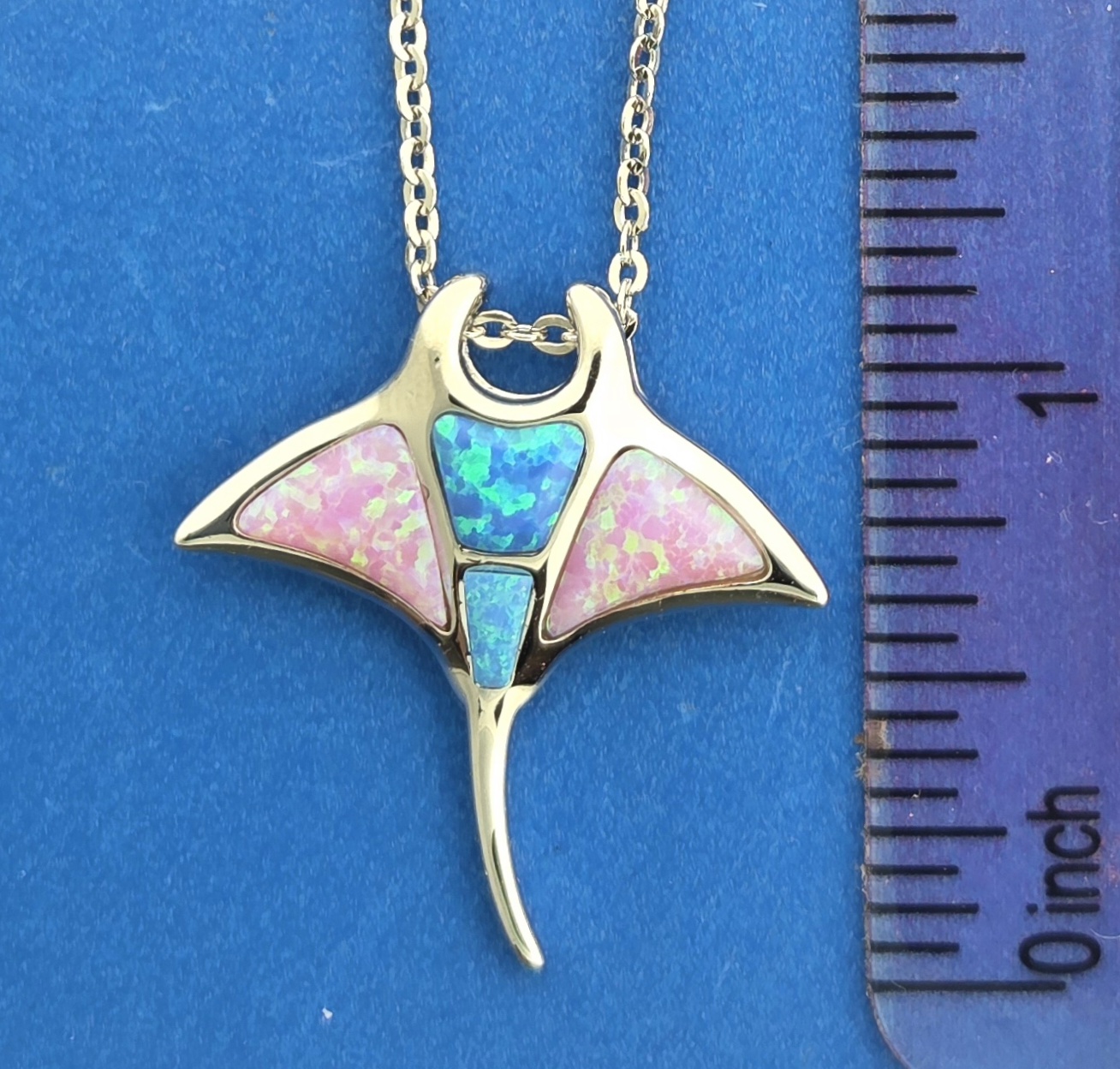 Alamea sterling silver Manta Ray Pendant, accentuated with brilliant blue and pink lab created opals. Rhodium plated,