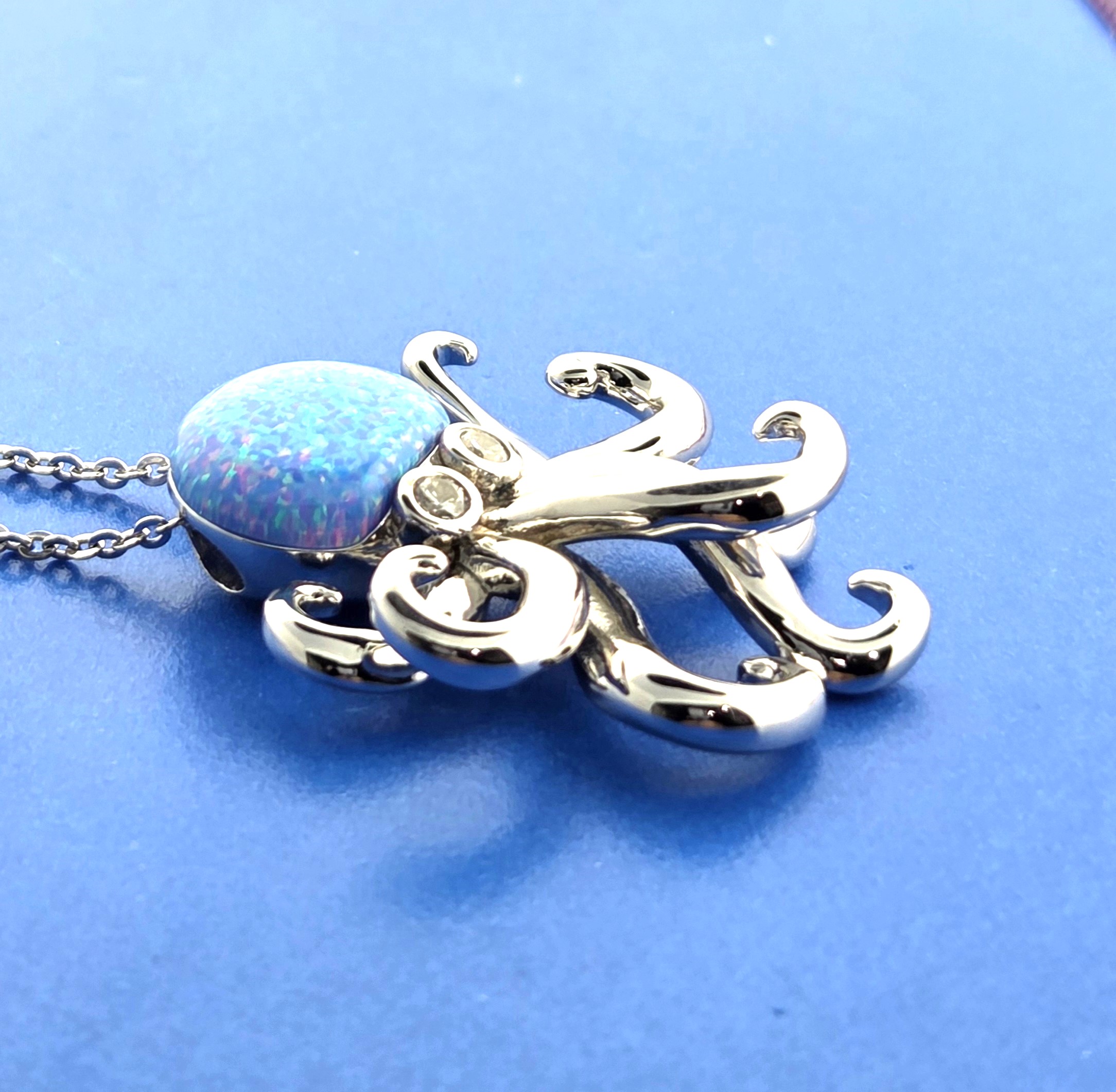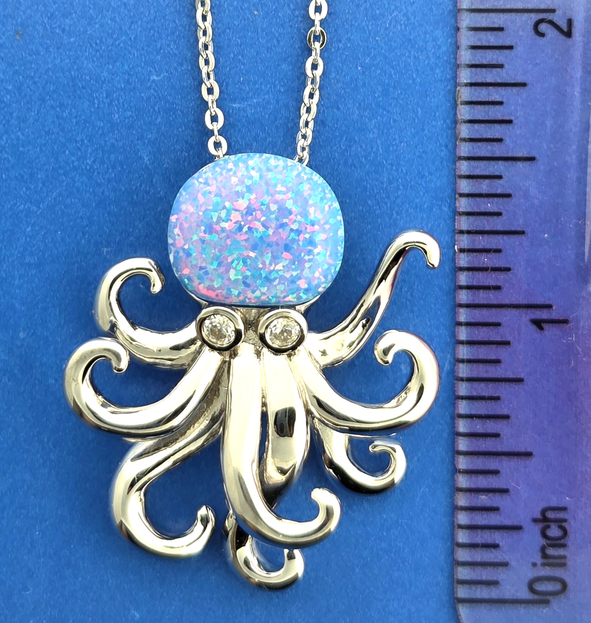 Alamea sterling silver octopus pendant, the head is made of beautiful iridescent Lab Created Opal, it has clear cz eyes and is rhodium plated