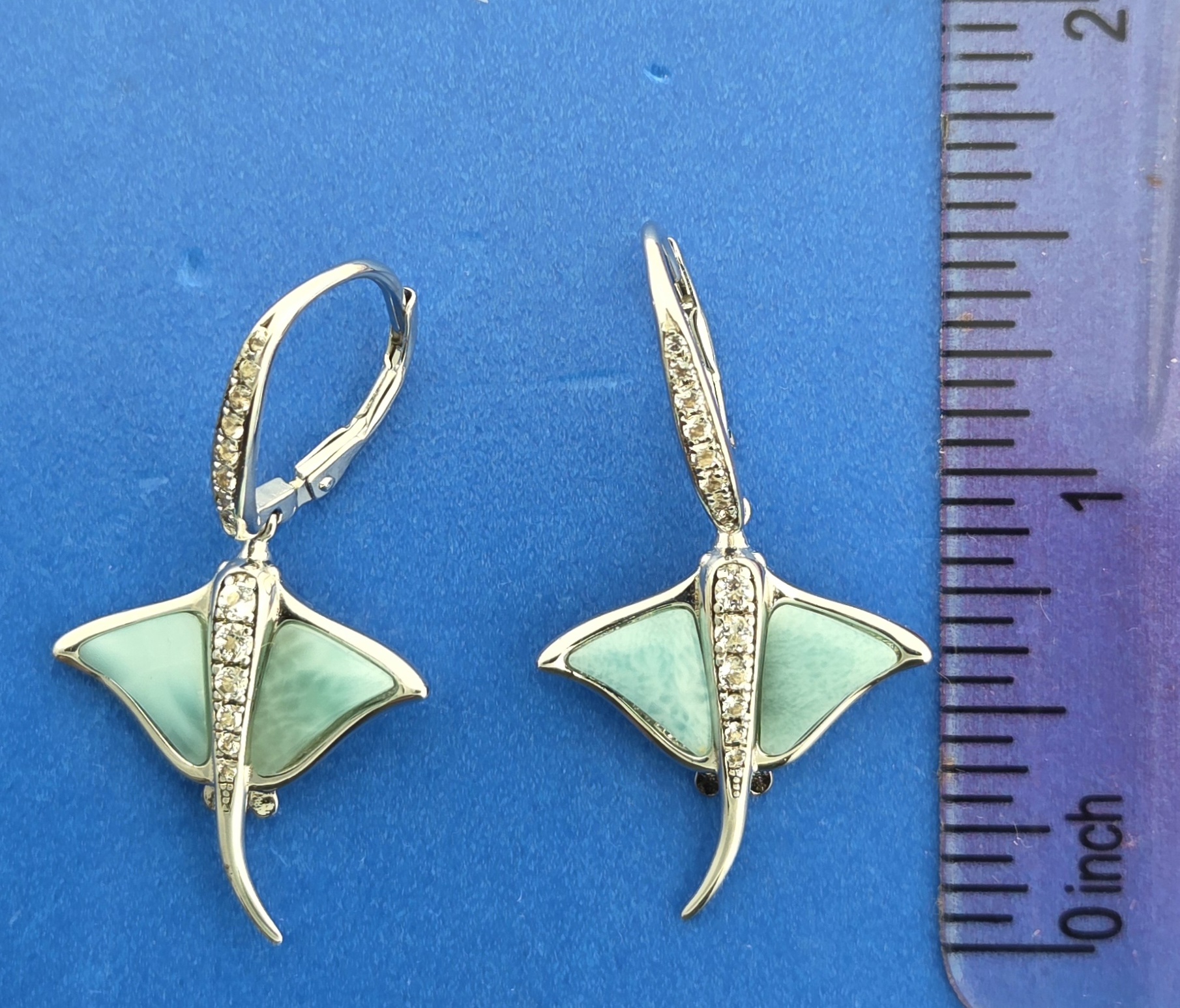 Alamea sterling silver dangle lever back stingray earrings, ocean blue genuine Larimar, rhodium plated, clear genuine white topaz on the stingray spine and on the lever backs