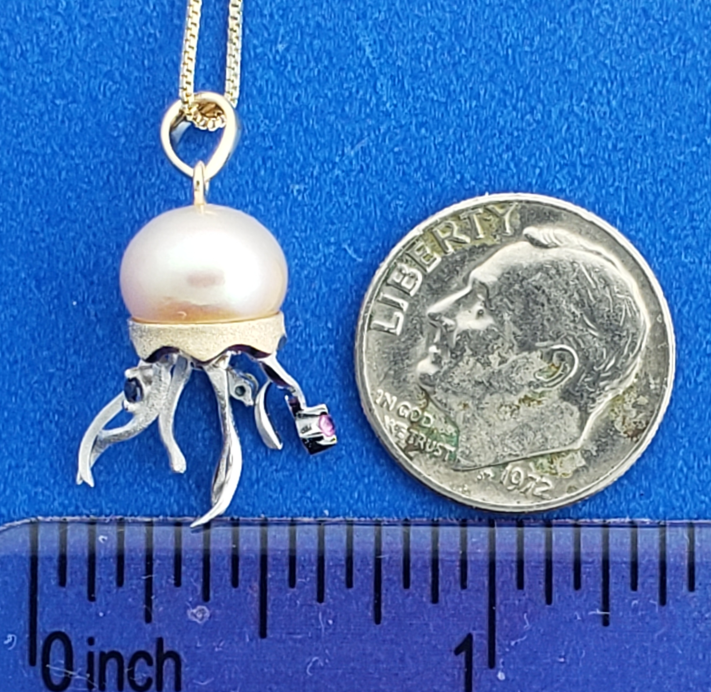 Denny Wong Jellyfish 14k 2-tone pendant, the smaller of the 2 sizes, 9mm white freshwater pearl, moveable white gold tentacles accented with diamonds, blue diamond .01ct, red diamond .01ct, yellow diamond .01ct