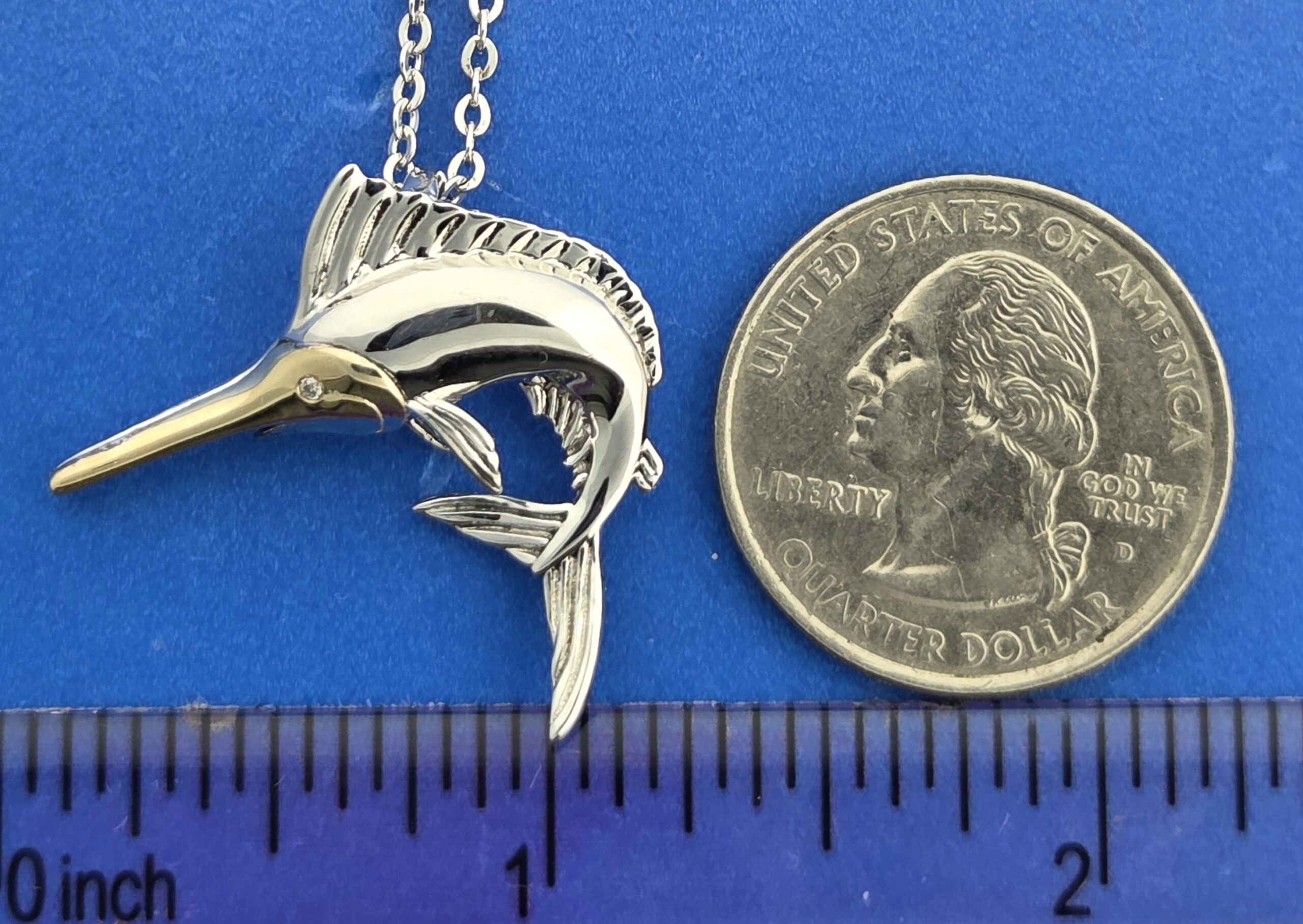 Alamea sterling silver 2-tone Marlin Pendant. Sterling Silver 3D Body & 14K Gold Head. rhodium finish on the body. 1 .01ct diamond In the Eye,