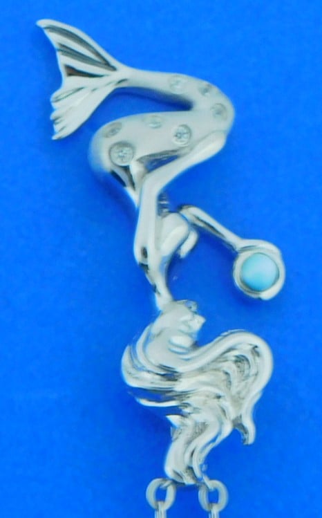 sterling silver rhodium plated mermaid holding an ocean blue Larimar gem. Accented with bead set clear czs in the lower body