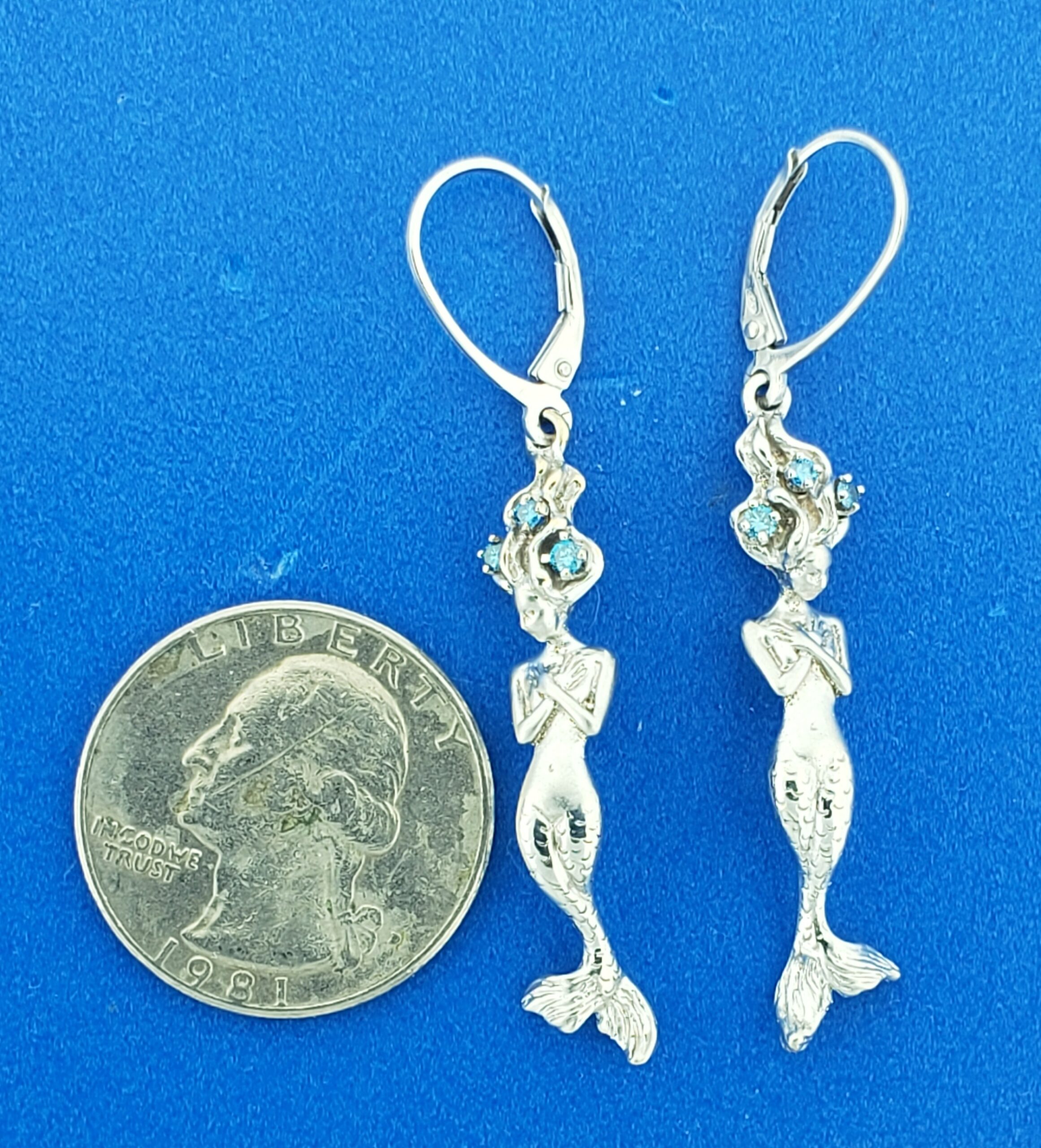 Steven Douglas 14k solid white gold 3-d mermaid lever back dangle earrings. accented with 3 blue diamonds in the hair of each mermaid,