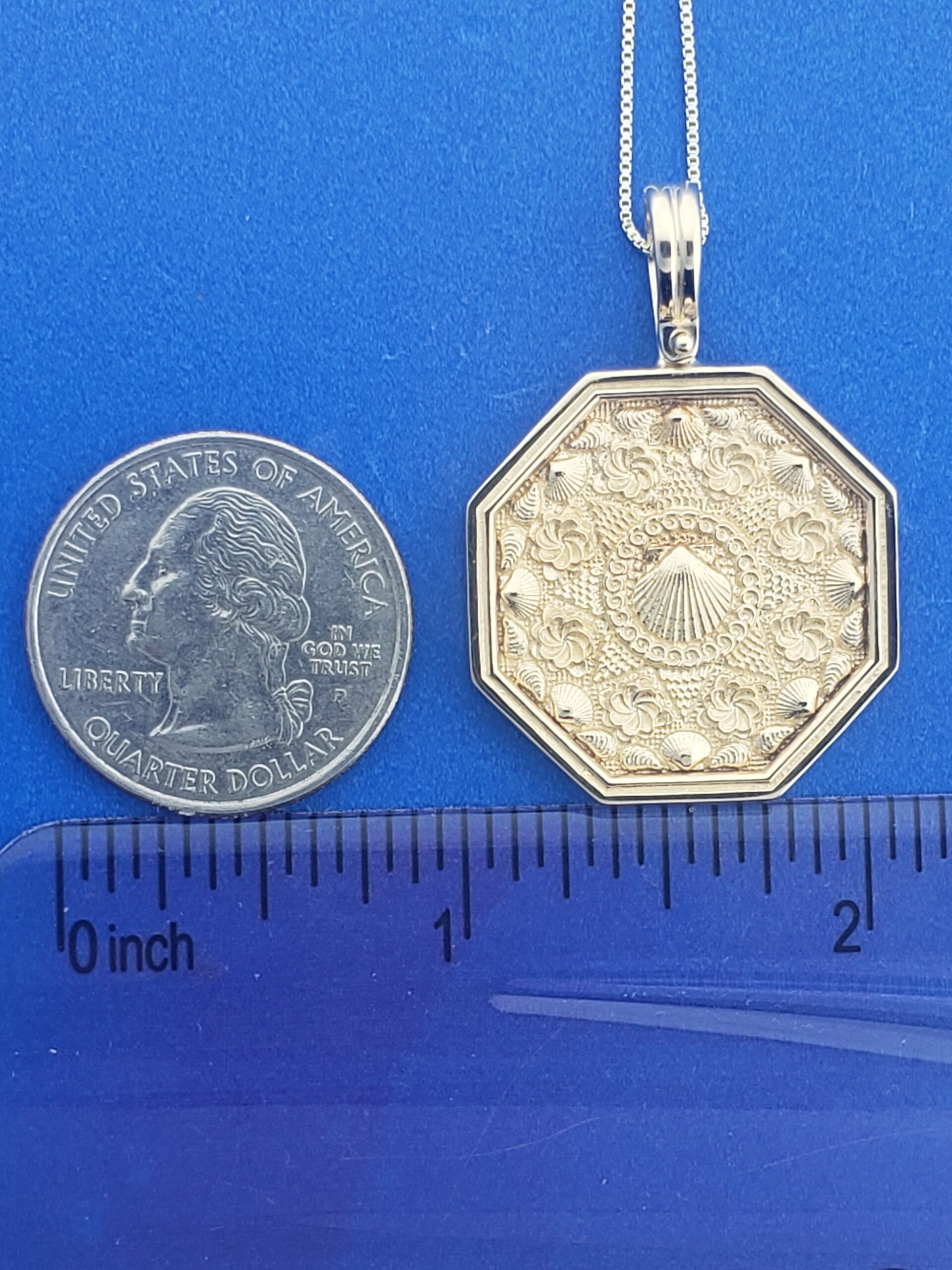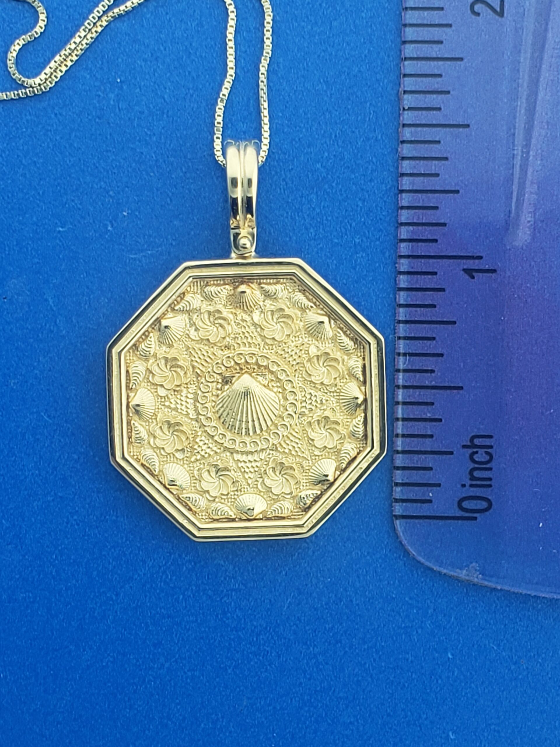 14k solid gold sailor’s valentine pendant. Scallop shells around the border with a scallop shell in the center Moveable shackle bale, 27mm wide x 39mm tall, Large size