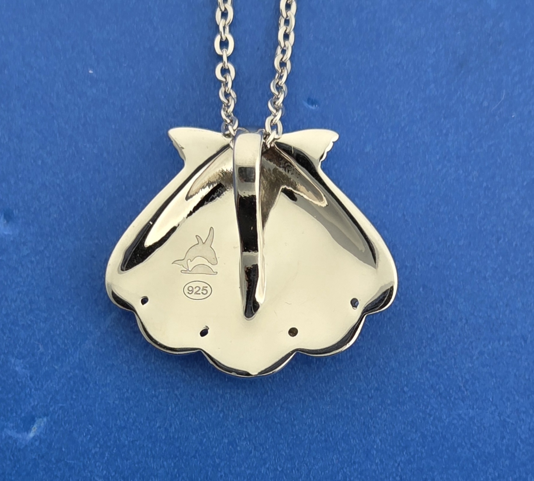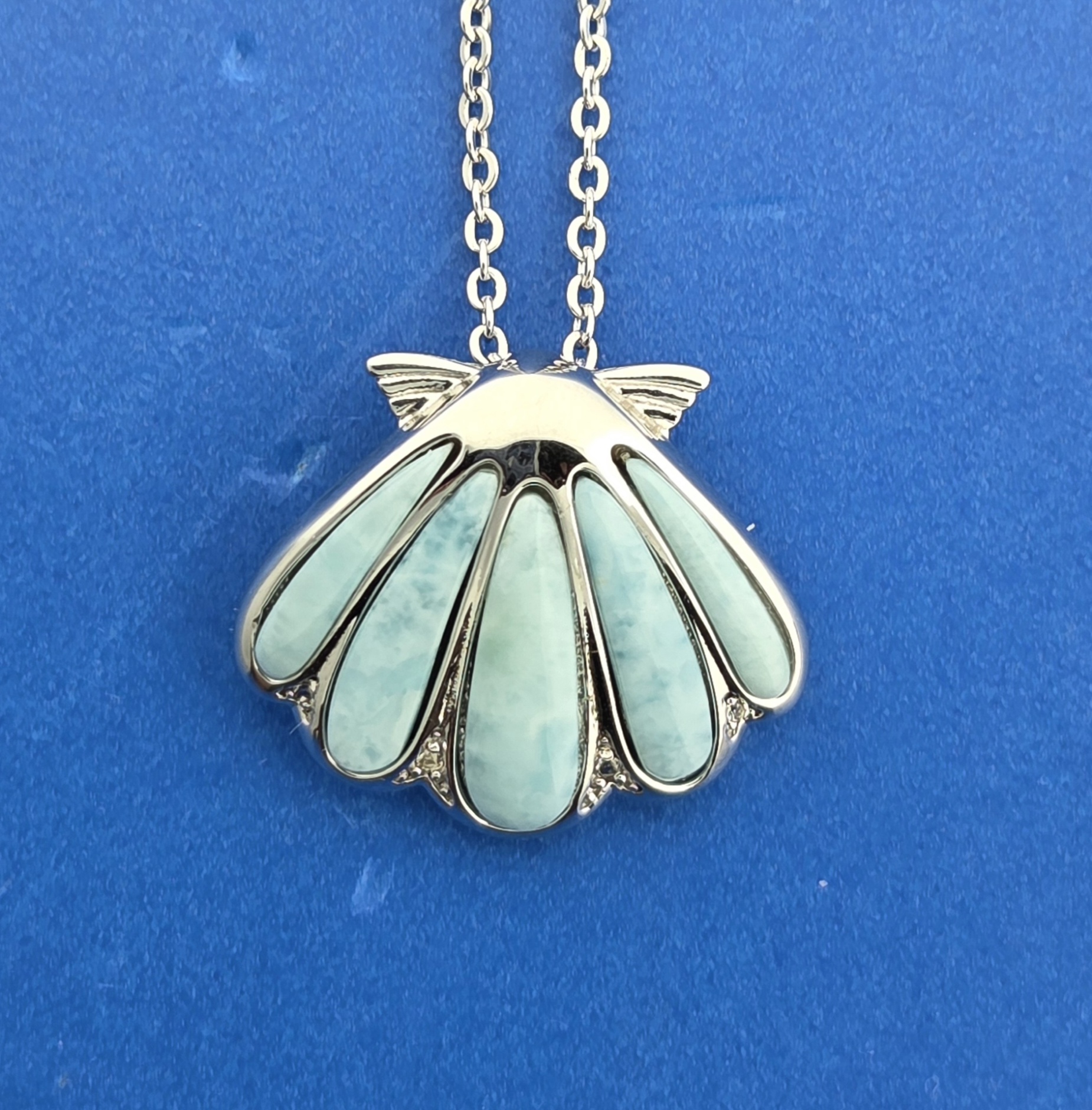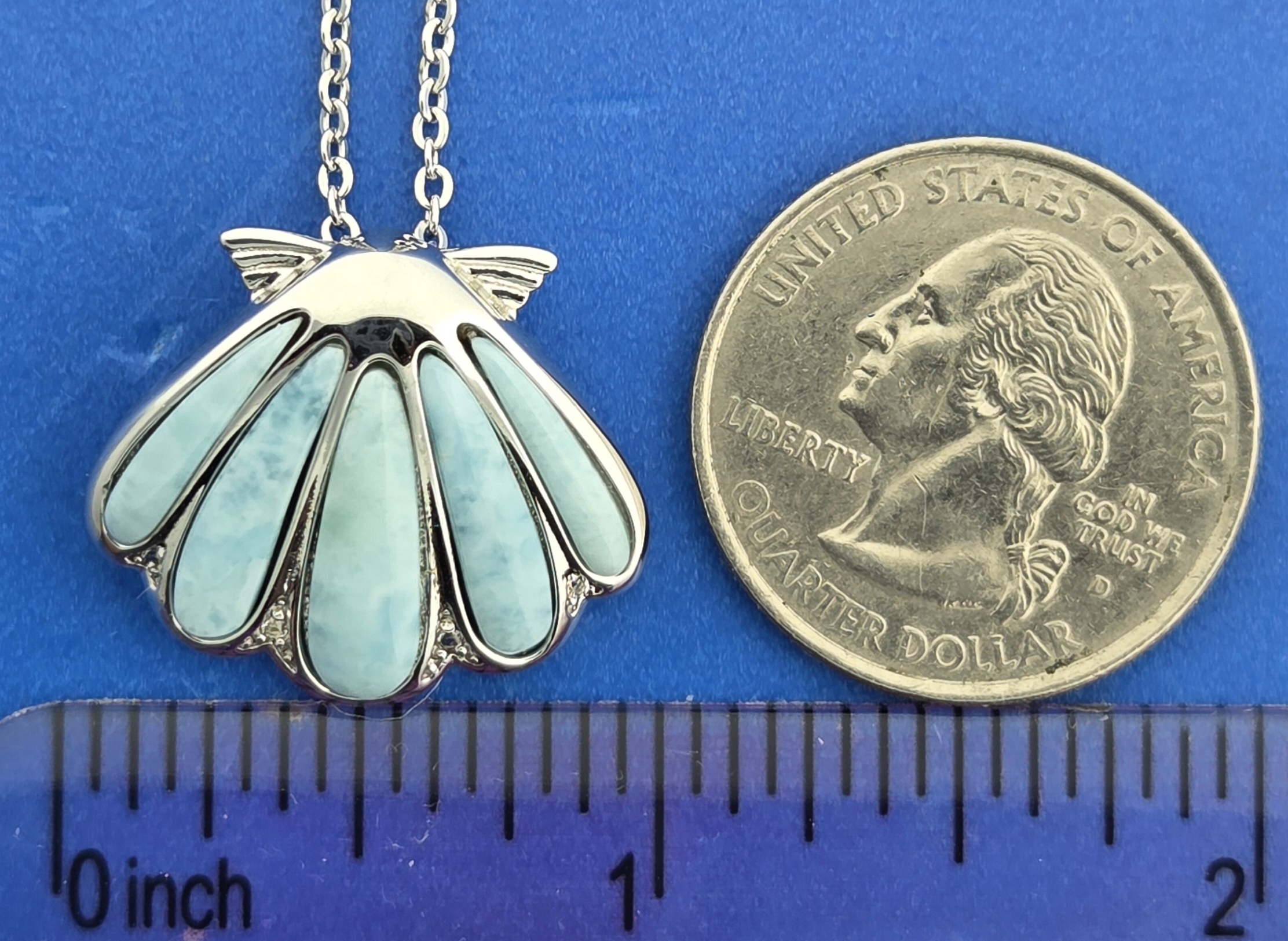 Alamea Sterling Silver Sunrise shell pendant with Larimar ridges & white Topaz on the bottom of the shell. Rhodium Plated