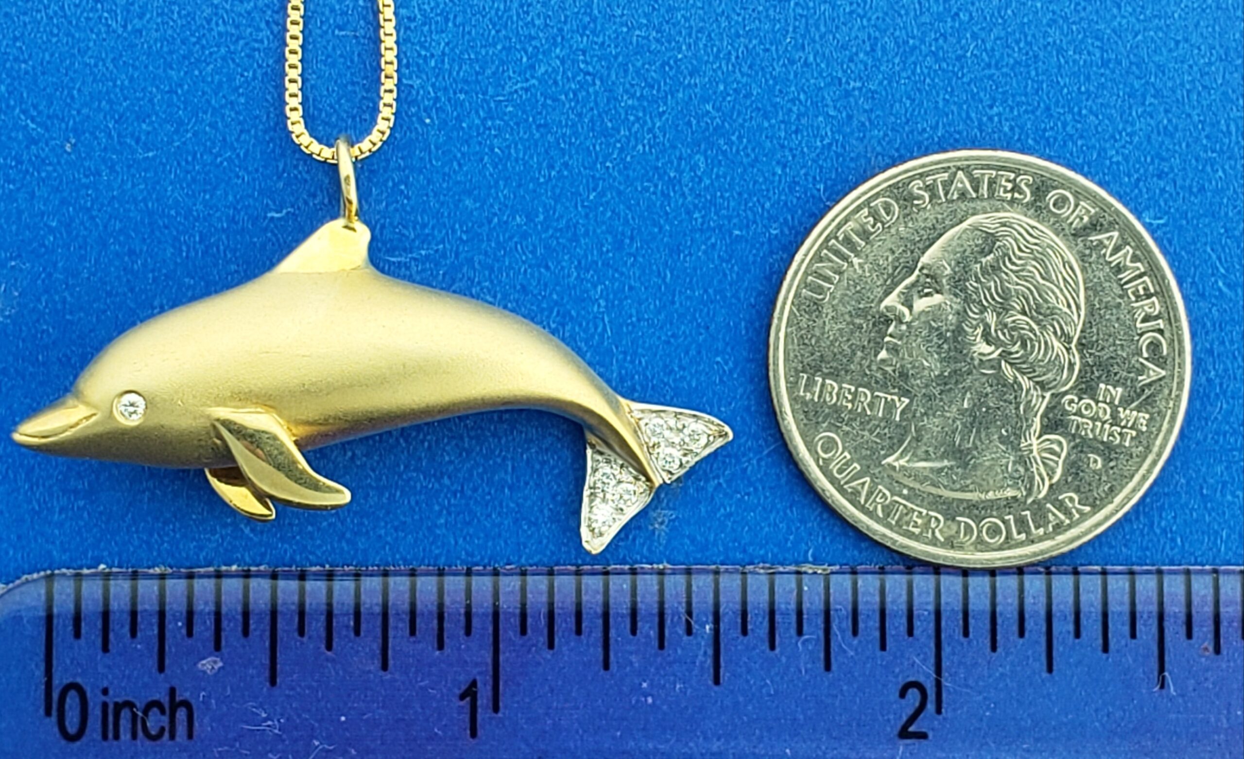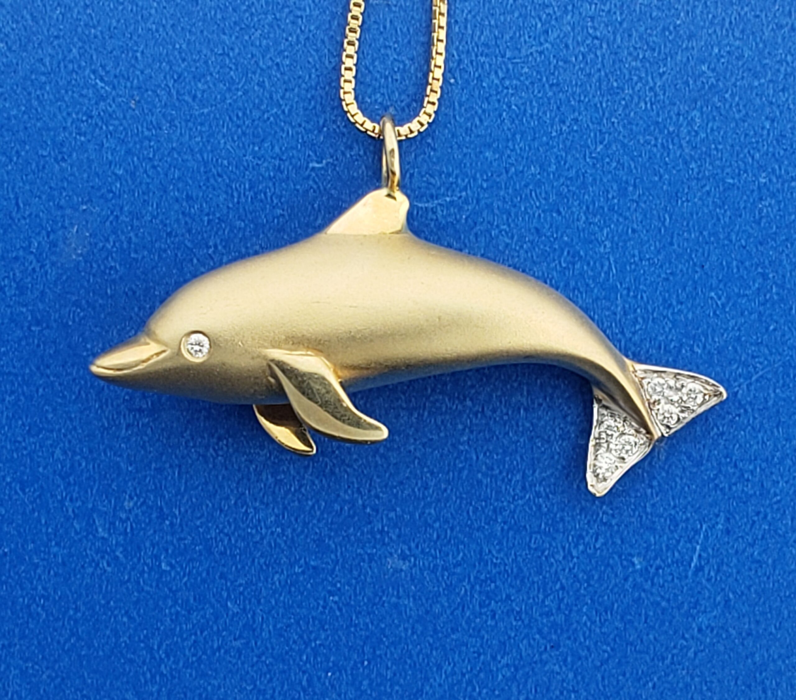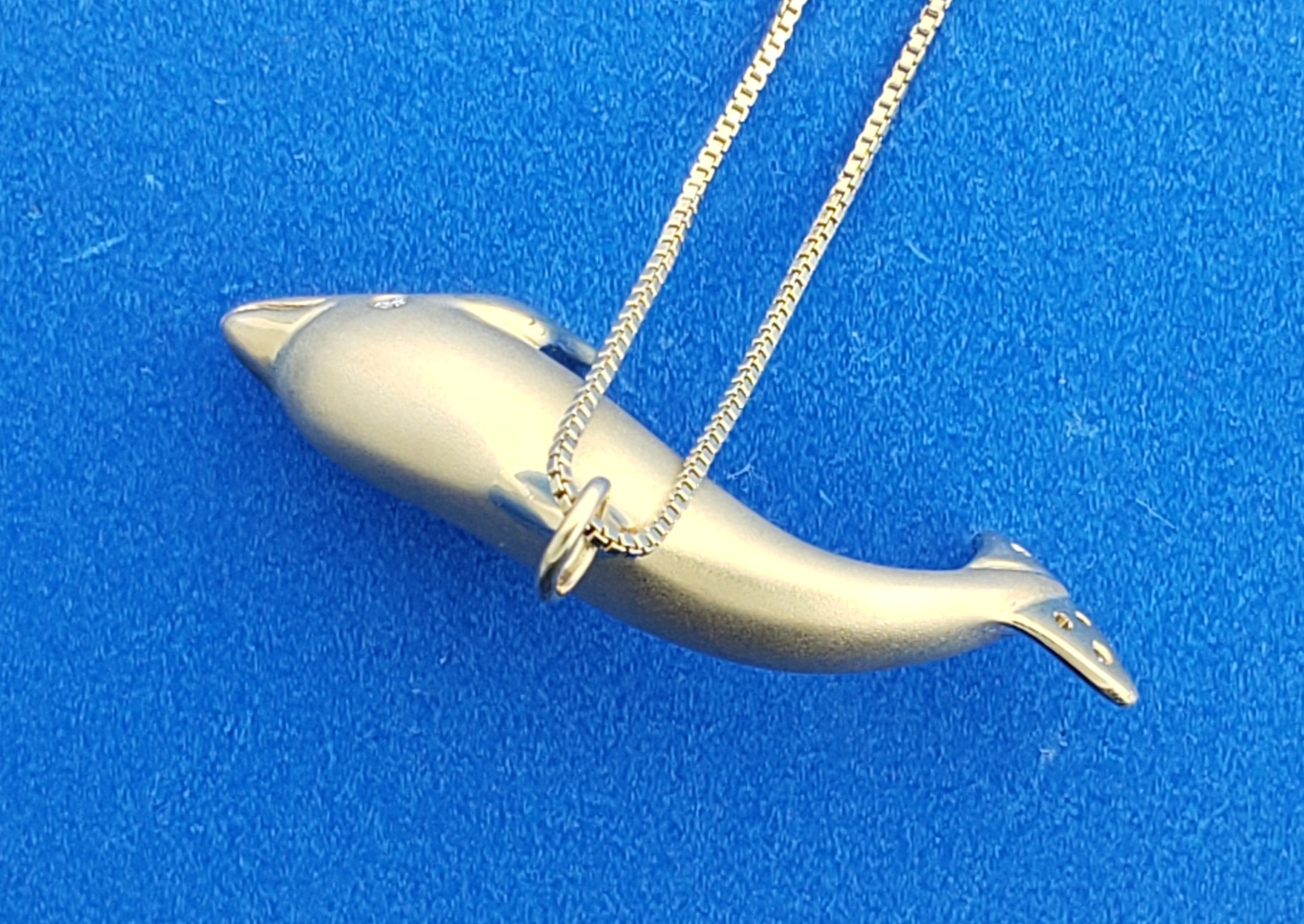 Steven Douglas Dolphin pendant with diamonds in the eye and pave’ diamonds on the fluke, delicate sand blast finish