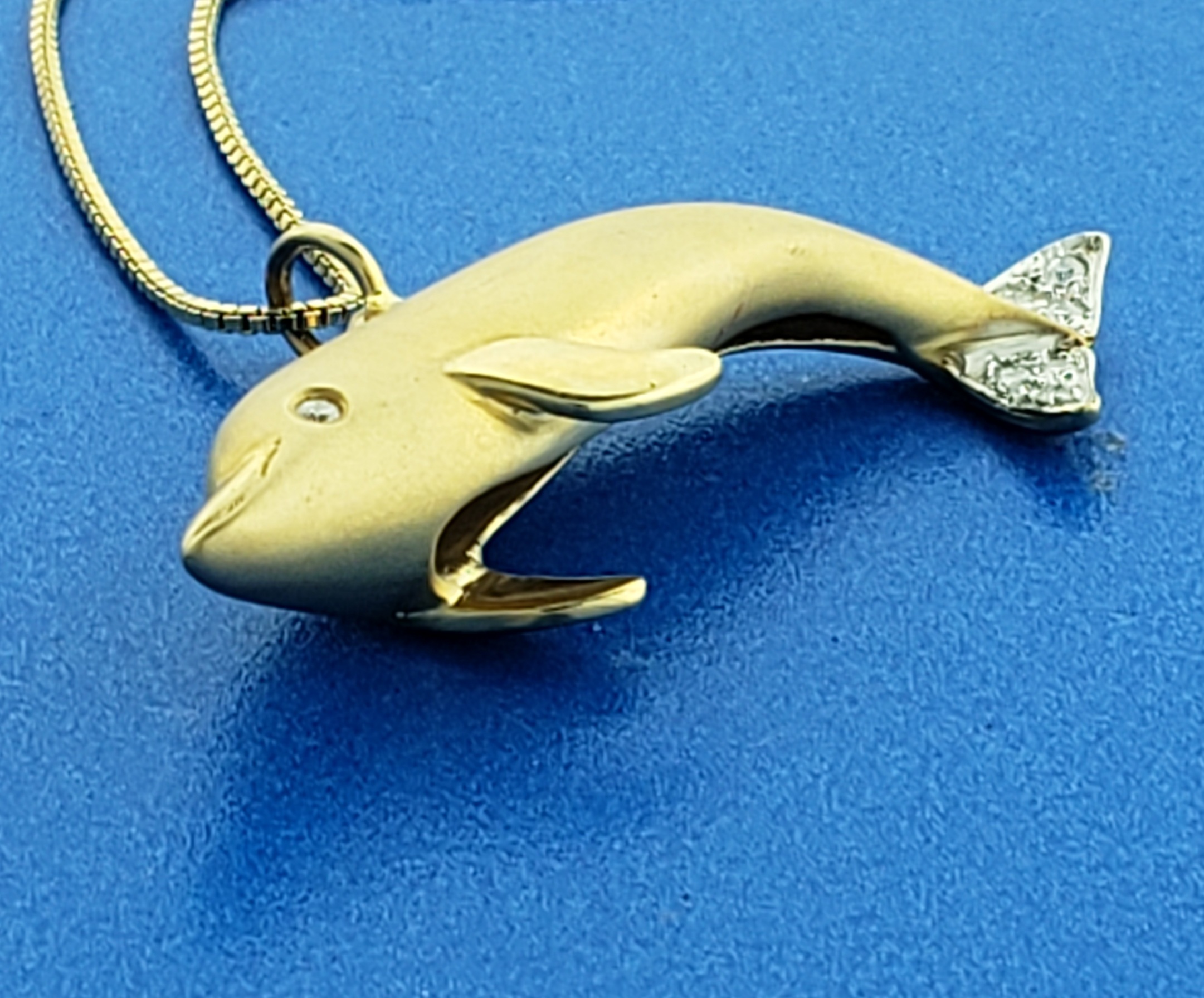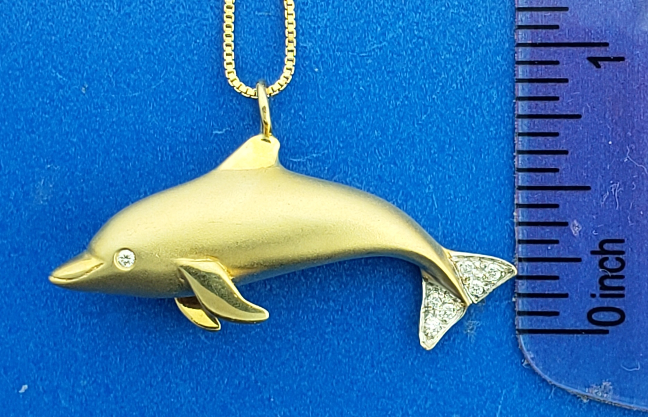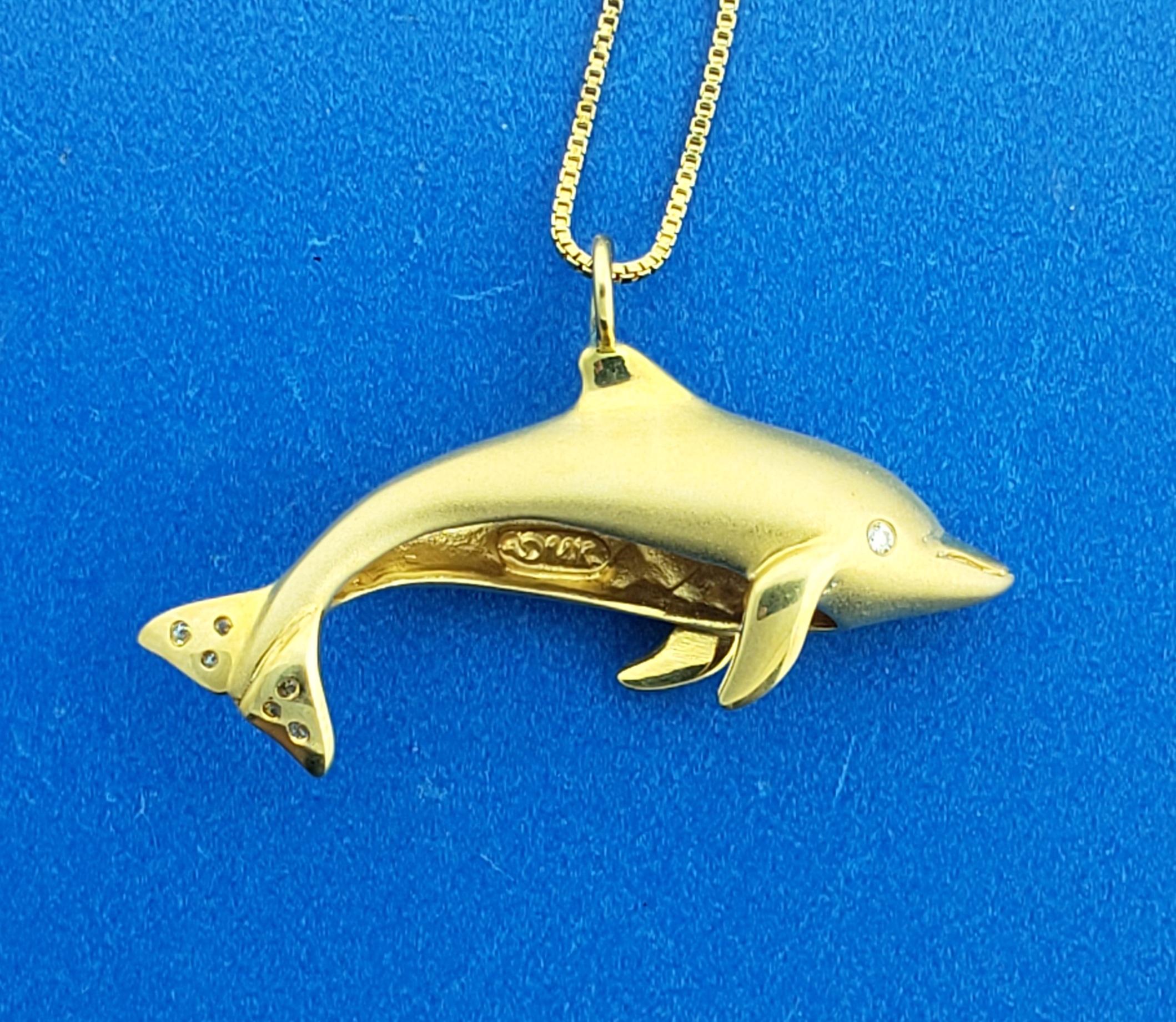 Steven Douglas Dolphin pendant with diamonds in the eye and pave’ diamonds on the fluke, delicate sand blast finish