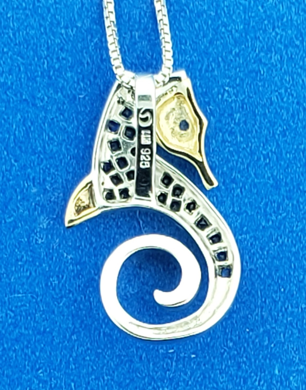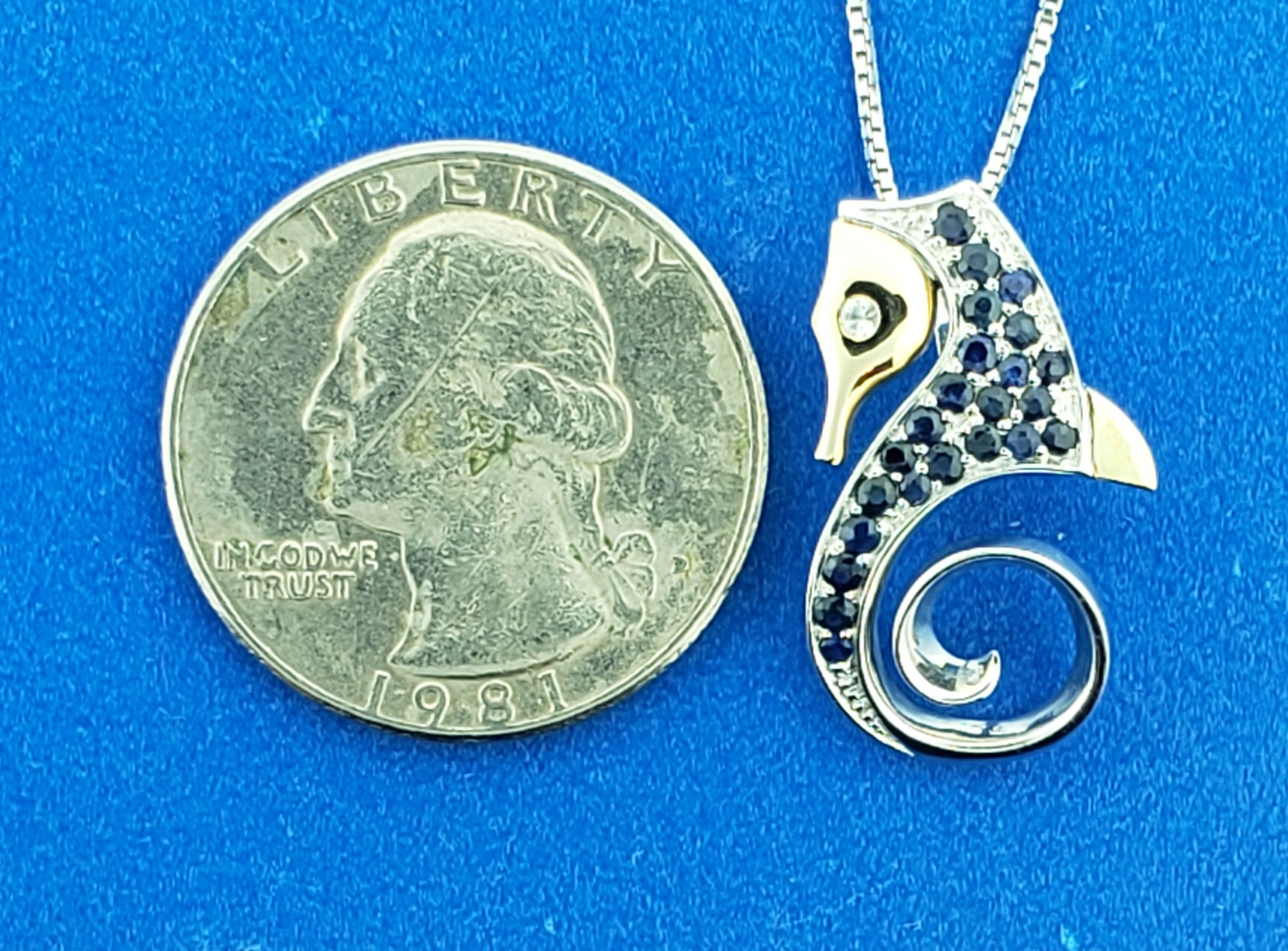 Steven Douglas Seahorse Pendant Rhodium Plated, the seahorse’s body has .45Ct Pave’ Set Blue Sapphires and a white sapphire in the eye.