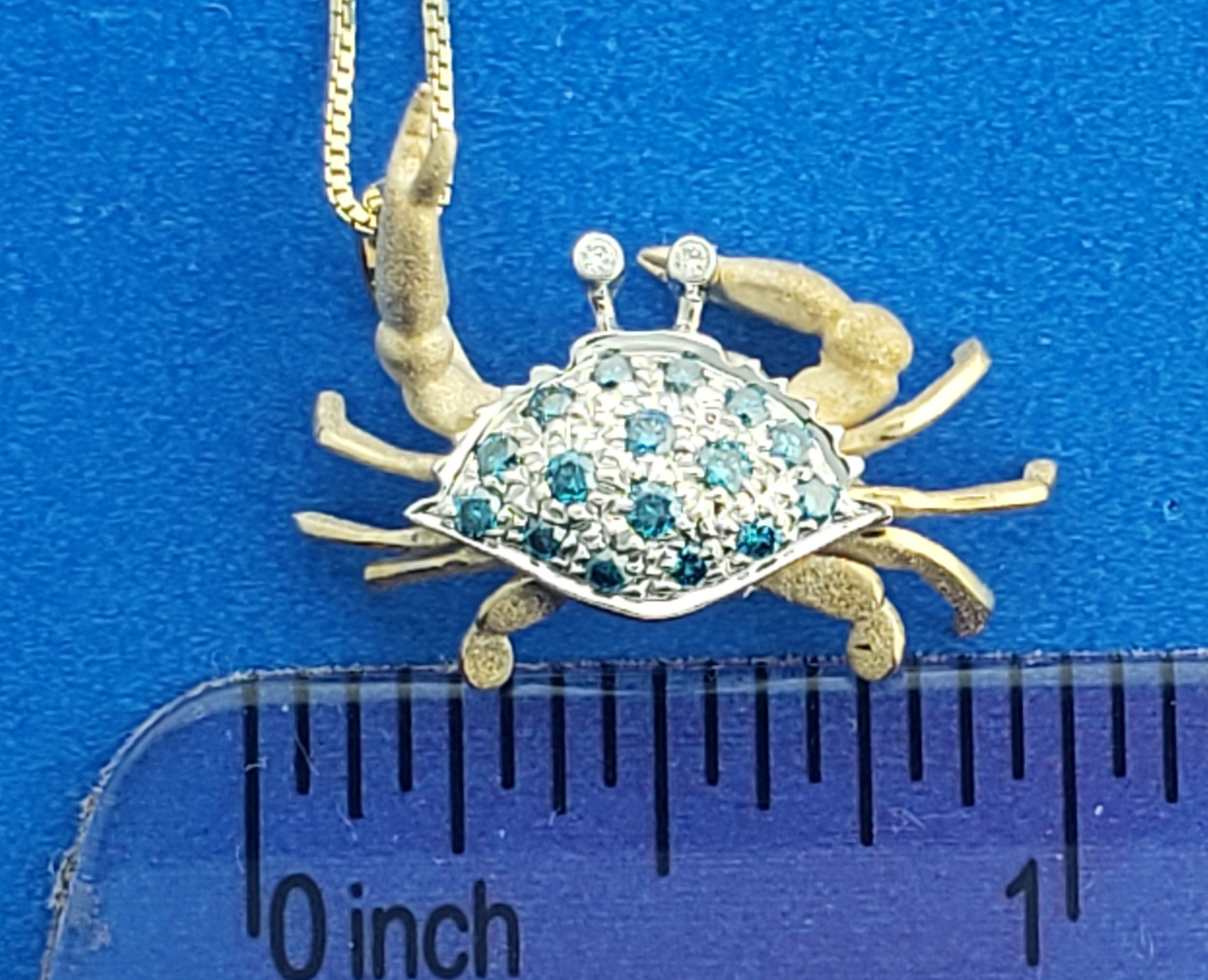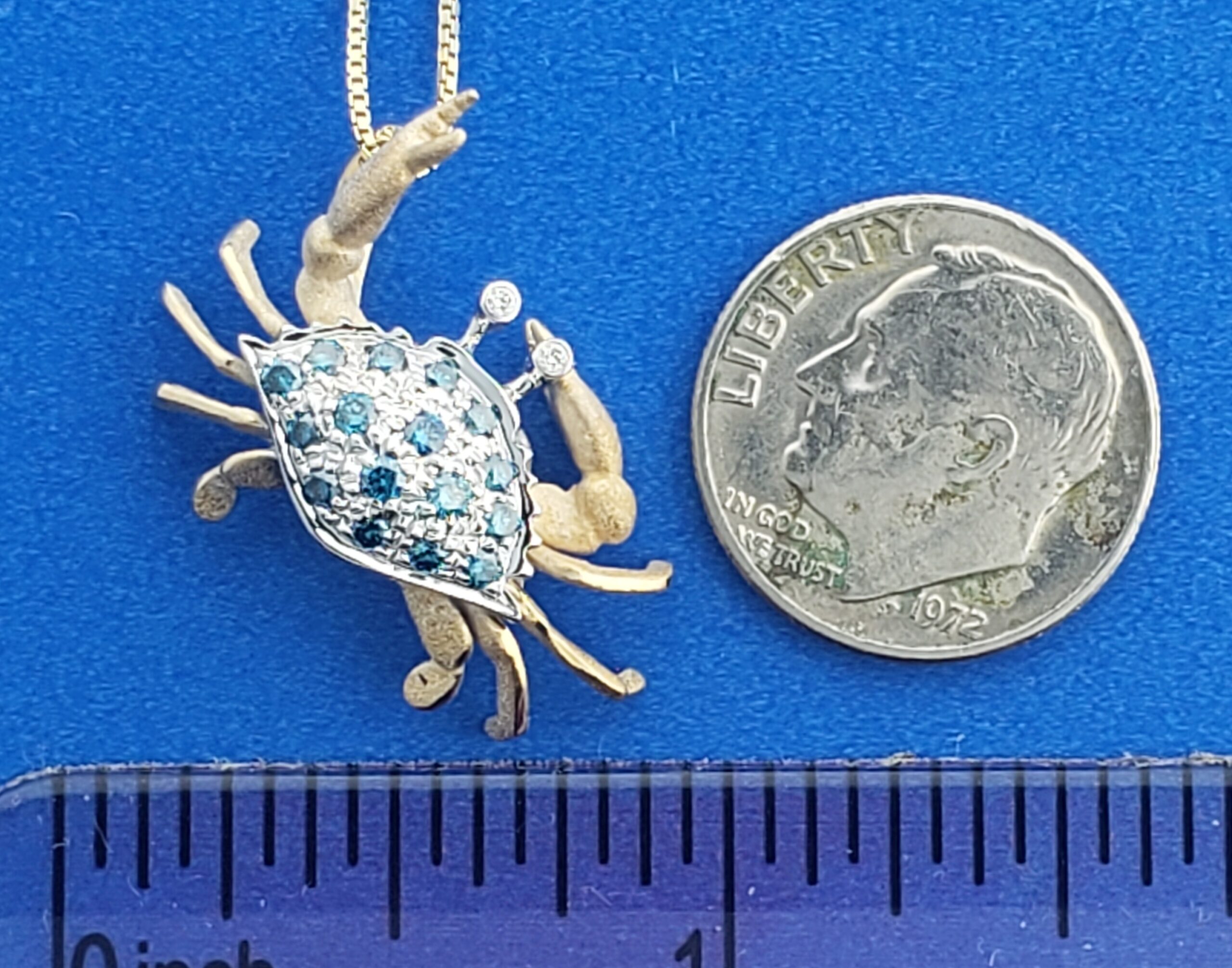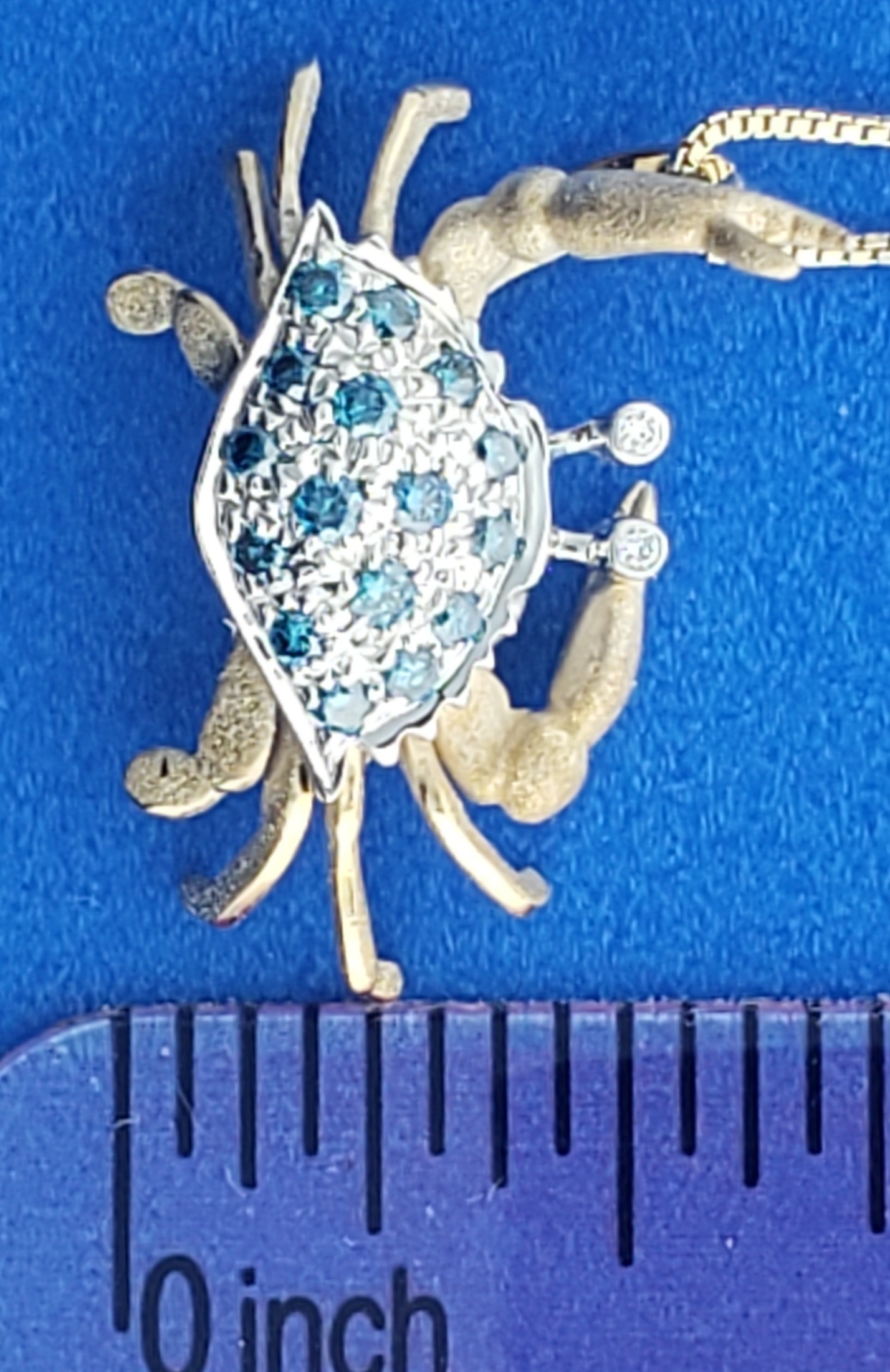 The crab is 14k 2-tone, all the claws are moveable, There are 16 brilliant bead set blue diamonds ..28ct twt. including 1 white diamond in each eye, .01ct twt.