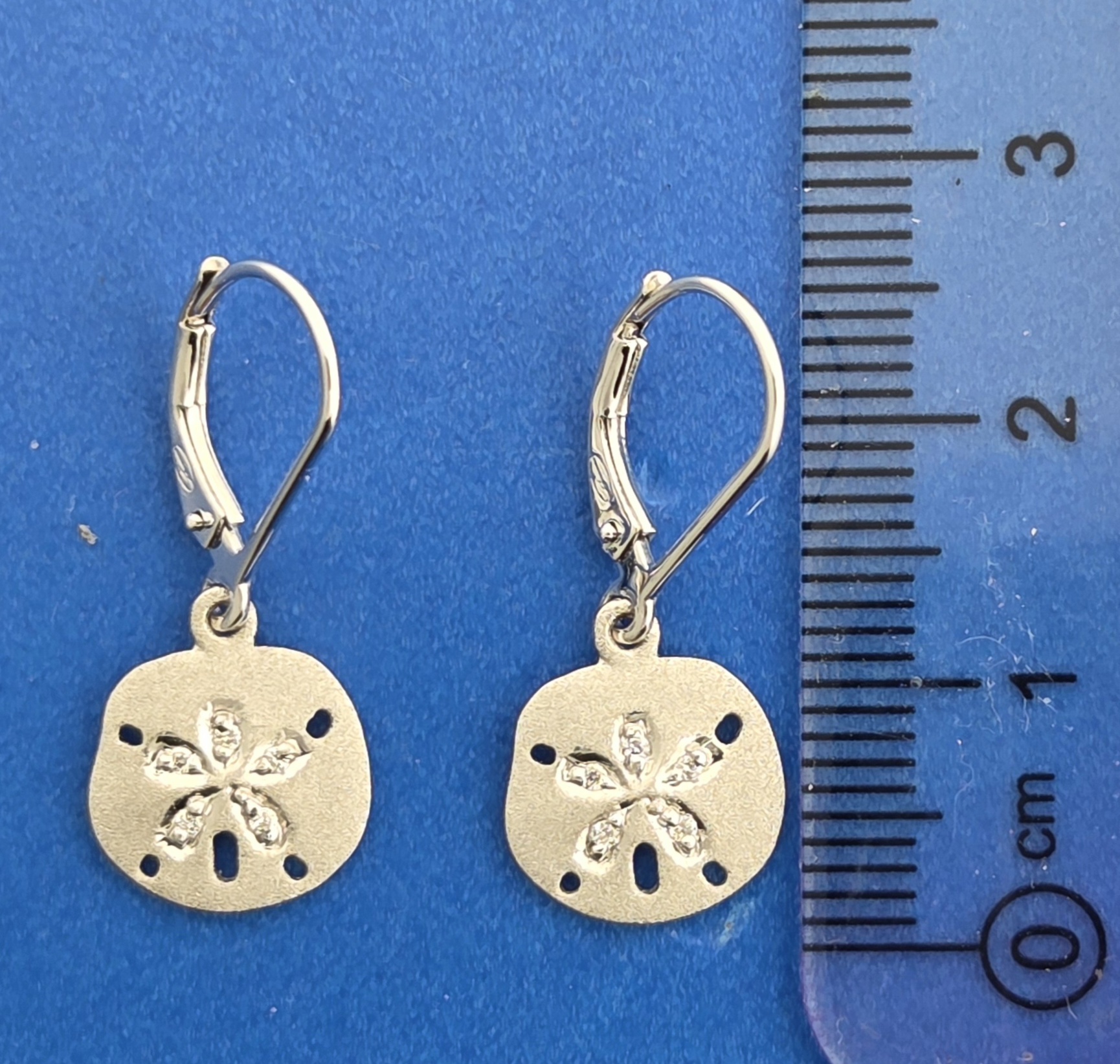 Denny Wong 14k white gold sand dollar dangle lever back earrings. Delicate sand blast finish, each sand dollar has 5 round brilliant diamonds set in the center, a total of 10 diamonds .05ct twt