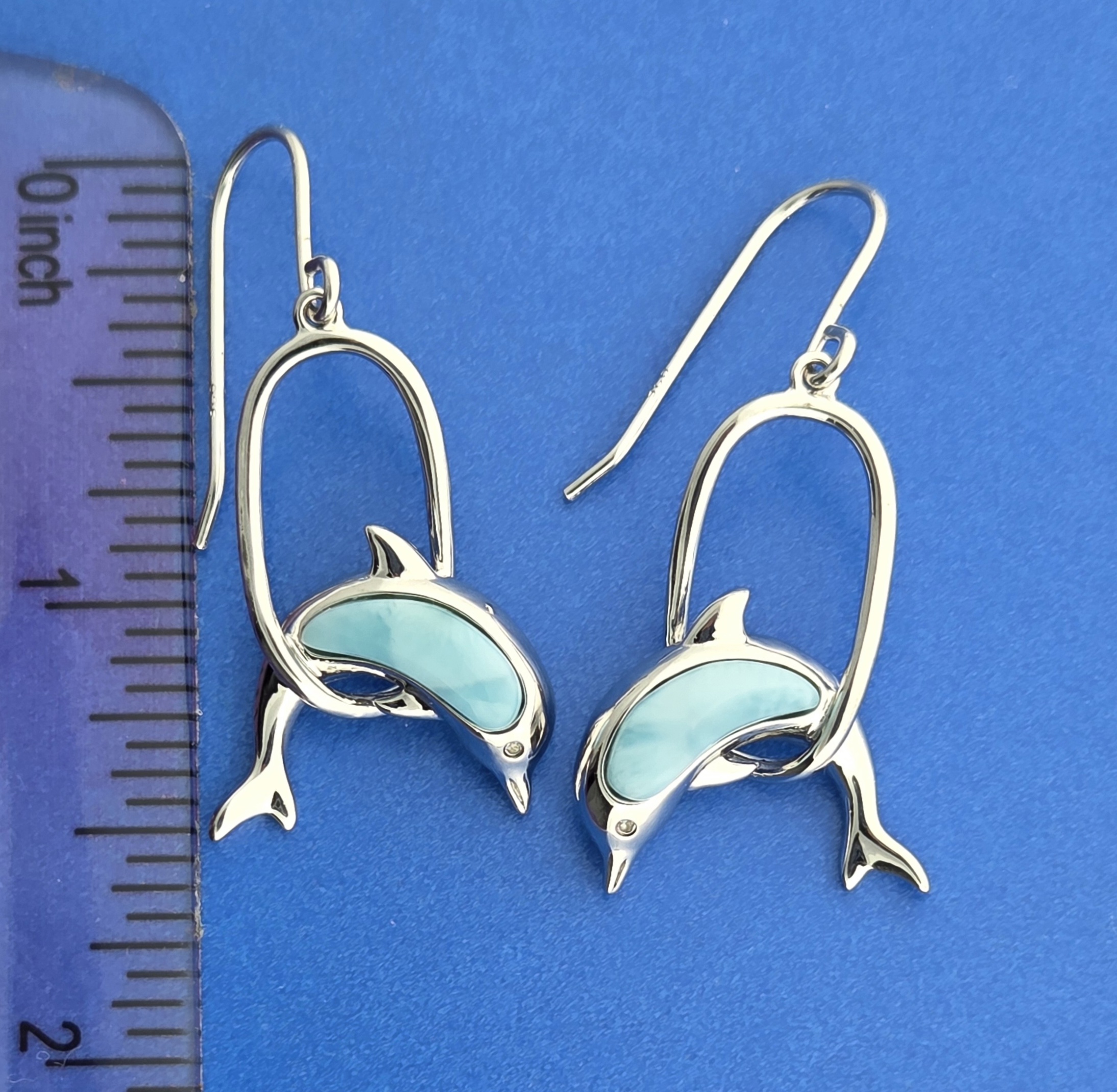 Alamea sterling silver dolphin dangle earrings with ocean blue Larimar. The dolphin is jumping through a hoop and has a genuine white Topaz eye; rhodium plated, on fishhook ear wires
