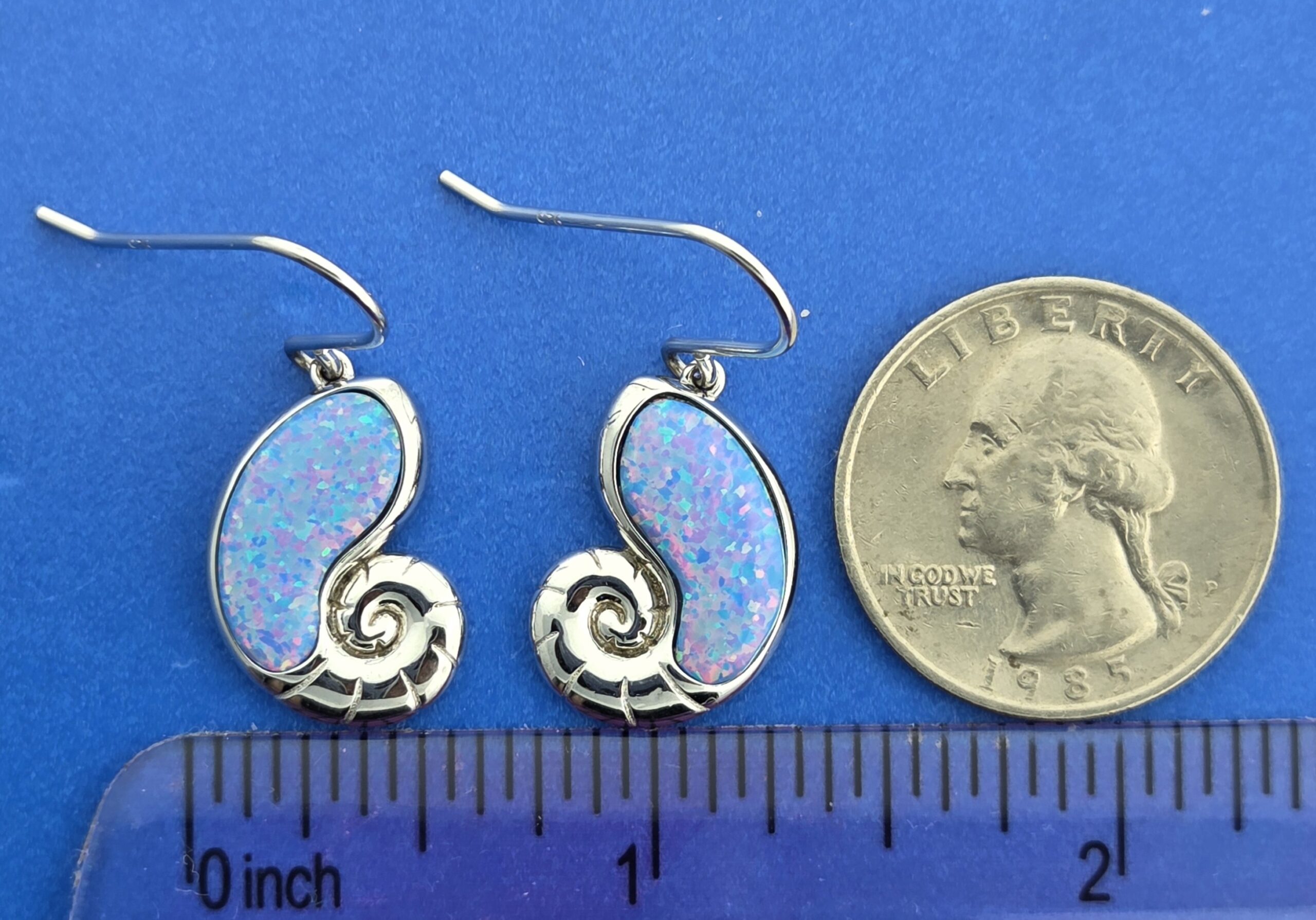 Alamea sterling silver Nautilus Shell Earrings made with lab created iridescent pink, red & blue opals, 21mm tall x 14mm wide x 32mm long including the ear wires