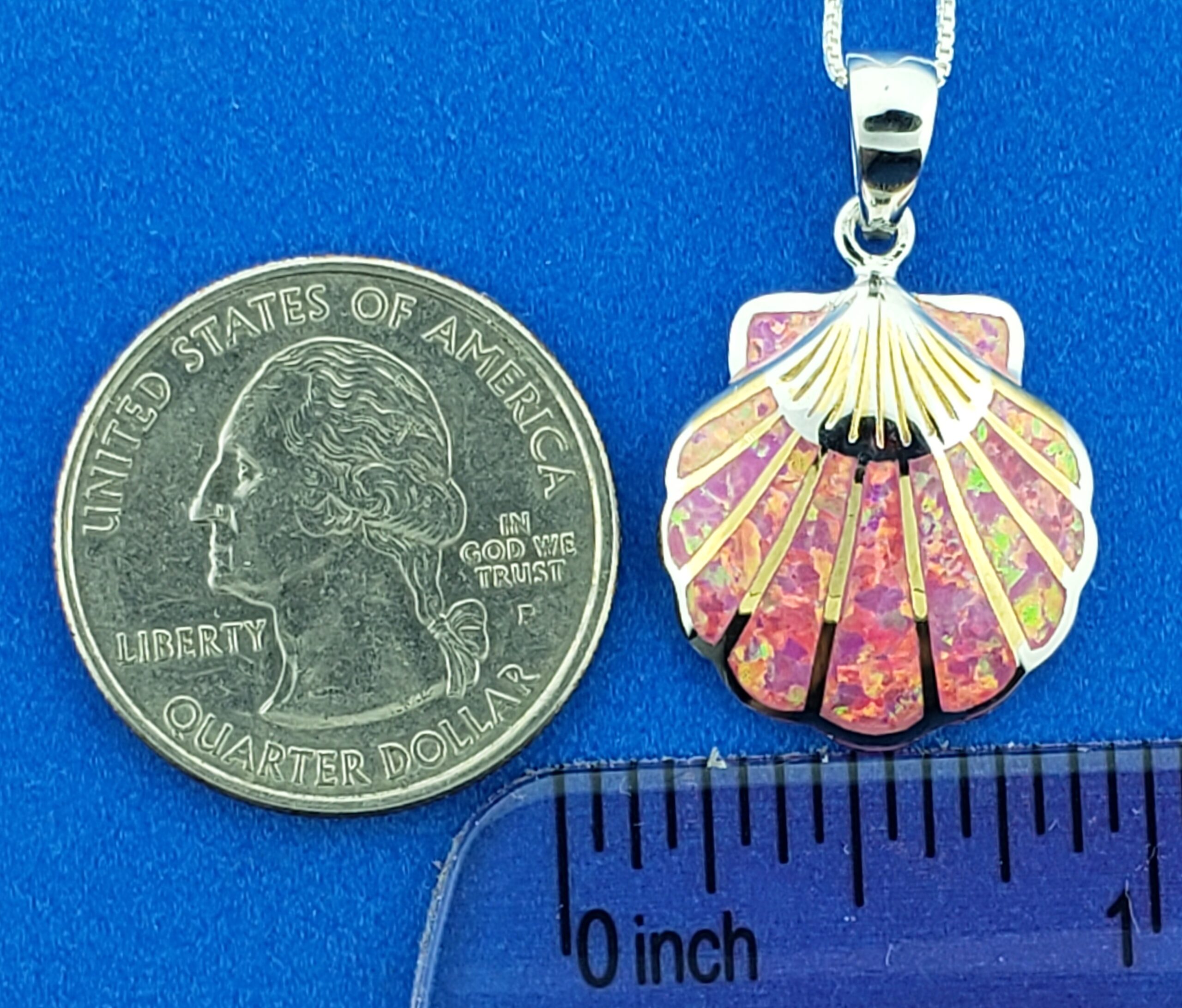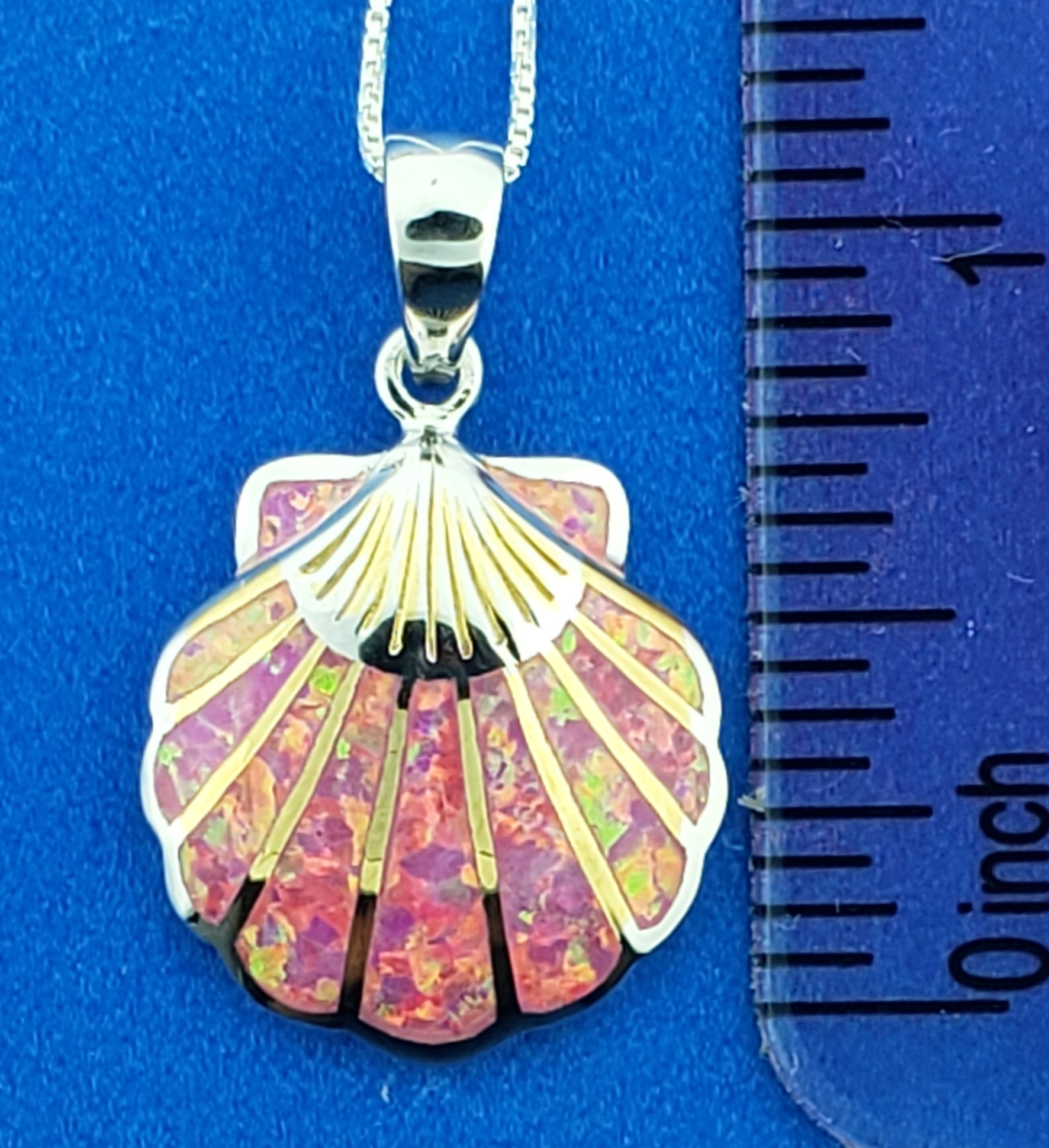 sterling silver scallop shell pendant, accented with 14k yellow gold and rhodium plating. Inlaid brilliant sparkling iridescent pink lab created opals.