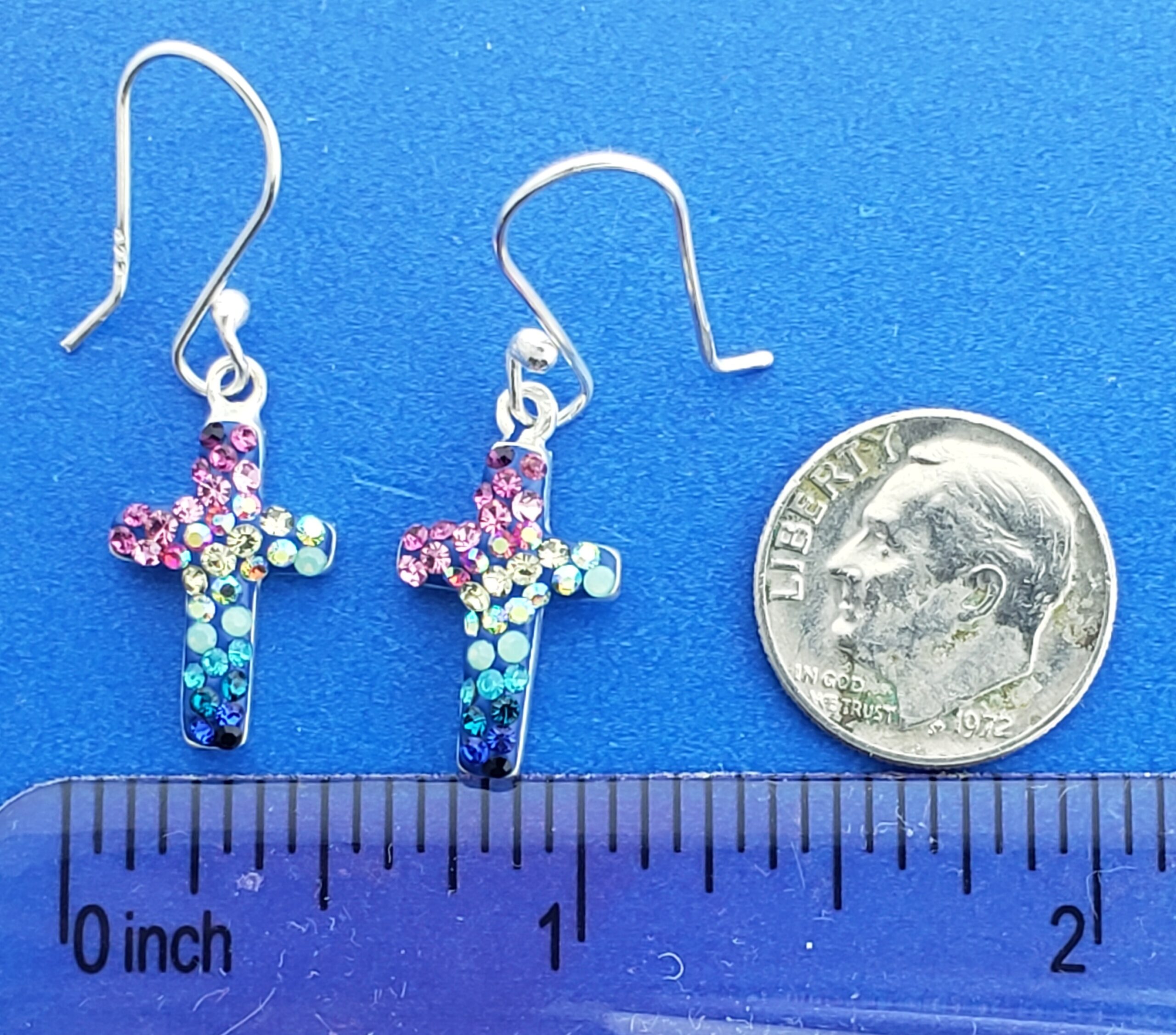 sterling silver cross dangle earrings, different colors of Austrian crystals