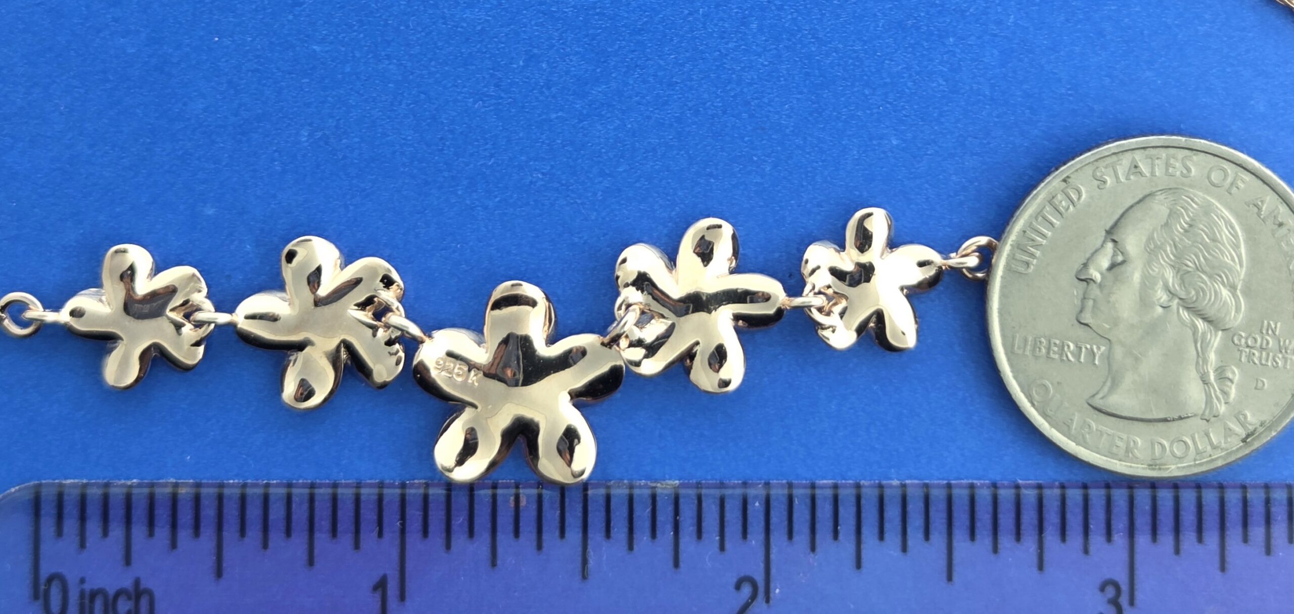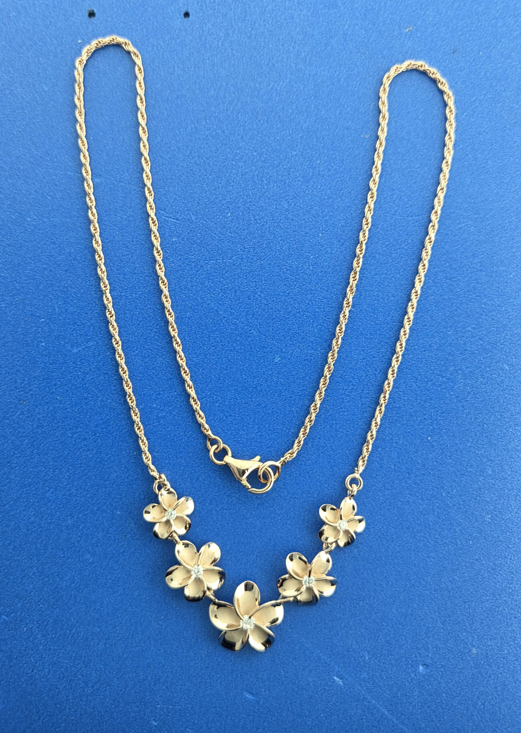 the plumerias are attached to a rose gold plated sterling silver 2mm rope chain, total length is 18″, plumerias measure 3/8″-5/8″ wide